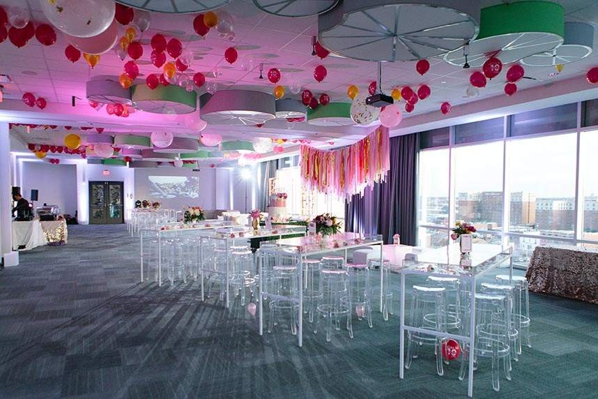 Every great party needs a host! The dedicated team at Aloft Hotel Downtown OKC stepped up and served as host venue and caterer for our birthday party. With over 9,000 feet of event space to utilize boasting gorgeous views of the OKC skyline, we knew this was the perfect place. Spanning the entire top floor of the hotel, the fun started as soon as you stepped off the elevators. Aloft Hotel Downtown OKC also catered the event and working with their creative chef and catering team was a dream. With a menu of mini chicken and waffles, a mac and cheese bar, build your own tacos and pulled pork sliders, our guests ate until their hearts were content.