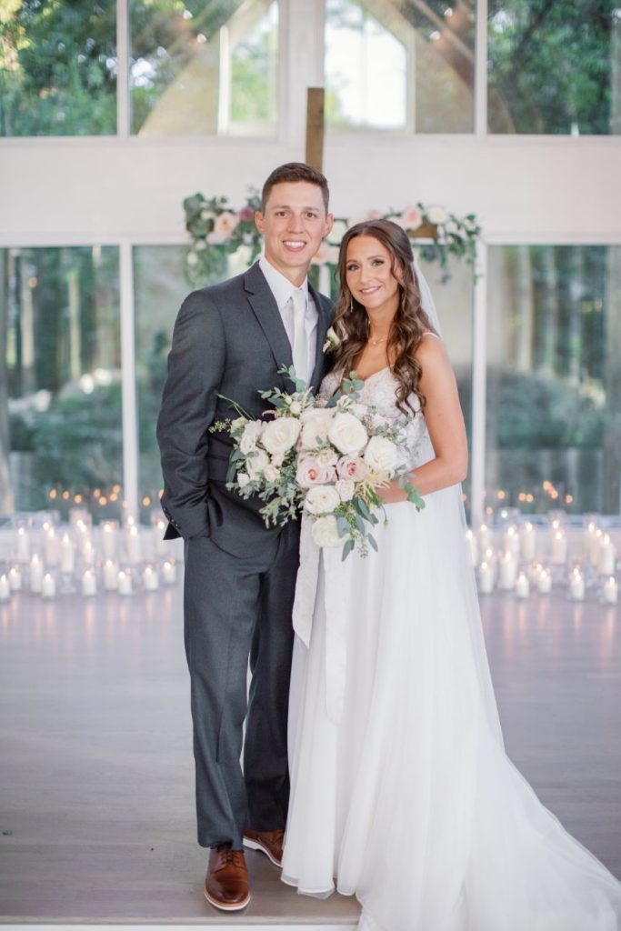 Flourishing florals from Robyn’s Flower Garden, light pinks details, and a chapel filled with an abundance of natural light – Brooklyn and Ryan’s wedding day is straight out of a fairytale! Brooklyn and Ryan met through their indoor soccer team, which they still play on together five years later. After their first soccer game, Ryan already had his eyes set on Brooklyn. He found out Brooklyn worked for a golf course and used it as an excuse to text her. It worked because Ryan got down on one knee in Arizona three years later on their anniversary. Soon after the reality of being engaged set in, the couple began planning their enchanting wedding at Glass Chapel. The couple’s breathtaking venue, with its floor-to-ceiling windows, created a truly magical place to say “I do.”