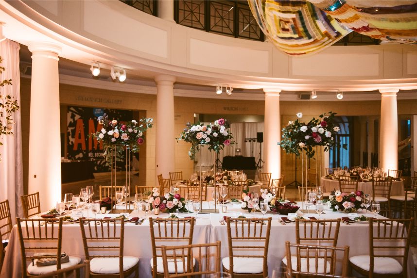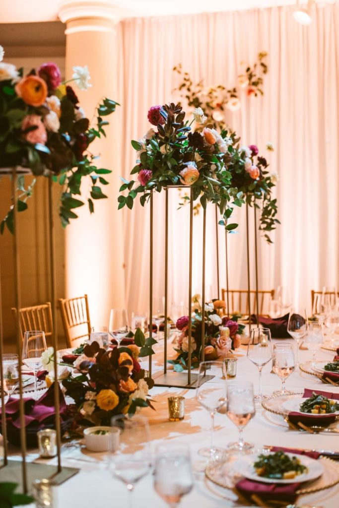 A dreamy museum ballroom was the perfect setting for Hannah Bernstein and Rob Blankenship’s candlelit fall wedding! Nicole Allen Events was their amazing planner who designed and coordinated all the details of their day – from the wine and jewel-tone floral arrangements by Anthousai to the gold foil wedding cake by Laurannae Baking Co. and plated dinner! Cheers to the happy couple!