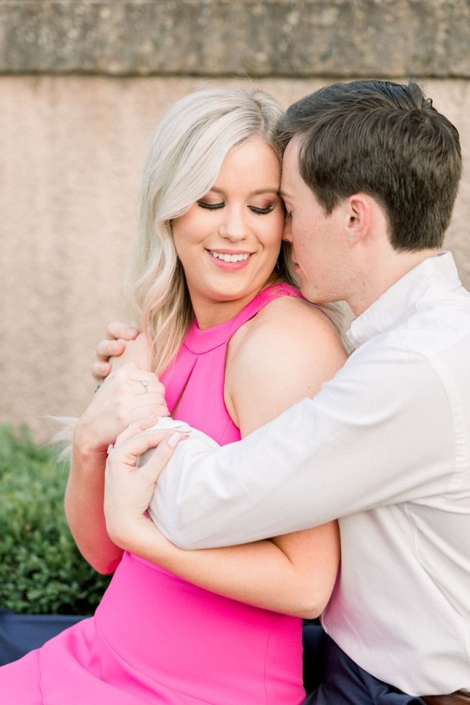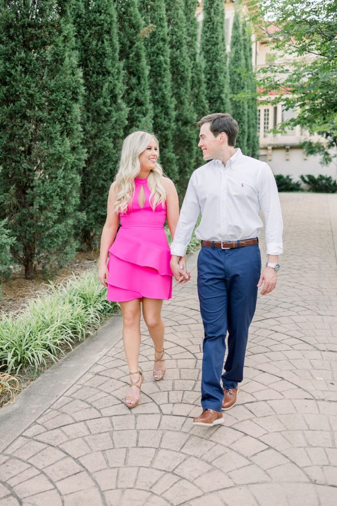 This sleek and chic engagement session captured by Andi Bravo Photography is so luxe and classy, the Philbrook Museum of Art served as the perfect backdrop for a gorgeously elegant gallery! MacKenzie and Colt’s story first began when they crossed paths through a mutual friend while attending the University of Oklahoma. After some talking, the pair discovered they had actually lived just ten minutes from each other and had attended rival high schools while growing up, yet never knew each other! All in good timing, though, the two are knee-deep in nuptial planning and will be tying the knot in an uptown, classy wedding in February of 2021. MacKenzie and Colt say their plans involve a formal ceremony at The Mayo Hotel in shades of deep red, light pink, and ivory followed by a fun-filled reception accented by live music from Royal Dukes Band! Though she is excited about the live entertainment as well as having Amy Lee Illustrations on-site creating their custom wedding painting, MacKenzie says she is most excited about her bridal attire. “One of my favorite details is my dress!” MacKenzie says. “It’s something that fits my style and I can’t wait to get to wear it!” We love nothing more than a wedding gown that makes a statement while encompassing a bride’s personality so we can’t wait to see this dress, these gorgeous wedding details, and more in their upcoming wedding at The Mayo Hotel. Keep scrolling to see Andi Bravo Photography‘s skills in action in this ultra chic engagement session and read on to hear the soon-to-be bride’s oh-so-sweet story about how he popped the question on the picturesque rooftop of The Capitol View Event Center! Cheers to MacKenzie and Colt!