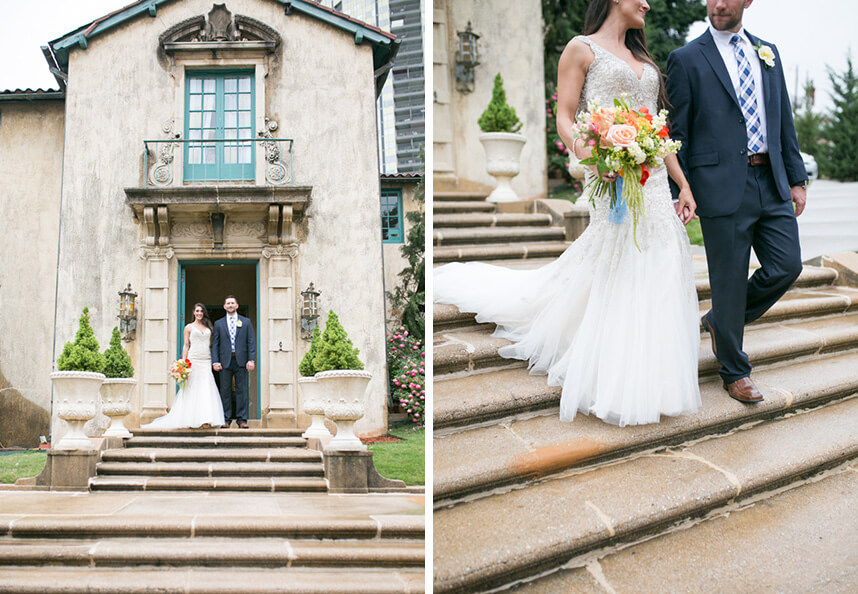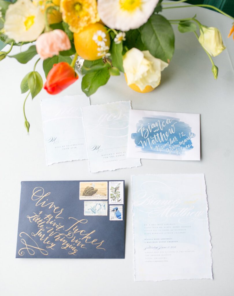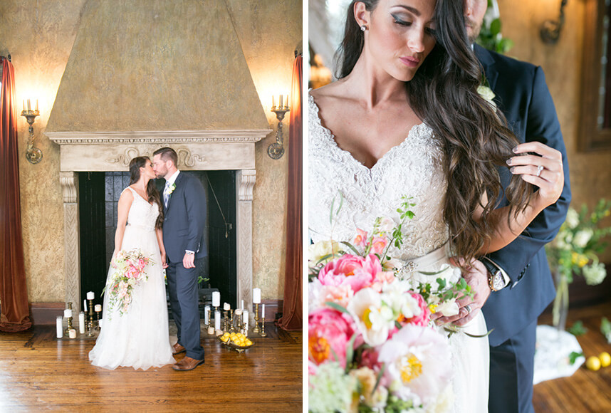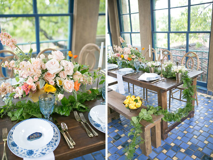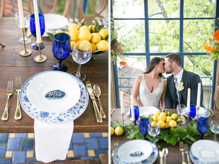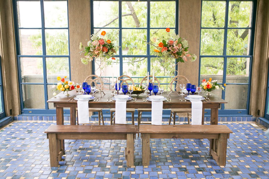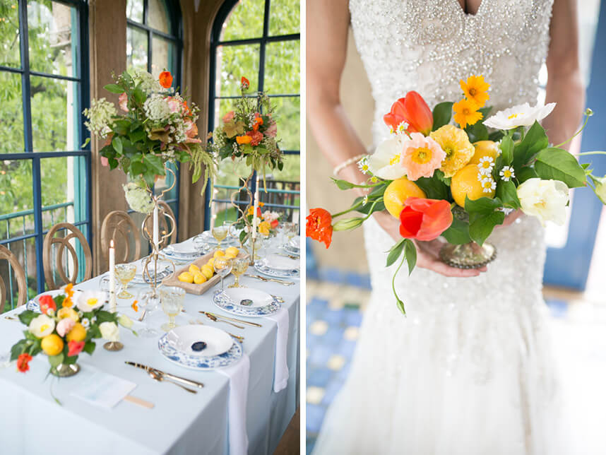 Doesn’t this citrus wedding inspiration shoot just make you feel so happy?! We can’t get over how bright and lovely this shoot captured by Jessica Tucker Photography is! With a summery color palette filled with soft blues, warm oranges, peaches and yellows, these hues are perfect for summer! Not to mention how perfect the historic Dresser Mansion was for the backdrop! Atherial Makeup created the perfect bridal look for the model bride and bridesmaids. With breathtaking bouquets and centerpieces and exquisite tabletop décor and rentals from Party Pro Rents and Kahoy Studios, this shoot radiates beauty, fun and simplicity!