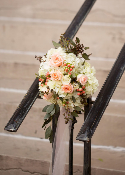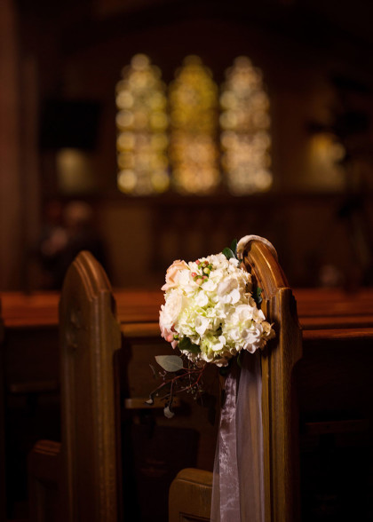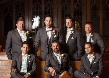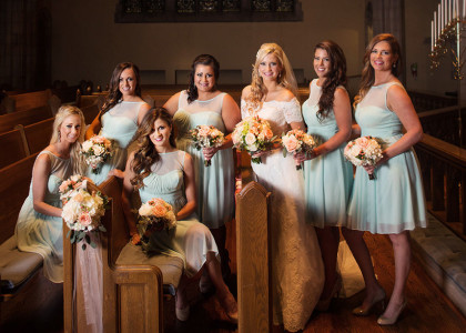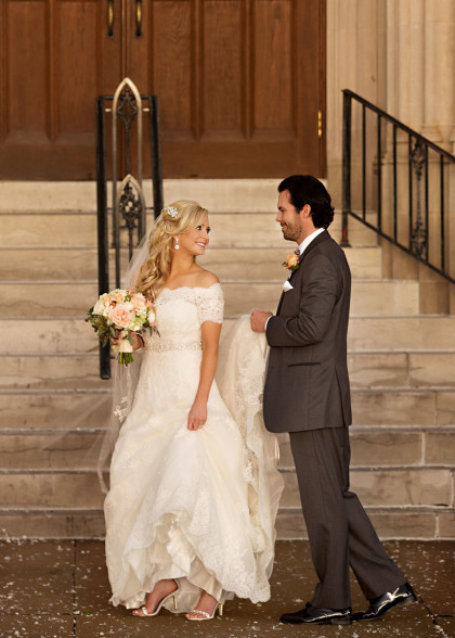 The day arrived in grand fashion. Dear bridesmaids were in flowy mint dresses, polished groomsmen in gray tuxedos, adorable flower girls in tulle and the handsome ring bearer was at the ready. Whitney shared a prayer with her bridesmaids just before walking down the aisle. Escorted by her father, Whitney wore a Pronovias Letour off-shoulder scalloped rebrode lace gown. Embellished with silk buttons lining the back, sparkling sequins and a Swarovski crystal belt adorning her waist. She wore a cathedral-length scalloped veil with matching lace, accents and a crystal hair comb from her mother. She accessorized with Swarovski crystal drop earrings, and platinum and diamond accent pieces. An heirloom broach from her grandmother’s collection adorned her bridal bouquet that featured peach and ivory Vendela roses, white peonies, freesia, hydrangeas, peach hypericum, Queen Anne’s lace and seeded eucalyptus.