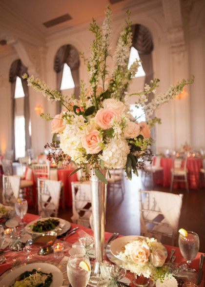 The ceremony was followed by a cocktail party in the Grand Hall at The Mayo where guests awaited Whitney and Keith’s arrival. The celebration moved to the Crystal Ballroom where guests dined on filet mignon, pecan-crusted chicken and risotto atop beautiful tablescapes. Treasured traditions, memorable speeches, and champagne toasts completed the perfect day as the newlyweds danced the night away with cherished family and friends.