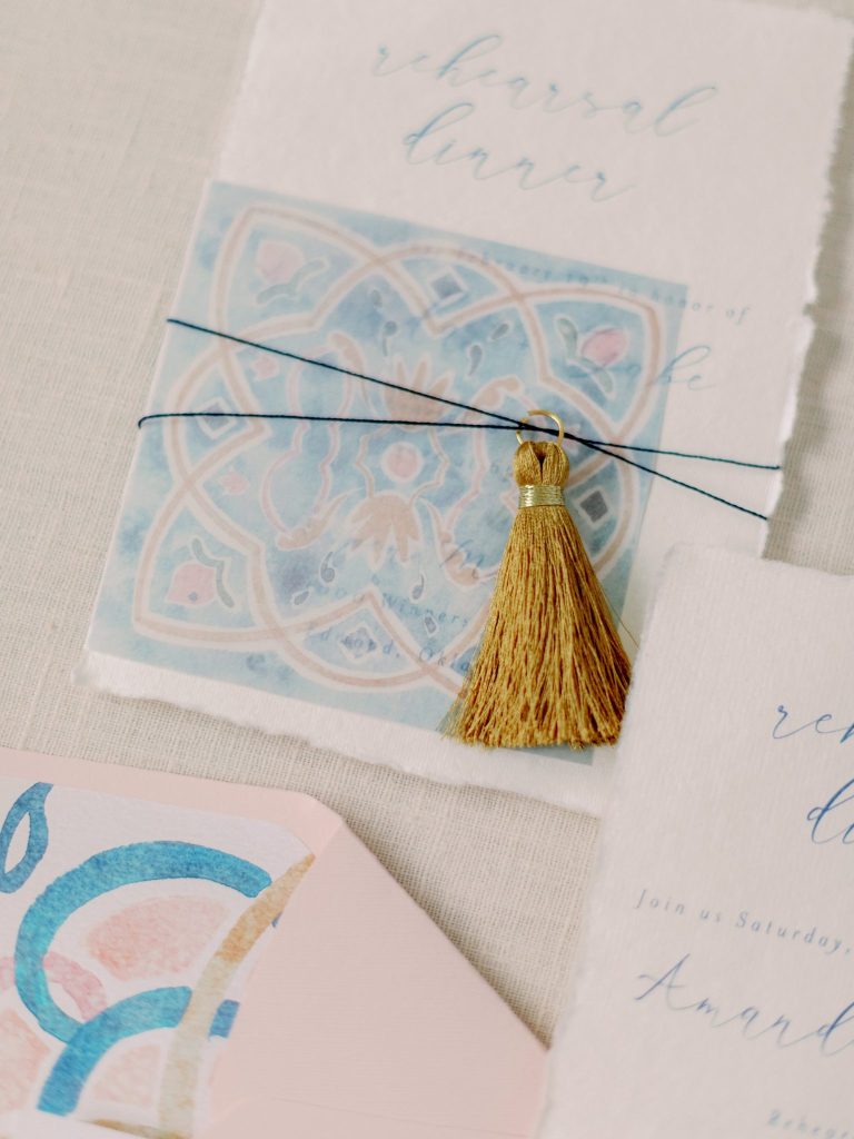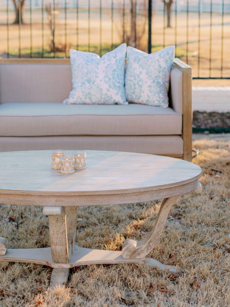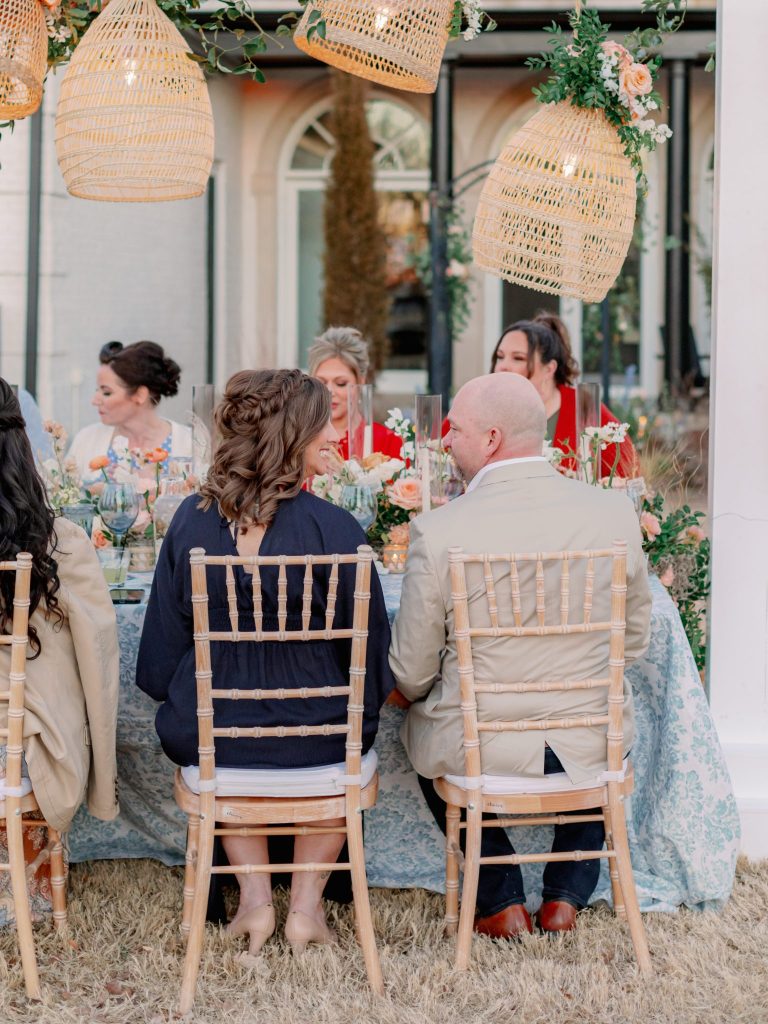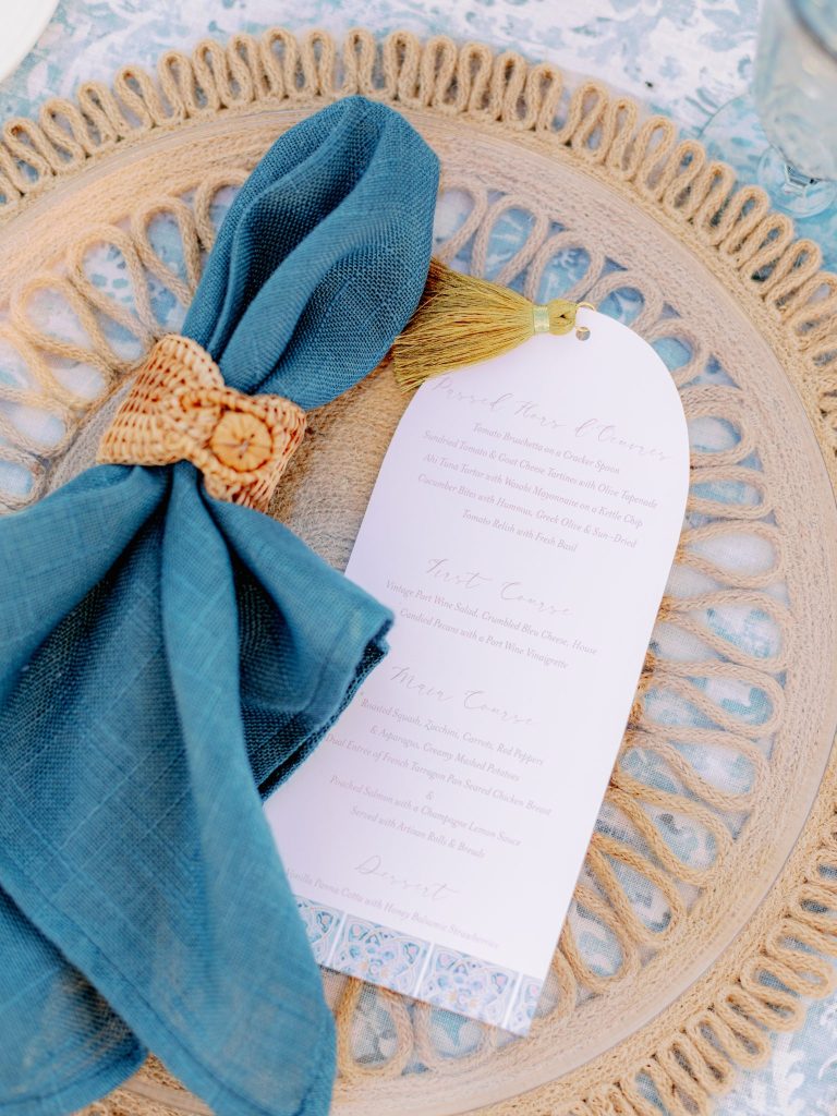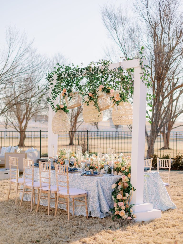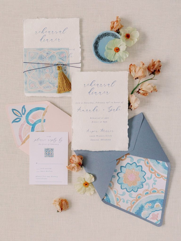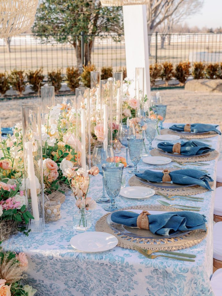 Amanda and Gabriel brought the sea breeze to the Oklahoma plains with their coastal-inspired rehearsal dinner at Aspen Ranch. On a rare 60-degree February evening, Aspen Ranch’s 160 serene acres provided the perfect backdrop for a romantic dinner. Inspired by the couple’s love for the coast, Blue Chalk Events weaved components of luxe coastal beauty into the entire design. The use of natural Chiavari chairs, jute slate blue napkins, woven rattan napkin holders, and patterned linens, all from Mood Party Rentals, provided the elements for a coastal chic rehearsal dinner! In addition, the coastal-inspired details continued within the invitation suites from Chirps & Cheers by using cotton paper and incorporating a vellum overlay with a Coastal pattern and tassel. Finally, a chic coastal soiree is not complete without coastal-inspired fashion! The darling bride, Amanda, opted out of a traditional white dress and instead radiated coastal bridal chic with a blue linen dress and bridal braid from Hayley Hall Hair. Don’t miss more coastal-inspired details below captured by the talented Kelsey LaNae Photography