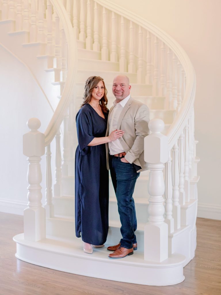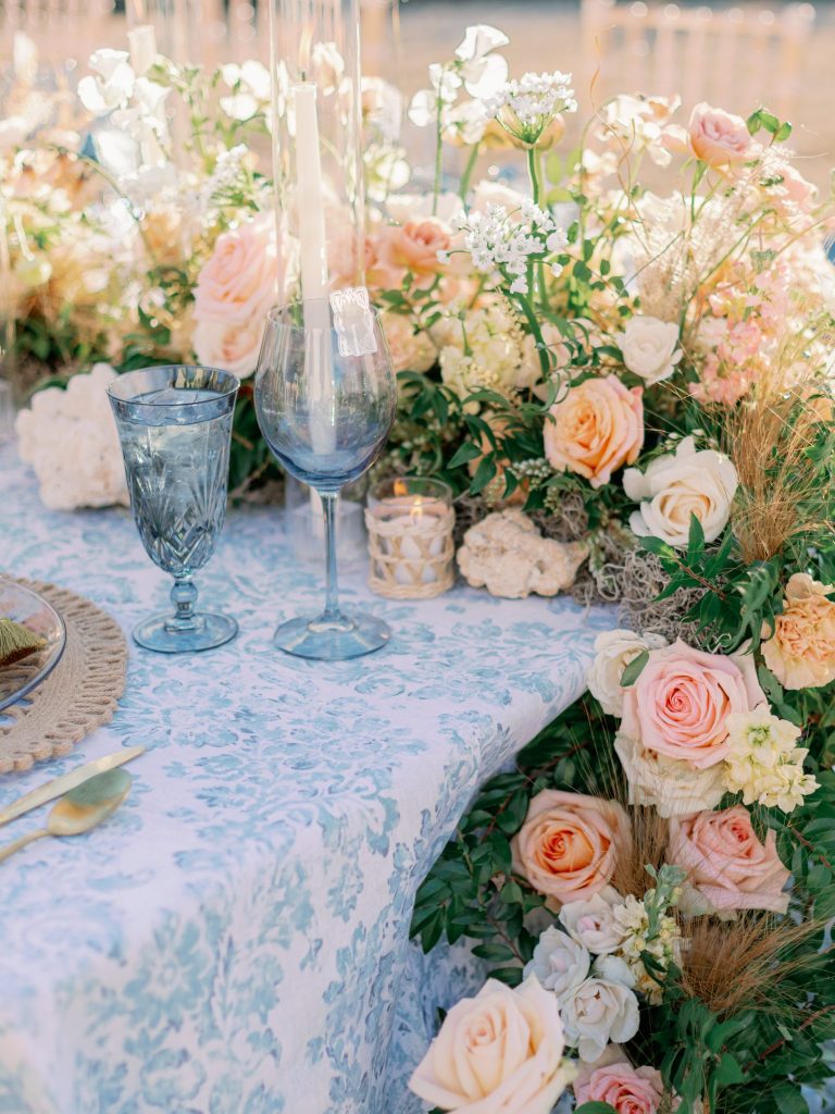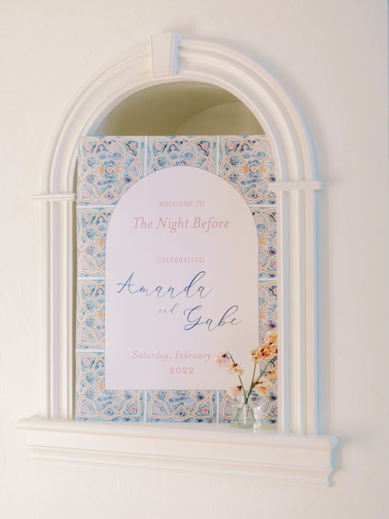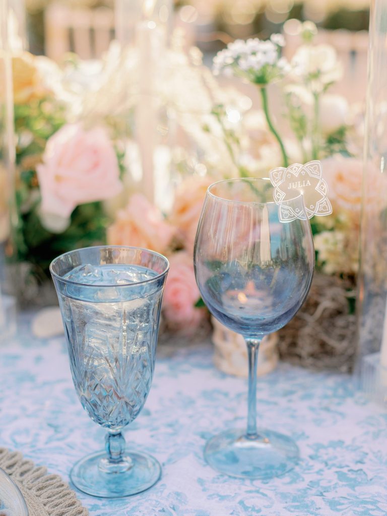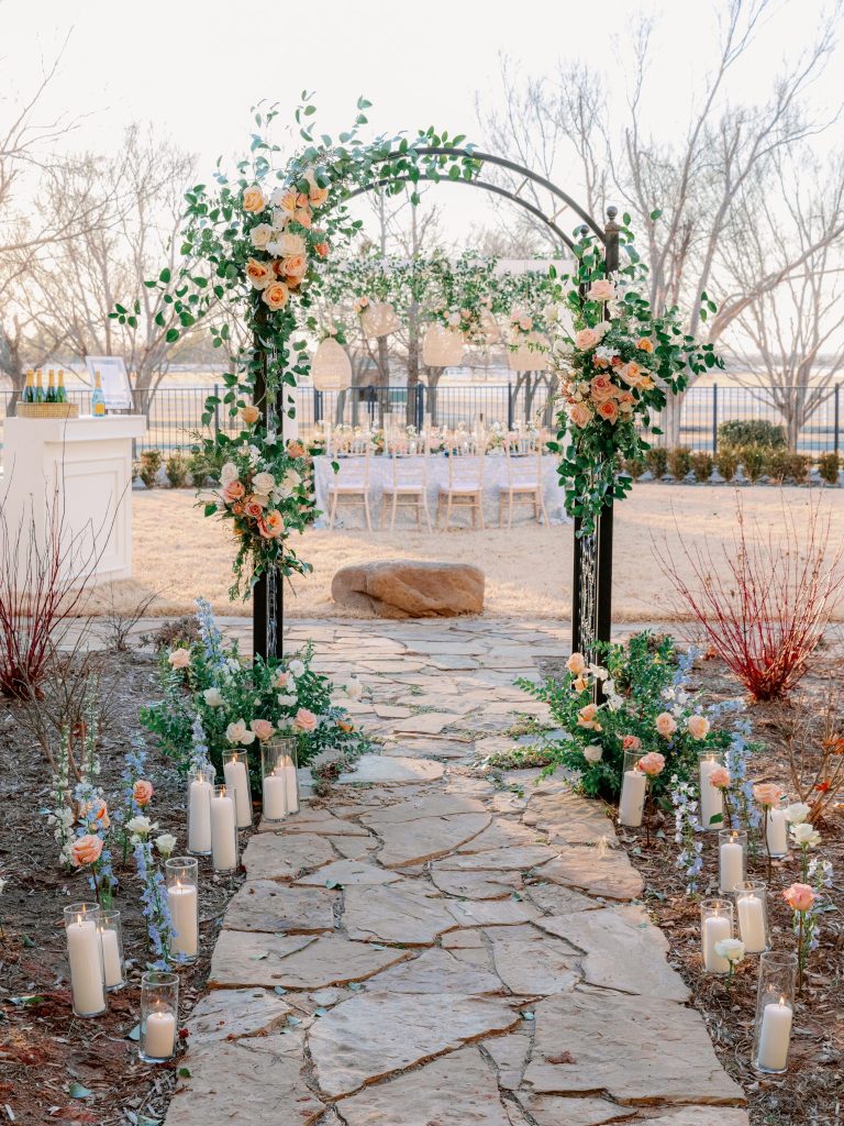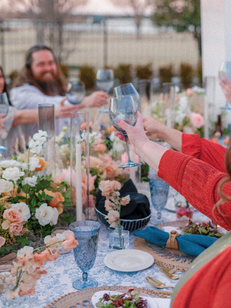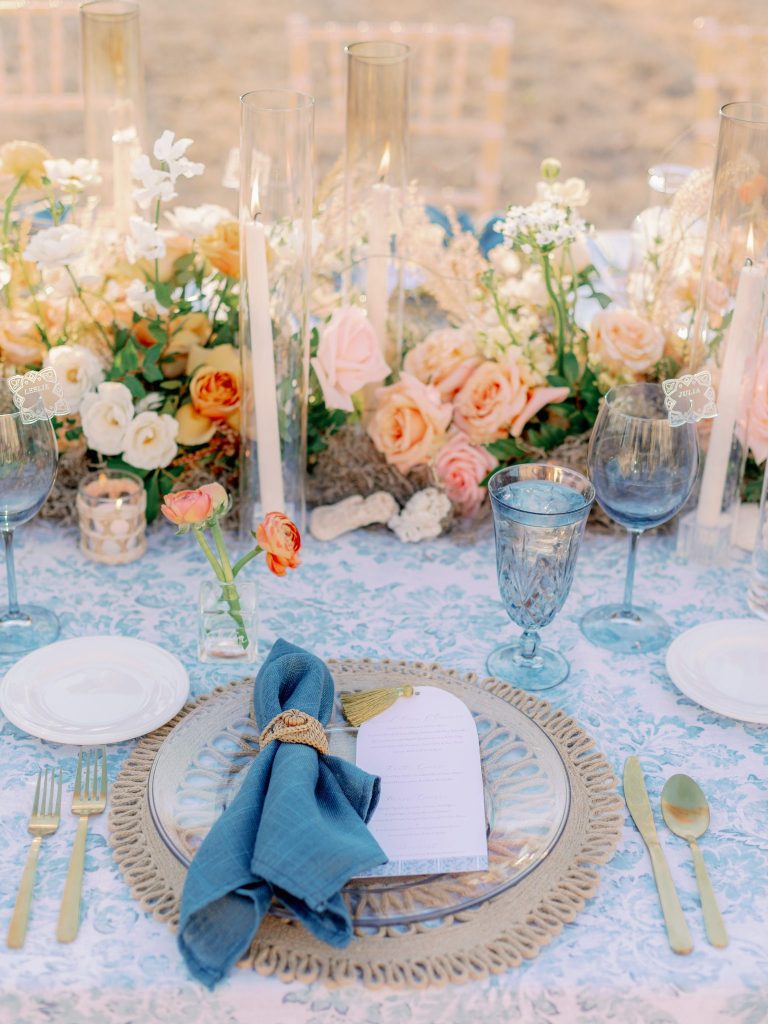 Amanda and Gabriel brought the sea breeze to the Oklahoma plains with their coastal-inspired rehearsal dinner at Aspen Ranch. On a rare 60-degree February evening, Aspen Ranch’s 160 serene acres provided the perfect backdrop for a romantic dinner. Inspired by the couple’s love for the coast, Blue Chalk Events weaved components of luxe coastal beauty into the entire design. The use of natural Chiavari chairs, jute slate blue napkins, woven rattan napkin holders, and patterned linens, all from Mood Party Rentals, provided the elements for a coastal chic rehearsal dinner! In addition, the coastal-inspired details continued within the invitation suites from Chirps & Cheers by using cotton paper and incorporating a vellum overlay with a Coastal pattern and tassel. Finally, a chic coastal soiree is not complete without coastal-inspired fashion! The darling bride, Amanda, opted out of a traditional white dress and instead radiated coastal bridal chic with a blue linen dress and bridal braid from Hayley Hall Hair. Don’t miss more coastal-inspired details below captured by the talented Kelsey LaNae Photography