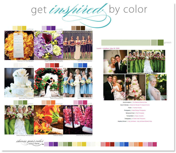 Brides of Oklahoma is so excited to announce a new feature!! If you’re either looking for the perfect wedding day colors, or searching for inspiration around hues you’ve already chosen, you’ll be completely blown away at our new color inspiration section on our website. Simply click here to get started. All of the beautiful weddings we’ve featured in our magazine are at your fingertips! With a click of the mouse you’ll be able to find your perfect palette and see all of the amazing wedding day details of real Oklahoma brides! The wedding pros that created these extraordinary events are also only a click away. You’ll notice above that we’ve displayed green in honor of St. Patrick’s Day. We hope you enjoy this amazing new colorful way to plan your special day! Ciao!