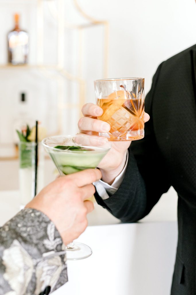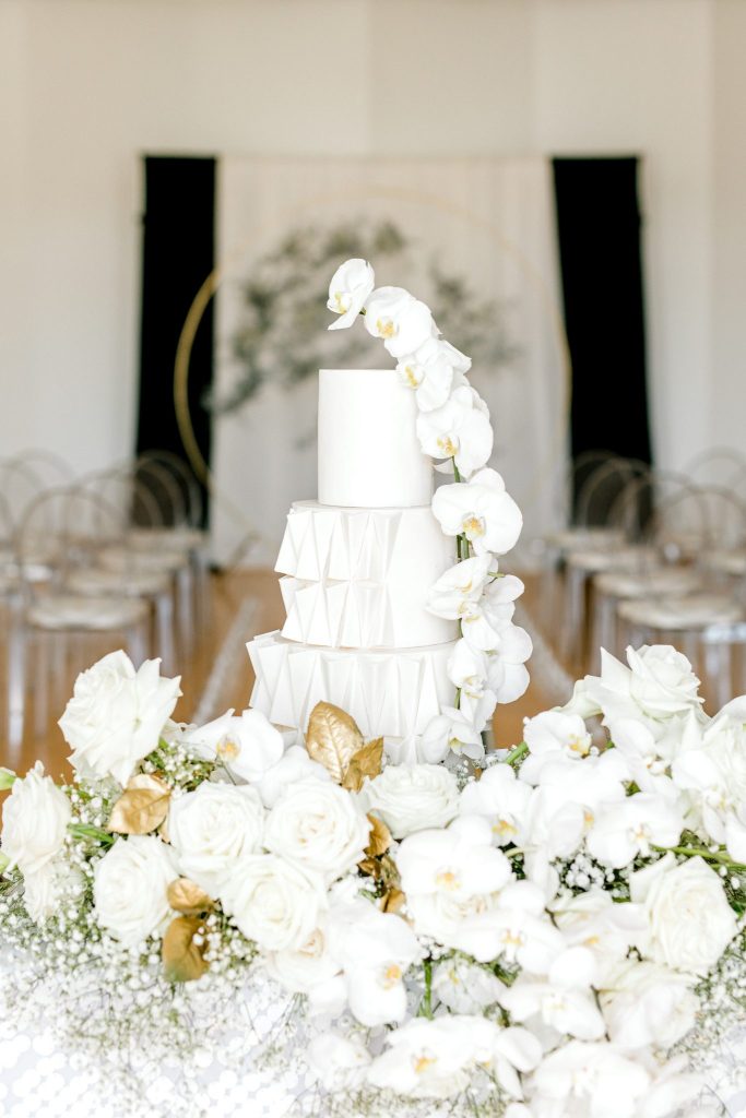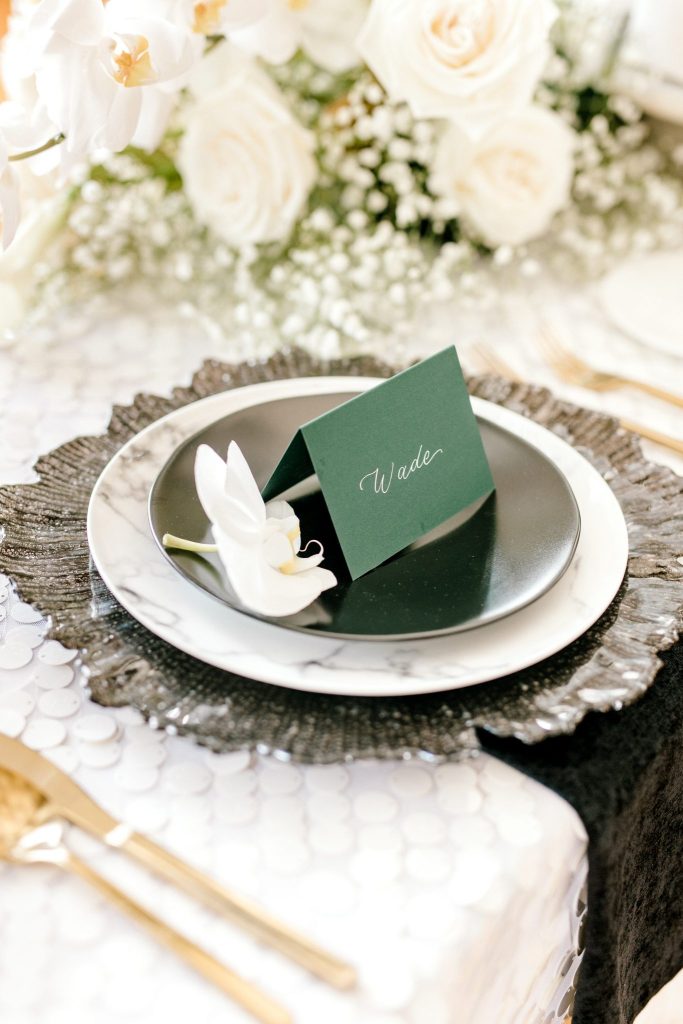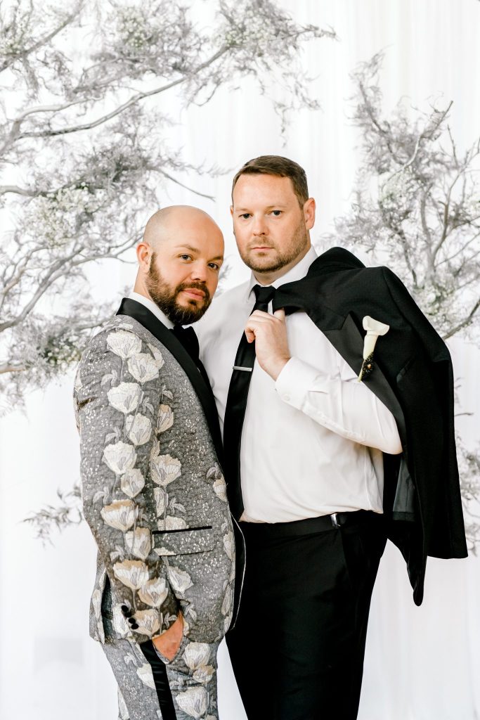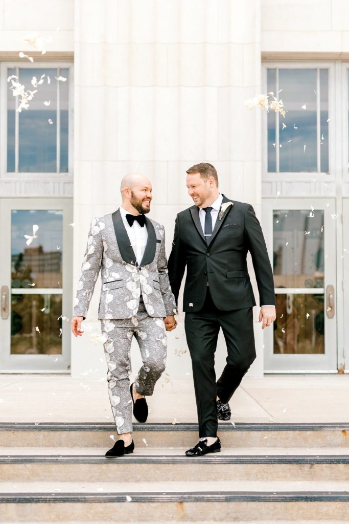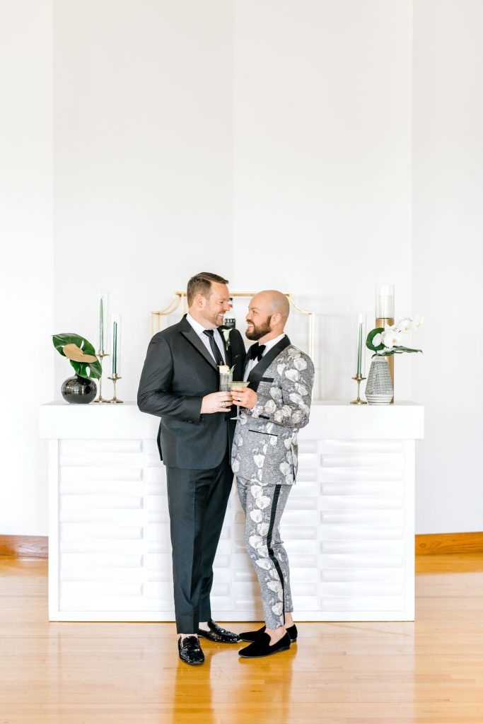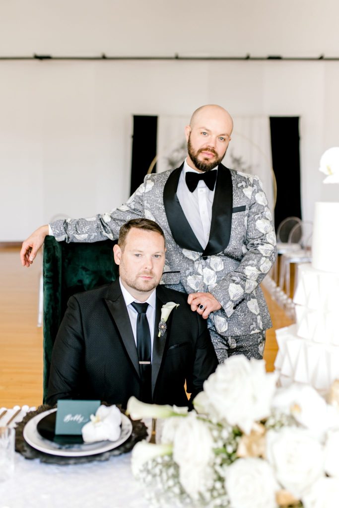 The Civic Center Music Hall is home to dazzling Art Deco architecture and the perfect backdrop for this contemporary and modern styled shoot. The combined color palette of black, white and forest green is all things contemporary, modern and oh-so-chic! Meg Rose Photography captured all the dazzling elements of the day. For example, the show-stopping ceremony scene. The ceremony featured a candlelit aisle with a gold circle backdrop filled with silver branches. We love the branches used in the backdrop that add a unique feature to the ceremony scene—the beautiful decor from Marianne’s Rentals combined the Art Deco inspiration with a contemporary and modern twist. The velvet napkins, sleek table settings and sequin tablecloth give us tablescape inspiration that is perfect for a winter affair. In addition, the grand tablescape included an Art Deco-inspired cake with geometric shapes and orchid blooms. However, the fun didn’t stop here. This contemporary and modern shoot featured fun cocktails from Blue Label Bartending! The two grooms enjoyed sipping on craft cocktails in their tuxes from The Wardrobe Modern Menswear. We love the unique tuxedos that The Wardrobe Modern Menswear offers. One of the handsome grooms wore a classic black tux, while the other groom looked dapper in his black and grey suit with floral detailing. Keep scrolling to see more of this contemporary and modern styled shoot with Art Deco inspiration and a special note about the handsome couple featured!