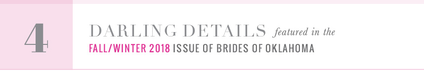 As our countdown to the brand new Fall/Winter 2018 issue of Brides of Oklahoma continues, we’re excited to share a few more sneak peeks from our talented local creatives featured in the mag! As they say, the devil’s in the details! Today, we’re highlighting the unique personal touches brides incorporate into their big day that make saying “I do” just that much more special. Keep scrolling to enjoy these four darling details, and make sure to flag your favs to incorporate into your own wedding as you’re flipping through the gorgeously glossy new issue!