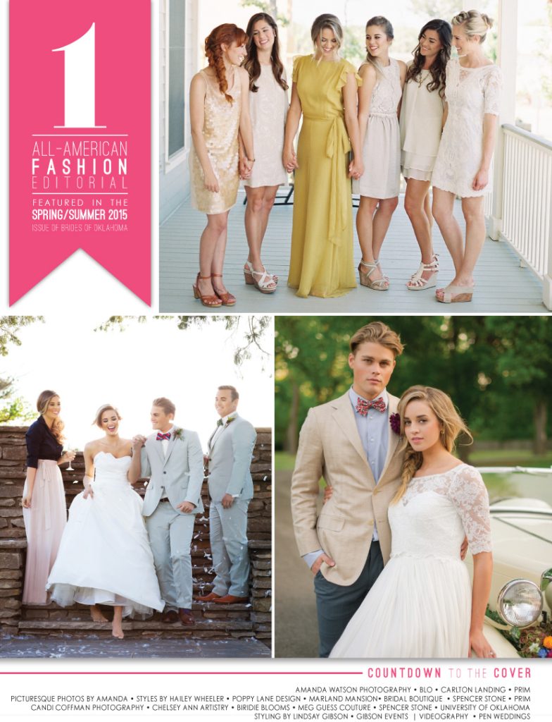 This year’s bridal fashion shoot was unlike any other and we’re just dying to share the entire 52-page spread…yes, it’s 52 pages! This Americana-inspired fashion-filled shoot was concepted in collaboration with Oklahoma wedding designer, Lindsay Gibson of Gibson Events, and dozens of other Oklahoma wedding vendors who came together to capture the spirit of an all-American love story and the beauty of all the cherished moments celebrated before, during and after the journey to the altar. We couldn’t be more thrilled with how this amazing editorial turned out and can’t wait to share all 52 pages with our readers oh-so-soon…but for now, a here’s a fun peek! We traveled across the state from Marland Mansion in Ponca City to Carlton Landing at Lake Eufala to pull off this inspiring fashion spread. We were so honored to work with Amanda Watson Photography on a dreamy lakeside engagement shoot and styled to the hilt bridesmaid brunch, Picturesque Photos by Amanda on an elegant ceremony and reception and Candi Coffman Photography on the prettiest day after session you could imagine! A special shout out to our lovely models Allie and Easton who were willing to follow us across the state jumping in lakes, taming large animals and just being all around amazing! We can’t wait to share this incredible adventure when the magazine hits newsstands in just a few short weeks!