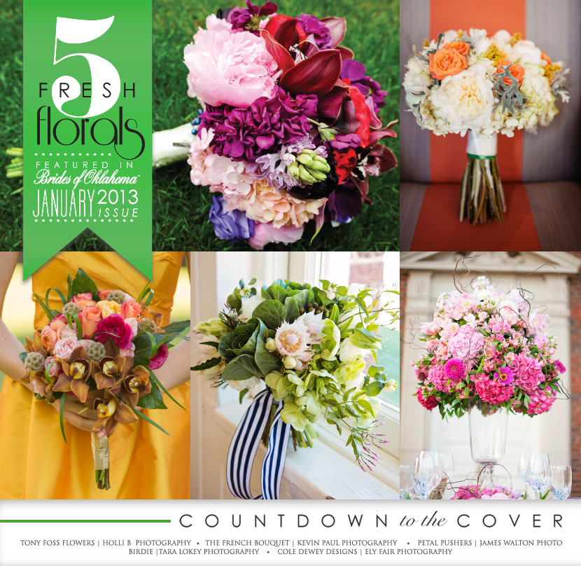 We can barely contain our excitement with the release of the Spring/Summer 2013 issue just around the corner!  We’re kicking off the countdown to the cover reveal with five fresh florals you’ll find in the all-new issue. As you flip through dozens of Oklahoma weddings and inspiring editorials, you’ll find tons of fabulous images featuring some of Oklahoma’s top wedding florists. Be sure to stay tuned to the blog as we continue to countdown to the cover reveal next week!  And if you want to be one of the firsts to get your hands on the new issue, pre-order your copy today! Cheers!