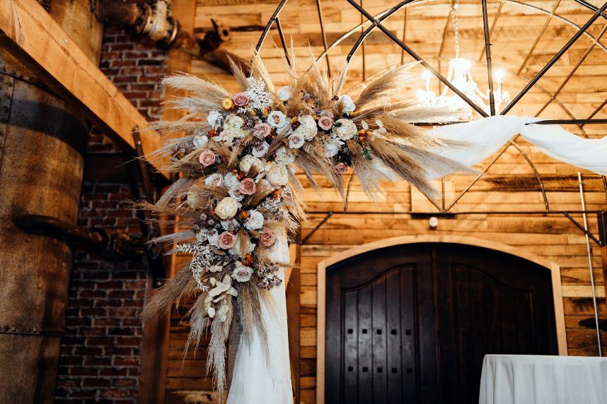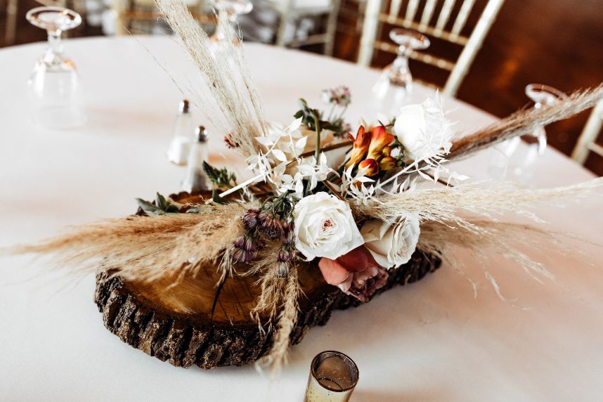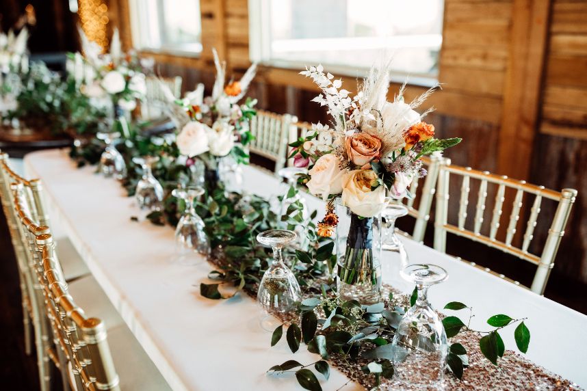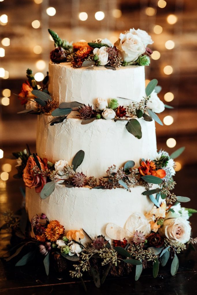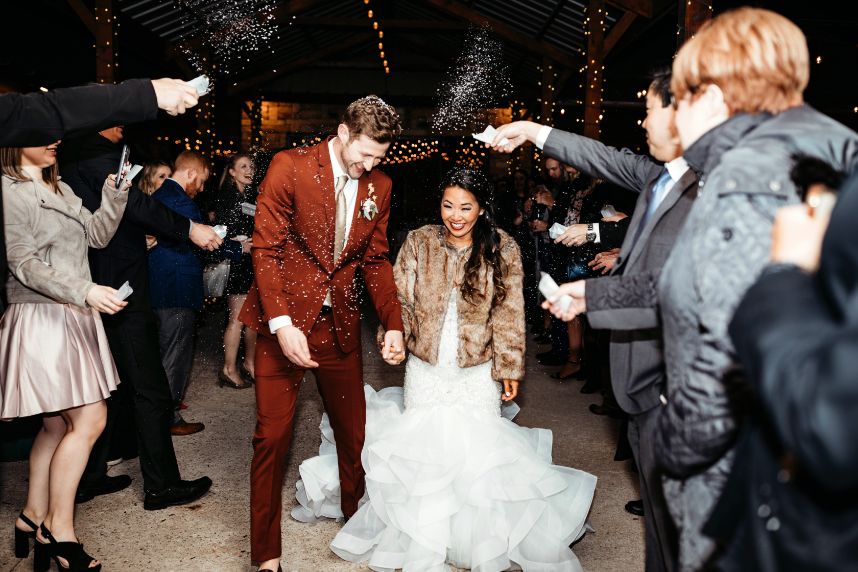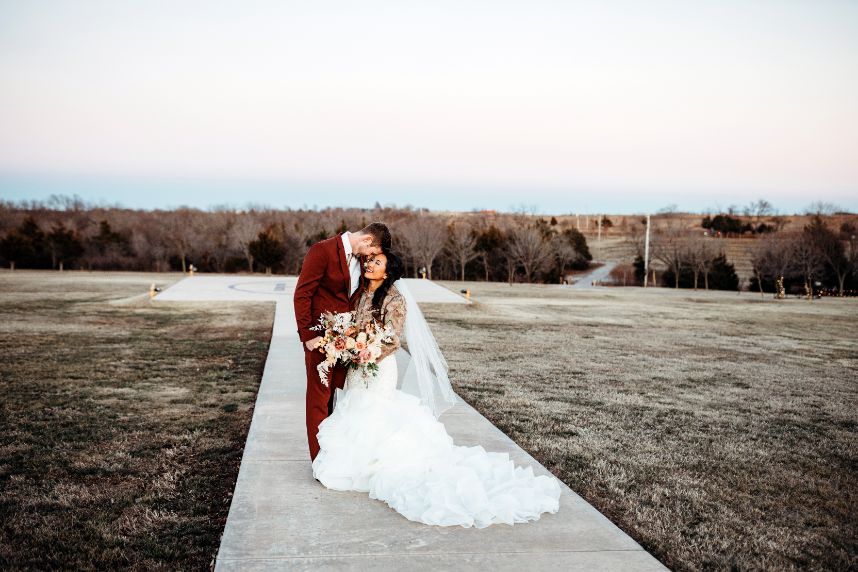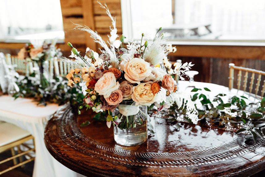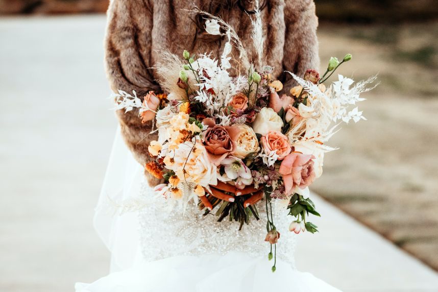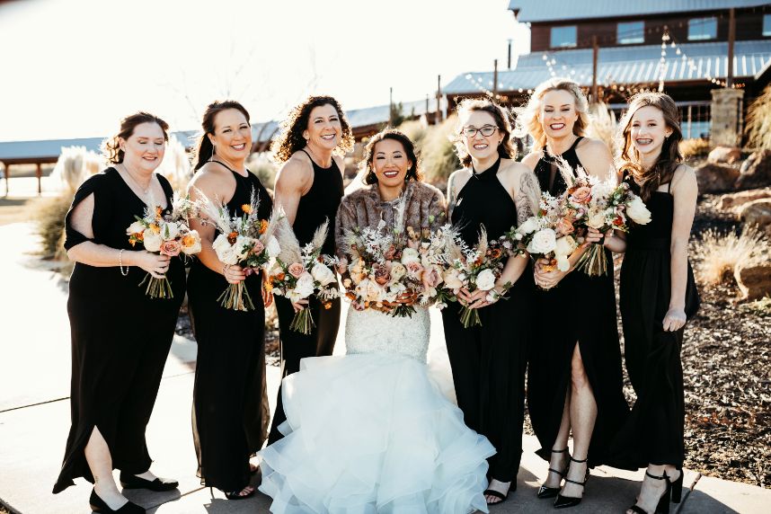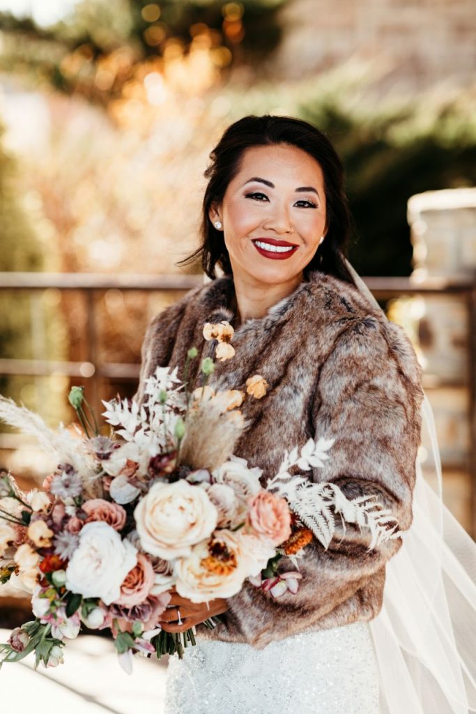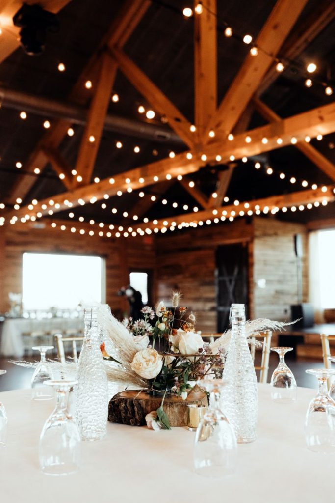 Held at Southwind Hills, Carolyn Napier and Nate Johnson tied the knot in the coziest and most rustic way we know! The color palette was an autumnal dream with blooms in soft peaches and rust with accents of pampas grass adorning all the arrangements. Carolyn was stunning in an all beaded, sweetheart neckline gown with a full, ruffled skirt from Bella Rose Bridal. Her fur mink coat and fall-inspired makeup, including a bold berry lip by Brushed Salon and Makeup Studio truly completed the look! Nate looked dapper standing by her side in a full fall-inspired rust suit! He looked so handsome! The combination of rich colors, greenery, wooden centerpieces, and twinkling lights was flawlessly captured by Kara Cheek Photography. Cheers to Carolyn and Nate’s cozy cabin inspired wedding!