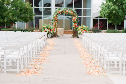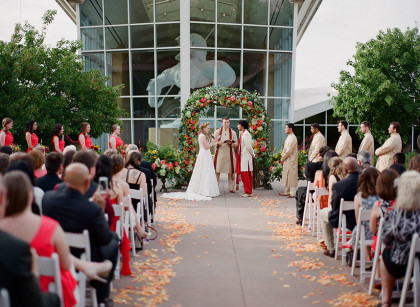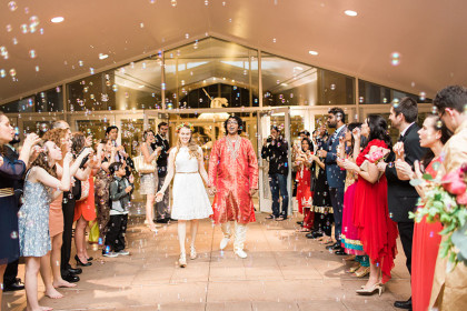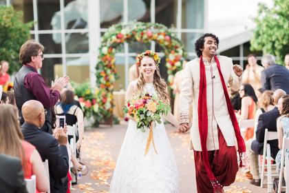 On a gorgeous day in May, friends and family gathered to celebrate Stephanie and Amrish’s love for each other at The National Cowboy & Western Heritage Museum. The happiness of the couple was greatly expressed through their idea of combining eastern and western cultures throughout their festivities. Incorporating the groom’s Indian culture, the rehearsal dinner included the celebration of Mehndi, in which the bride and other women in attendance were decorated with henna. During the wedding ceremony, the groom dressed in the traditional, lively Desi attire and majestically entered the service atop a noble white horse.