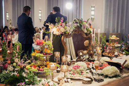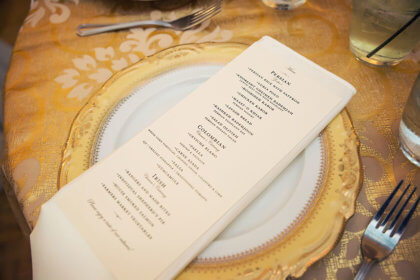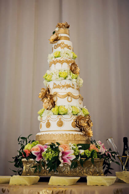 The reception began with the couple dancing to “Is this Love” by Bob Marley. Guests were offered a full spread of Irish, Colombian and Persian fare as well as a breathtaking six-tier cake from Amy Cakes embellished with gold fondant emblems and flowers. The guests danced the night away with Born in November playing the hits and DJ PJ playing Persian music. As the couple left the reception, guests rang bells to wish them well.