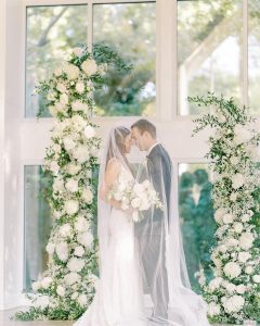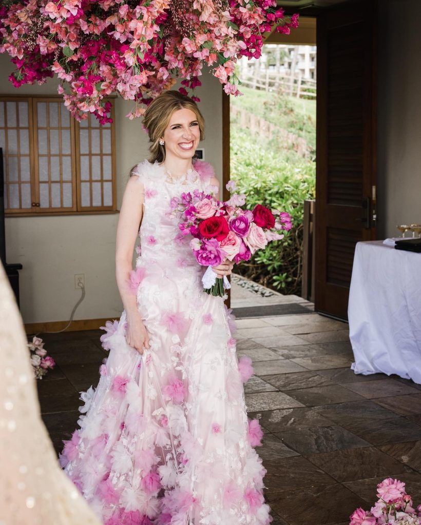 Kaitlyn + Will wanted a unique wedding in Maui, and so that’s exactly what they did! Avari Bridal made this custom gown for the bride, complete with hand-died and hand sewn flowers. Fun fact: the bride planned the entire wedding around her custom dress and her husband wore a matching tie with his custom William & Lauren Custom Clothier tux! ⁠