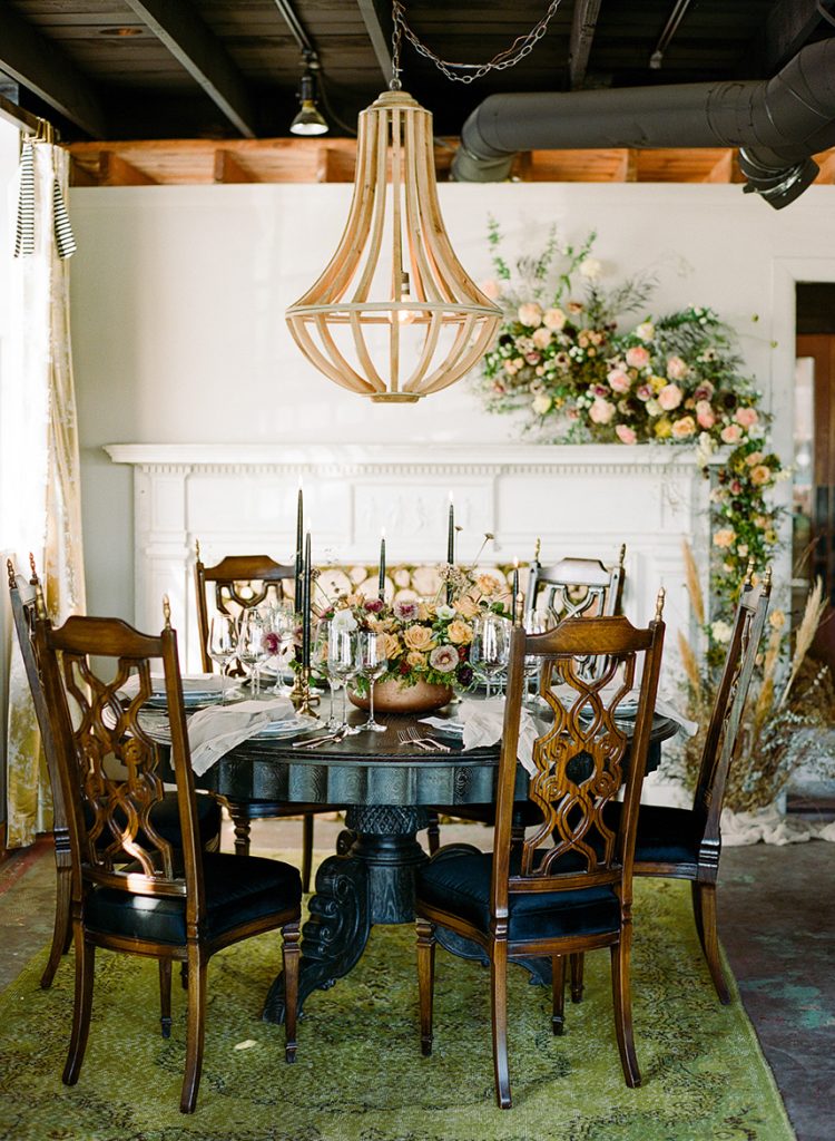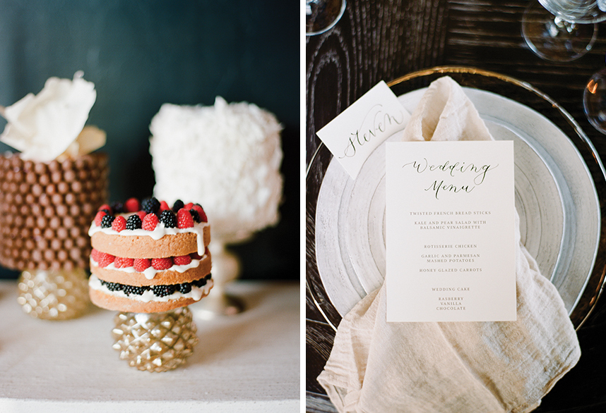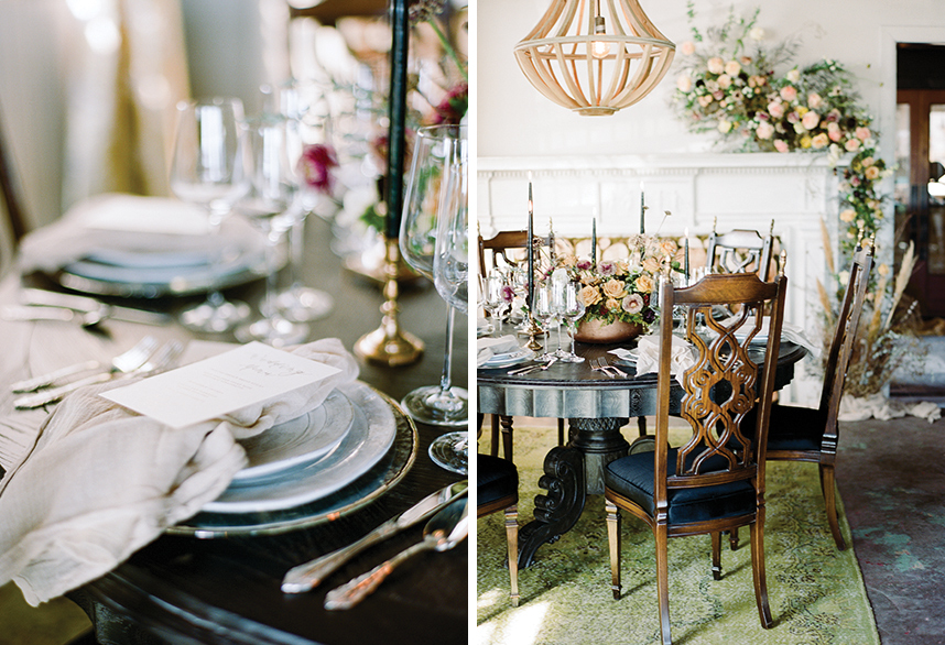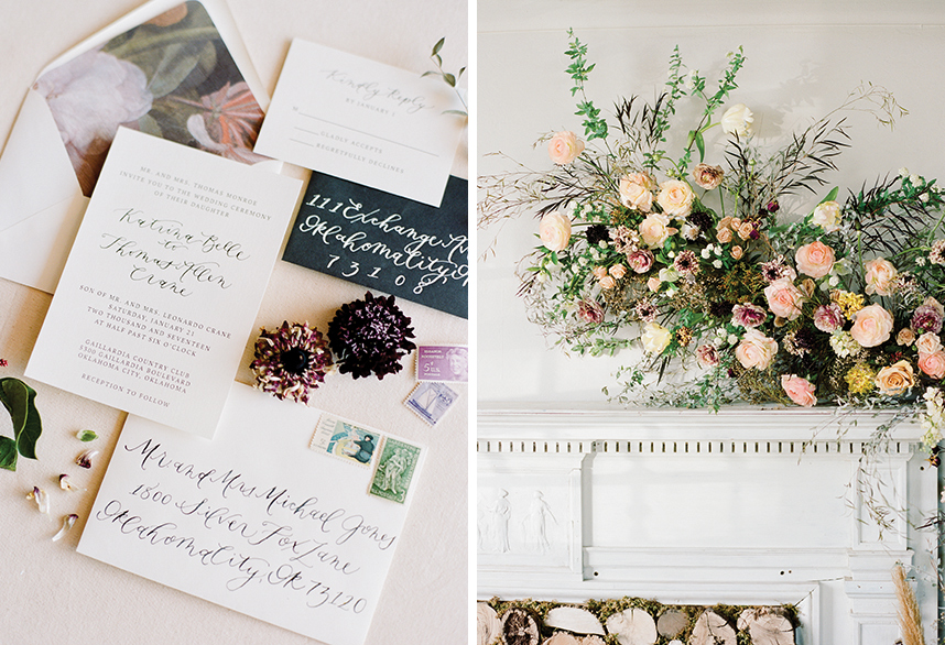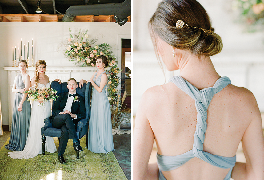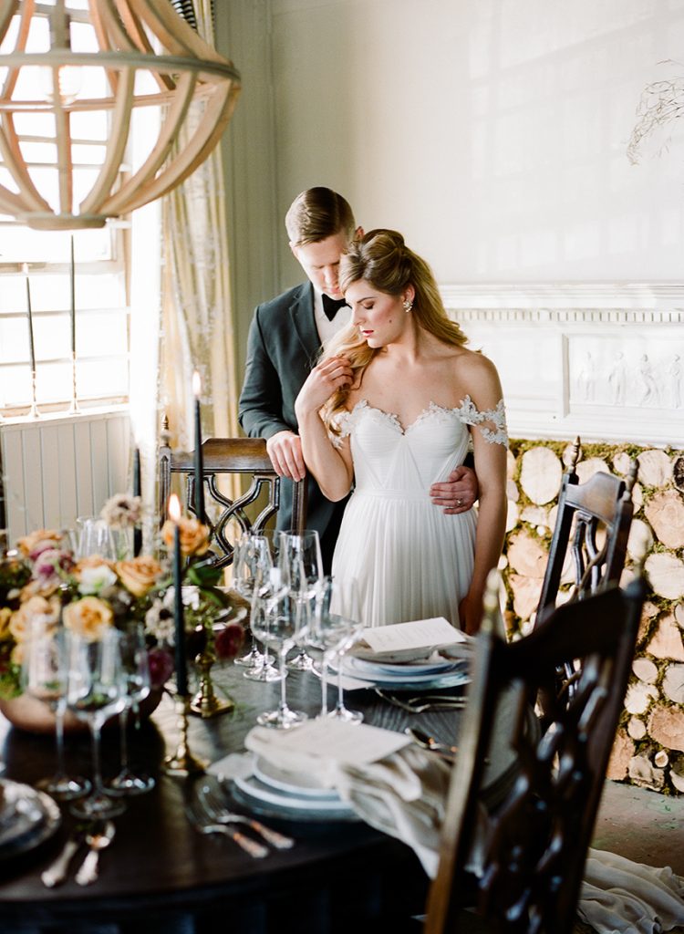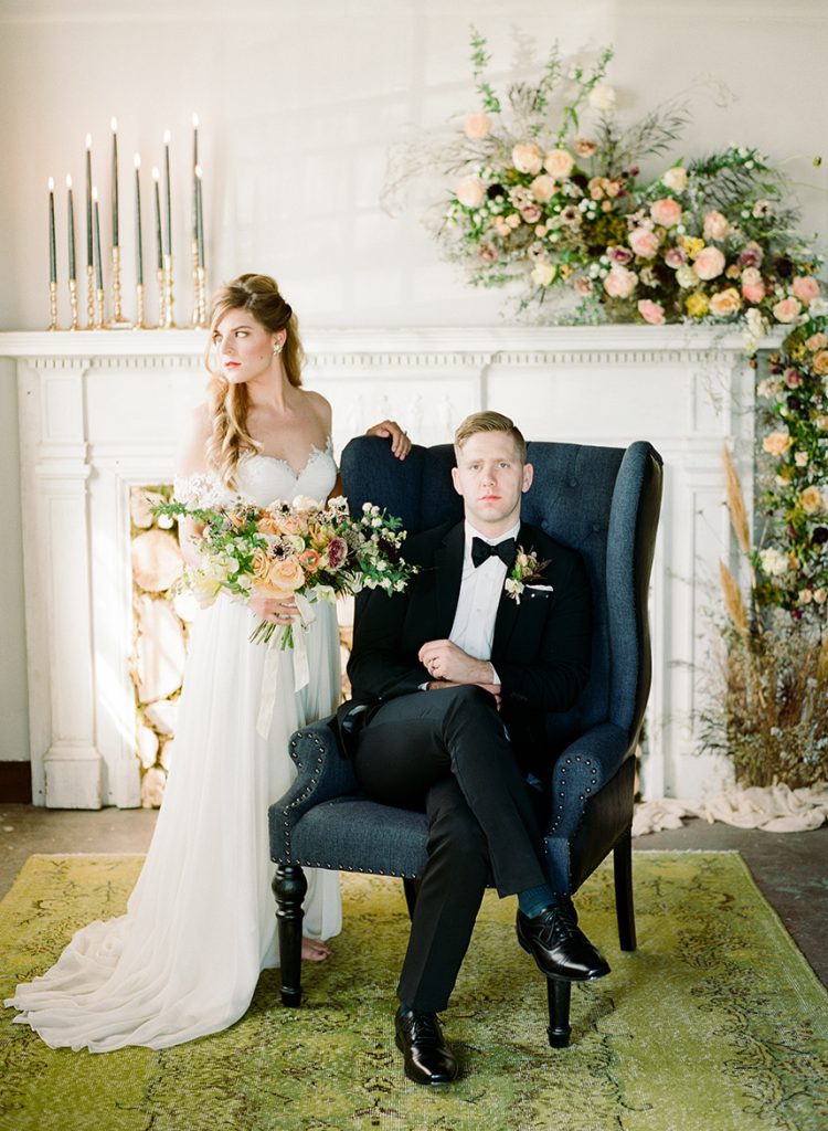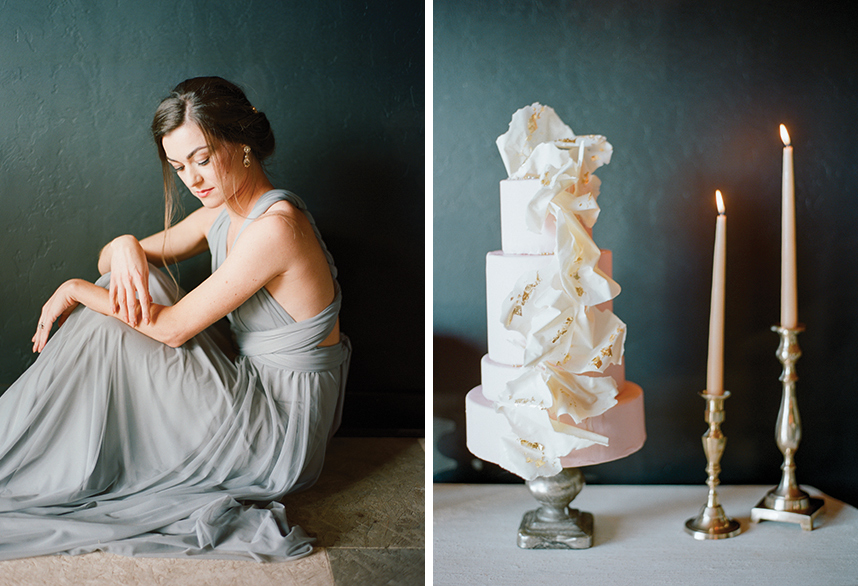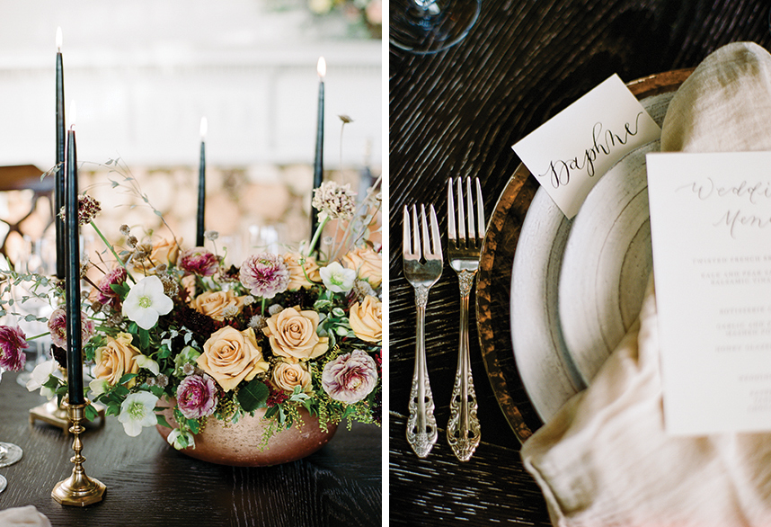 With contrasting details of pretty pastels with moody, vintage-inspired decor, we’re loving the unique elements in this styled shoot from Aisle Be With You. Amanda Watson Photography captured all the sweet details of the shoot, beginning with the custom calligraphy printed paper suite of invitations, place cards and menus from Rachel Kathryn Designs. Matching the delicate-meets-dark color scheme, Juniper Designs crafted show stopping floral arrangements with peach, lavender and white roses, daffodils and exotic blooms in a deep plum shade. Arrangements covered the fireplace mantel and sat at the center of the table, decorated with gold-rimmed serveware place settings from Marianne’s Rentals and matching antique candle holders from Ruby’s Vintage Rentals. A trio of unique cakes, along with the four-tiered gold foiled star from Brown Egg Bakery completed the table settings, providing a sweet treat option to suit every palate. Of course, the true show stopper was the model bride and her bridesmaids, all wearing gowns from Chantilly Couture along with a soft-swept hairdo and makeup from Chelsey Ann Artistry. The bride’s perfectly coordinated gold strappy Jimmy Choo shoes and marbled clutch added the perfect delicate touch to her look. We can’t get enough of all the pretty inspo from this shoot! Cheers!