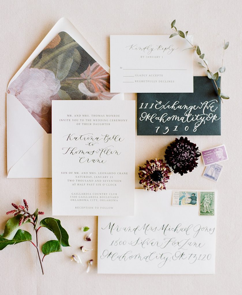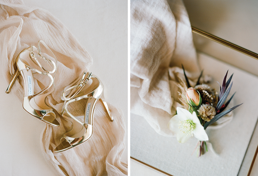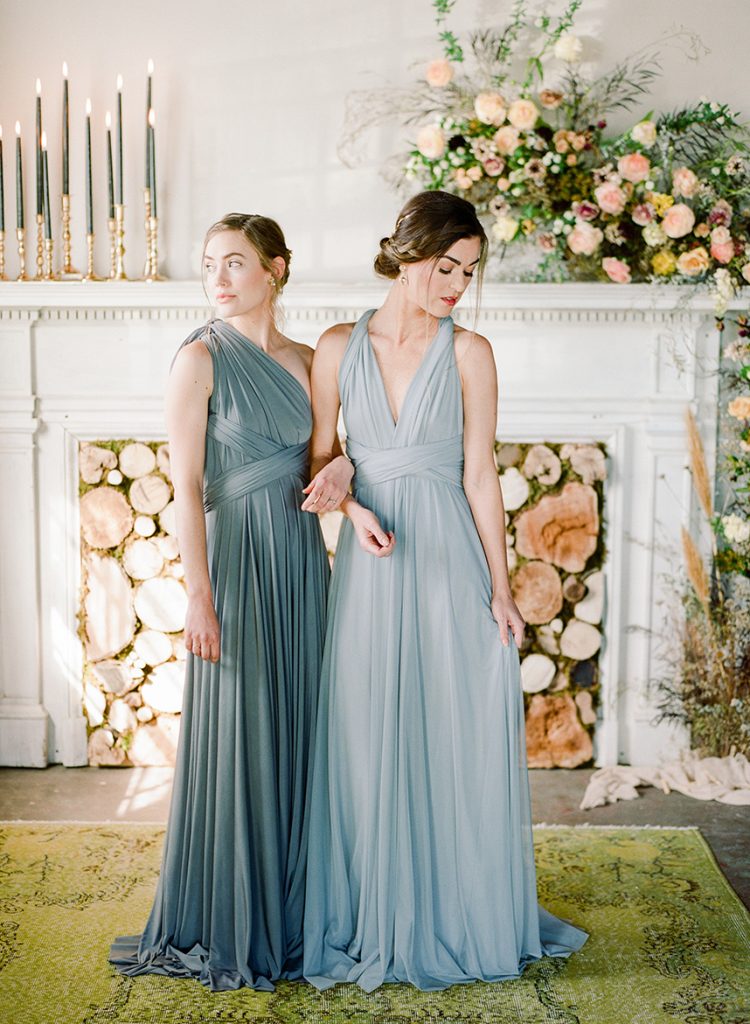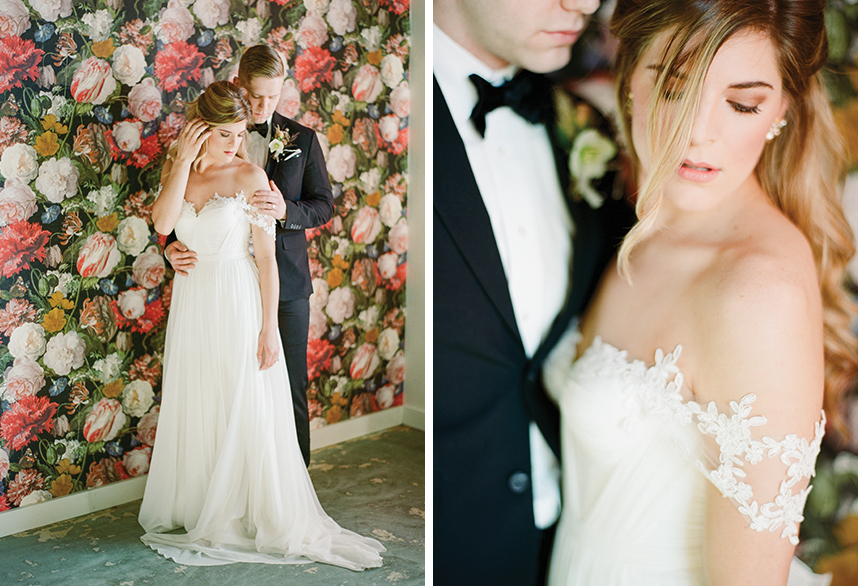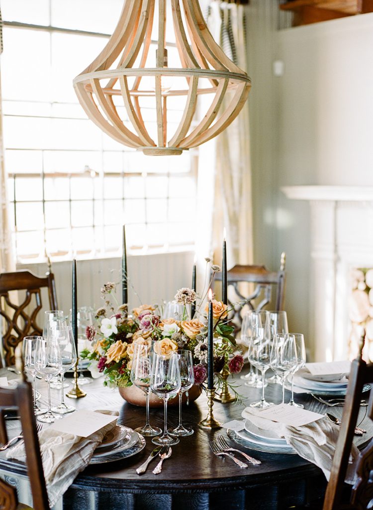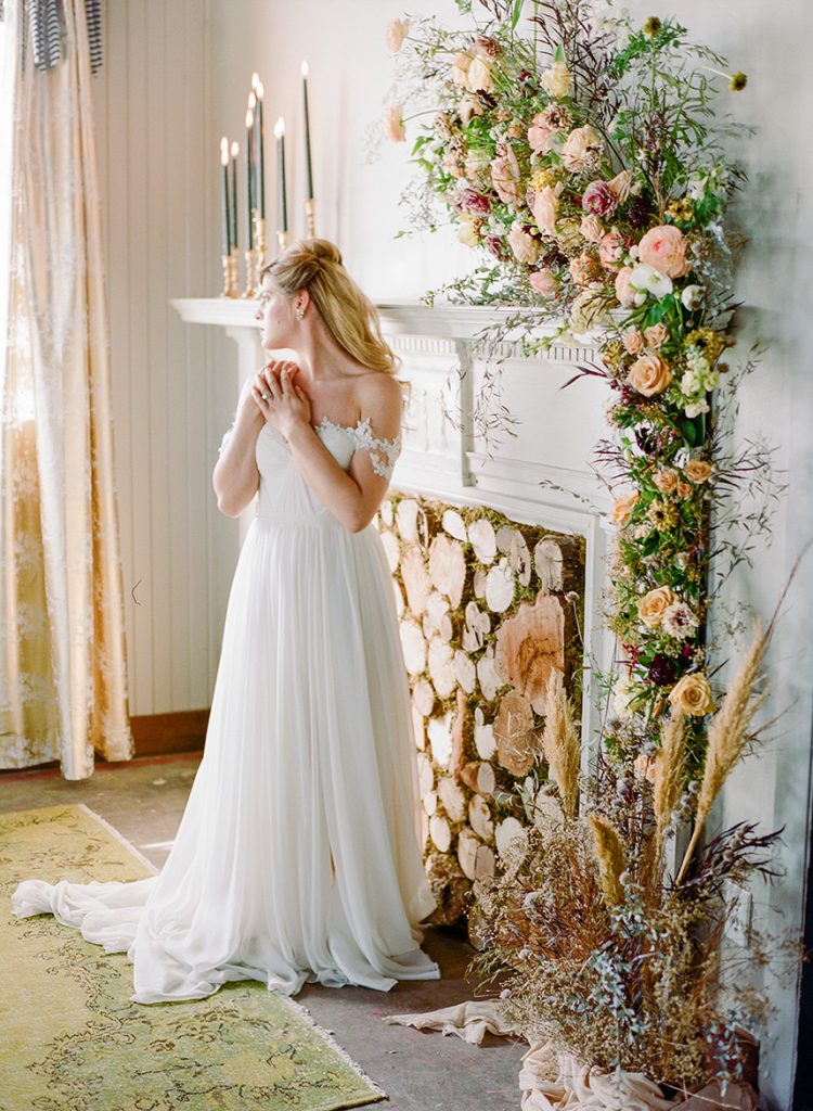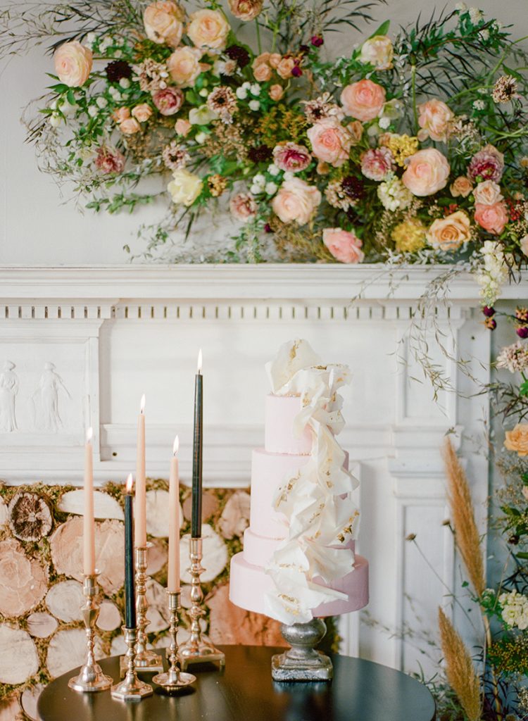 With contrasting details of pretty pastels with moody, vintage-inspired decor, we’re loving the unique elements in this styled shoot from Aisle Be With You. Amanda Watson Photography captured all the sweet details of the shoot, beginning with the custom calligraphy printed paper suite of invitations, place cards and menus from Rachel Kathryn Designs. Matching the delicate-meets-dark color scheme, Juniper Designs crafted show stopping floral arrangements with peach, lavender and white roses, daffodils and exotic blooms in a deep plum shade. Arrangements covered the fireplace mantel and sat at the center of the table, decorated with gold-rimmed serveware place settings from Marianne’s Rentals and matching antique candle holders from Ruby’s Vintage Rentals. A trio of unique cakes, along with the four-tiered gold foiled star from Brown Egg Bakery completed the table settings, providing a sweet treat option to suit every palate. Of course, the true show stopper was the model bride and her bridesmaids, all wearing gowns from Chantilly Couture along with a soft-swept hairdo and makeup from Chelsey Ann Artistry. The bride’s perfectly coordinated gold strappy Jimmy Choo shoes and marbled clutch added the perfect delicate touch to her look. We can’t get enough of all the pretty inspo from this shoot! Cheers!