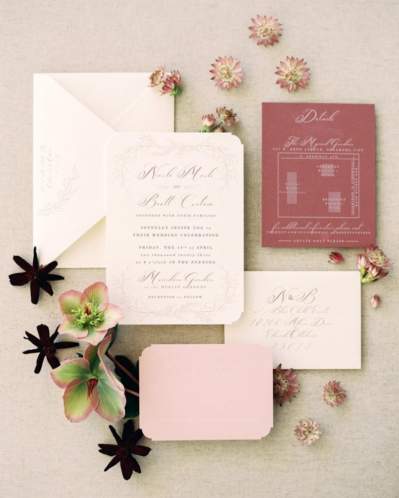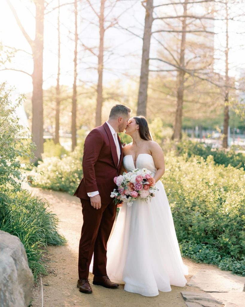 Nicole + Brett had the dreamiest day in Downtown Oklahoma City. Their rosey color palette complimented the outdoor scenery of Myriad Botanical Gardens and the details were perfection!