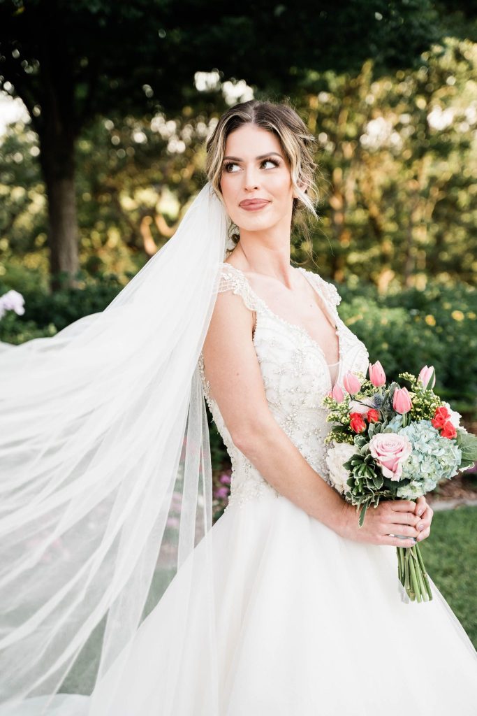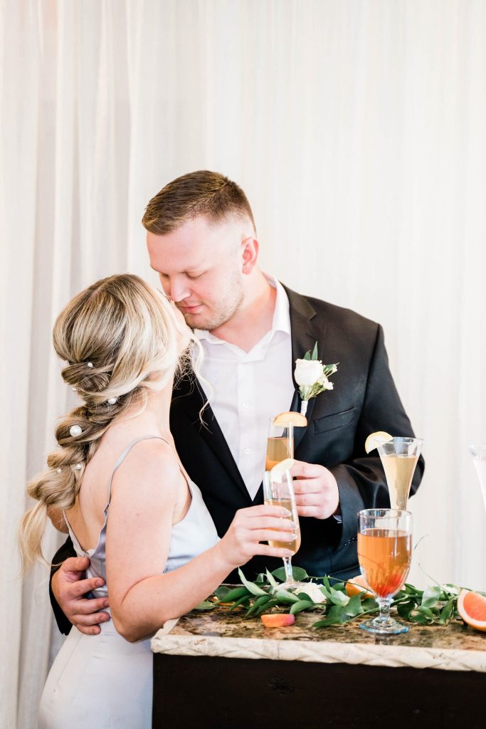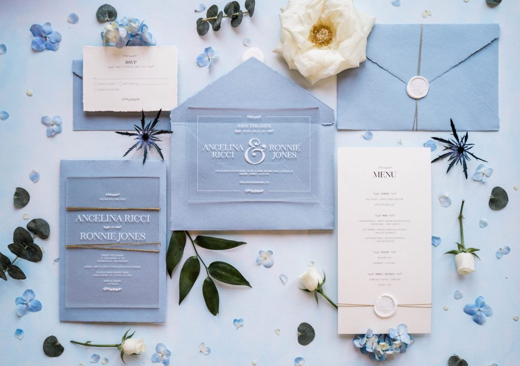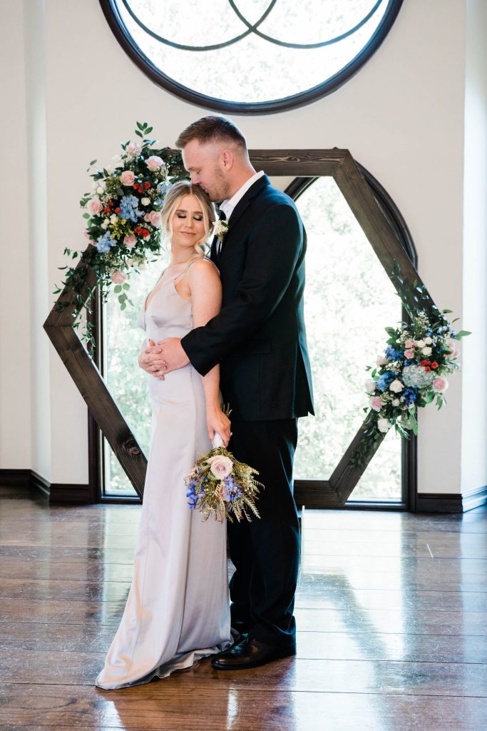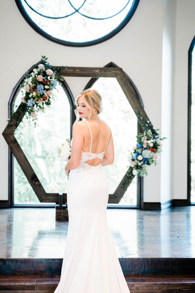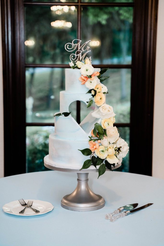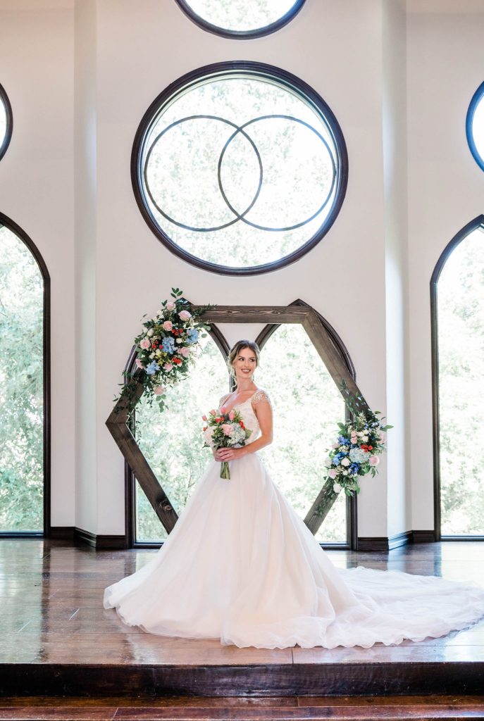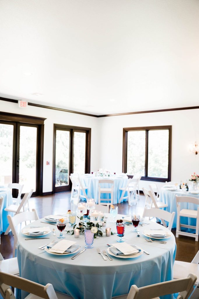 It is no secret that dusty blue has taken the wedding world by storm, and we are so here for it! This styled shoot with accents of dusty blue at the newly renovated Bella Donna Wedding Chapel & Event Center is here to show you all the different ways to incorporate the popular color into your special day. We love the subtle pop of blue in florals, especially on the altar focal point. The Bella Donna’s beautiful chapel with glass windows provides the perfect blank canvas to add pops of colorful florals for your ceremony. Next, have fun with your bar! Blue Label Bartending showed us that wedding bars don’t have to be plain. You can add a fun spark of color with your choice of cocktails that also show off your style. Blue Label Bartending even created a fun blue cocktail to showcase the popular dusty blue color in this styled shoot. Additionally, a dusty blue wedding cake is sure to catch the eyes of all wedding guests, especially when paired with a blue linen. Party Perfect Event Rentals provided dreamy blue table linens and tablescape rentals that turned the reception space into a timeless affair. One thing we know for sure is that dusty blue isn’t going anywhere! So if you’re looking for a color palette for your big day, here is your answer. Keep scrolling to see all the fun ways this styled shoot incorporated dusty blue!