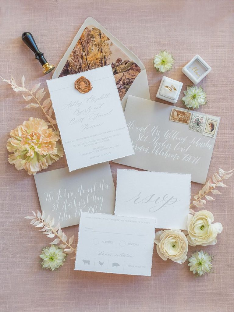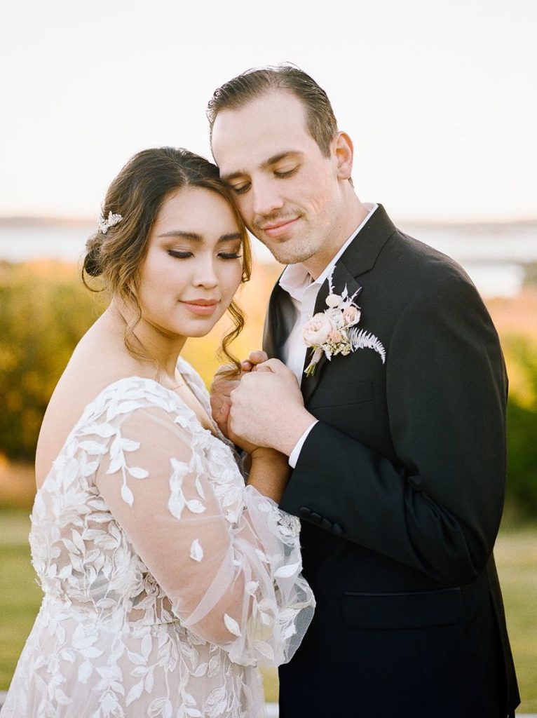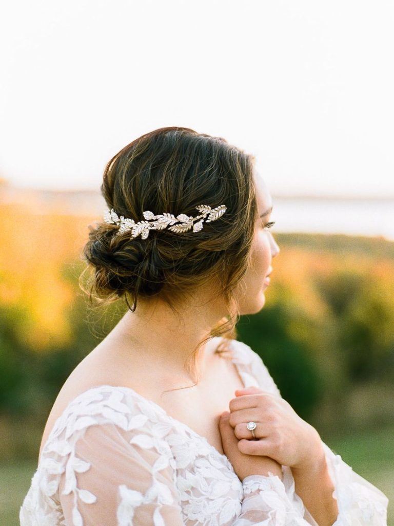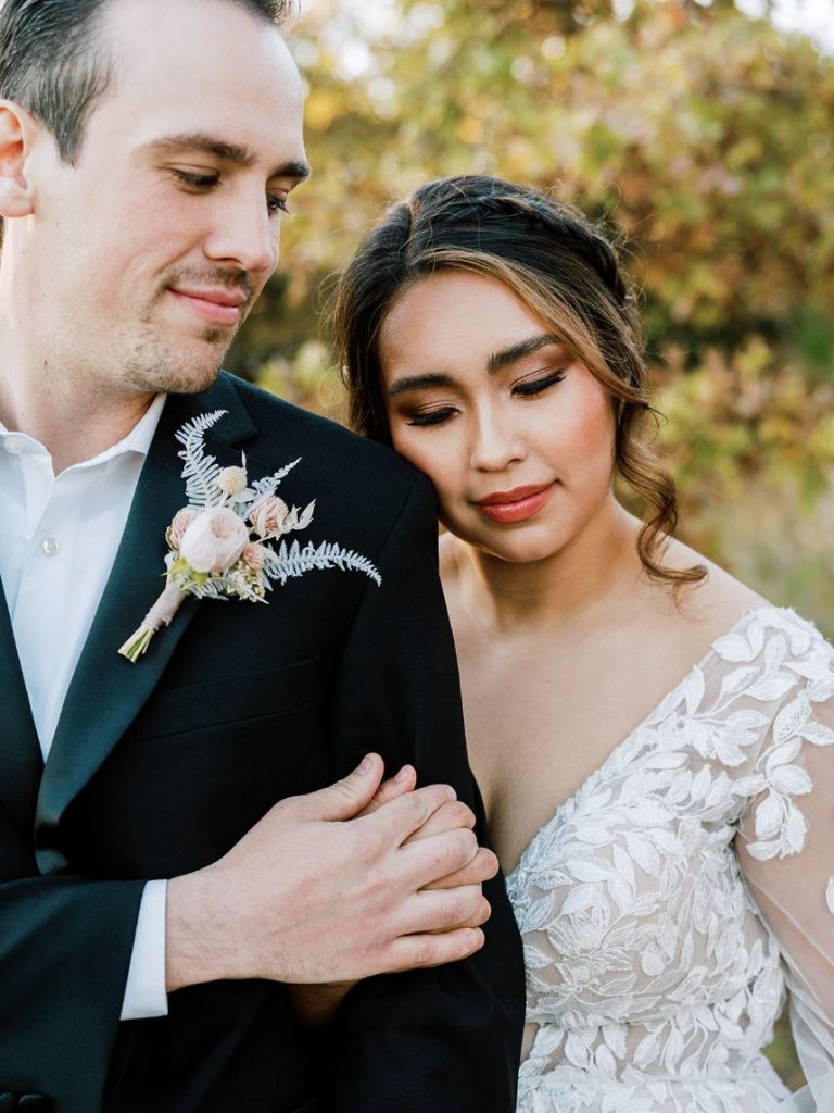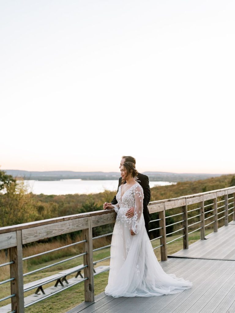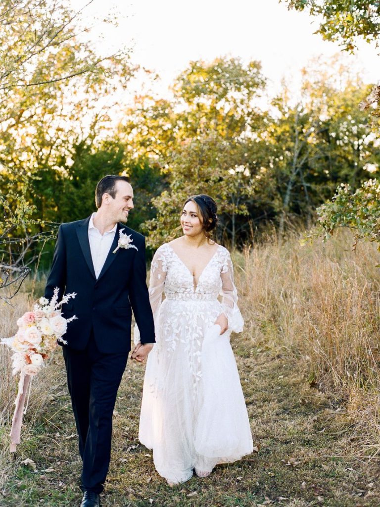 In a display of modern romance, this elegant woodland wedding inspiration encapsulates all that makes an outdoor affair so attractive! Danielle Villemarette & Co. captures breathtaking views across a sweeping Oklahoma landscape and a scenic barn venue that boasts both indoor and outdoor locales. This shoot features feminine reception seating characterized by a palette of delicate pinks while plentiful baby’s breath creeps up the side of a wooden arbor in a gradient from pink to natural white, making an effortless-looking ceremony setup. Elegant gold elements make tablescapes pop, with organic touches of natural wood and trailing floral design that give off a relaxed, serene vibe so you truly get the best of both worlds. Bride and groom seem to be glowing with love, taking in views and the calming surrounding scenery in their upscale attire. Hayley Hall Hair creates a soft updo with fishtail braid for texture and added a vining hairpiece to coordinate with her gorgeous gown – a romantic V-neck with sheer poet sleeves and petal appliqué detailing from The Bridal Boutique that is simply perfect for the occasion. Read on for a note from the photographer about the inspiration behind this elegant woodland wedding shoot. Cheers!