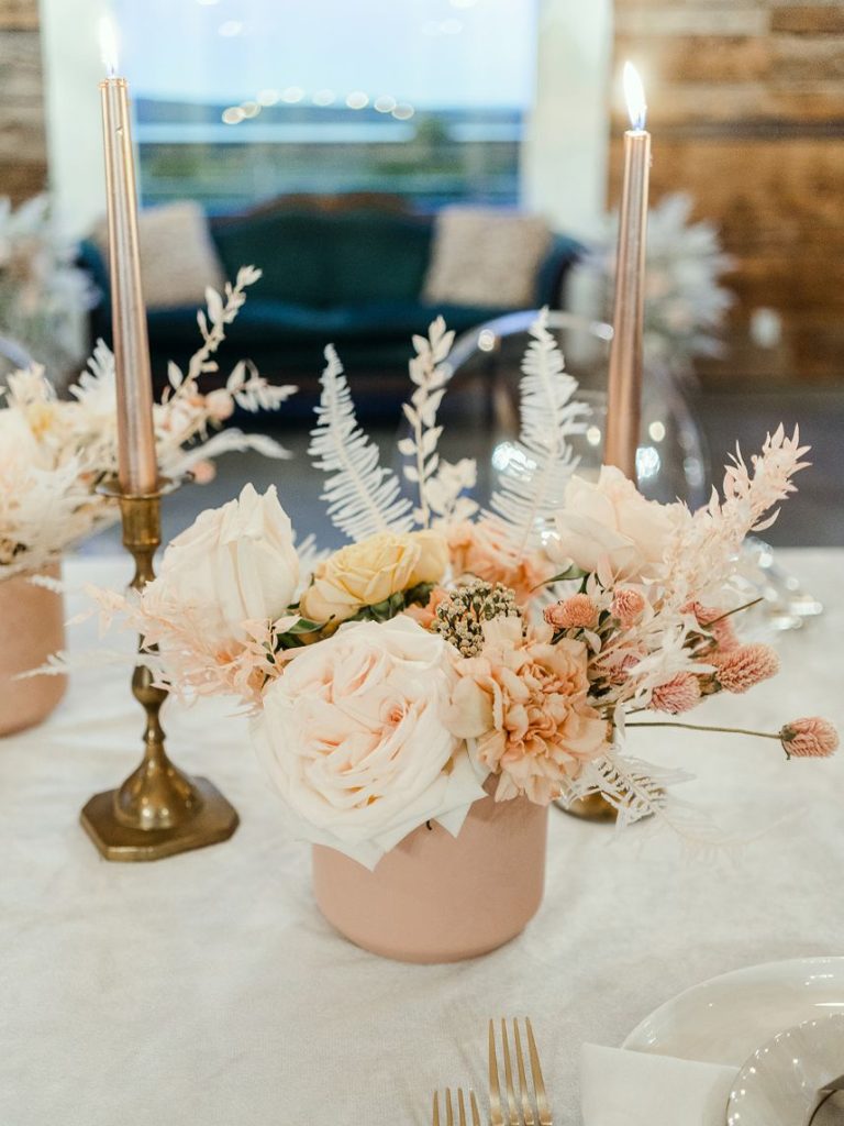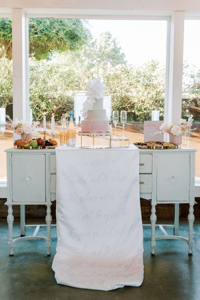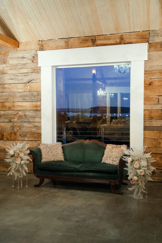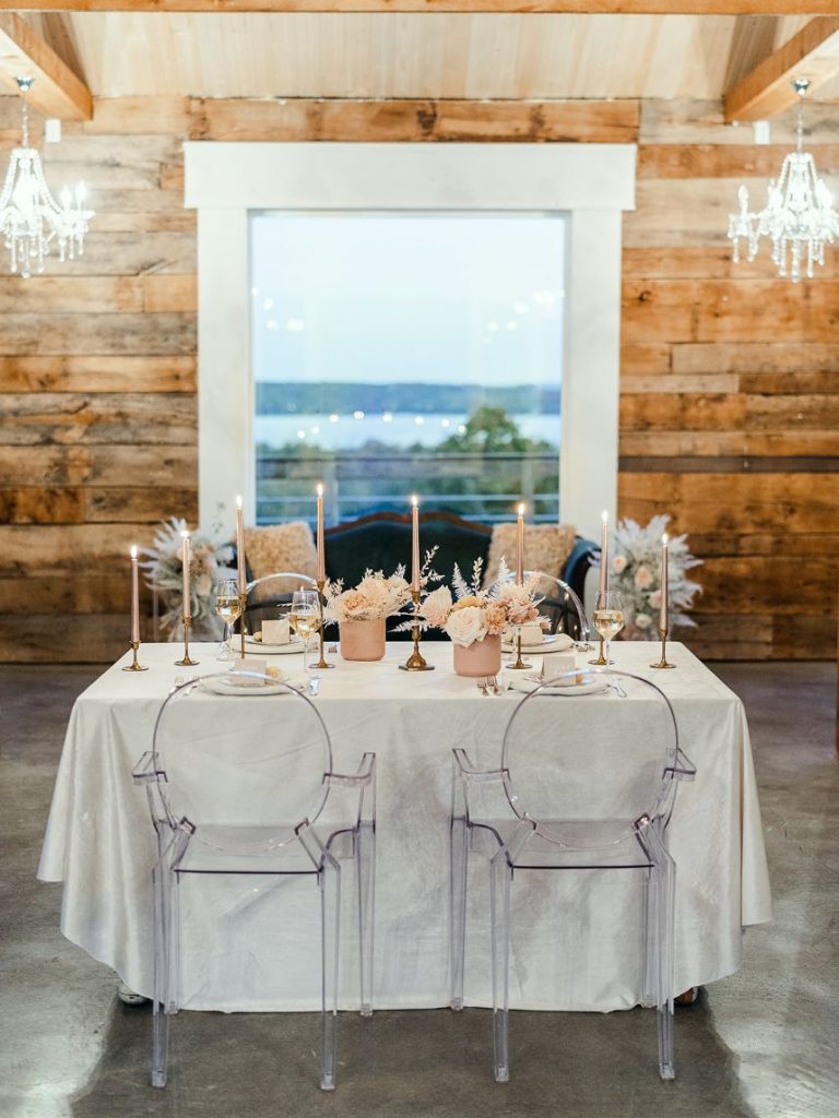 From the photographer, Danielle Villemarette & Co.: “Brandy of Blue Chalk Events and I collaborated on this romantic, modern styled shoot at The Pointe at Lake Eufala. Nikki (owner of The Pointe) had sent me a photo during the early stages of planning of a painting in the lodge house, and that painting was our color palette inspiration. The views at The Pointe are breathtaking and we wanted to really showcase that while also showing just how versatile in style that barn can be.”