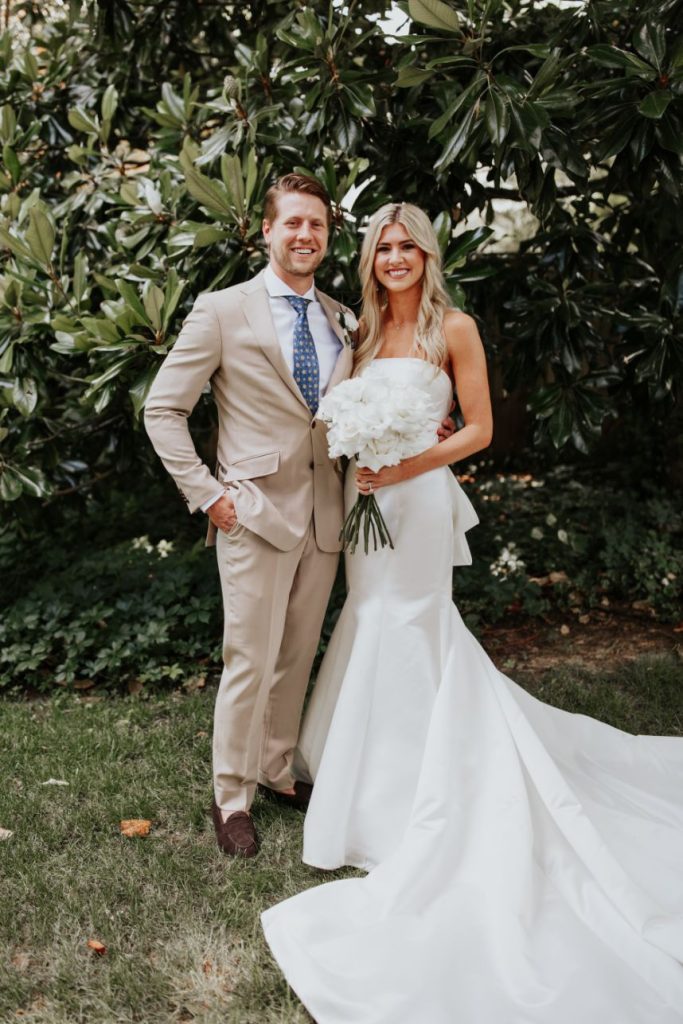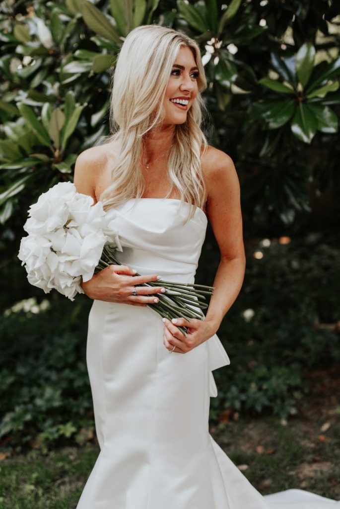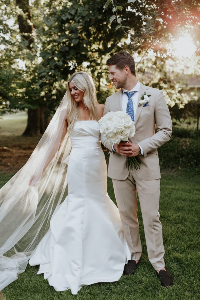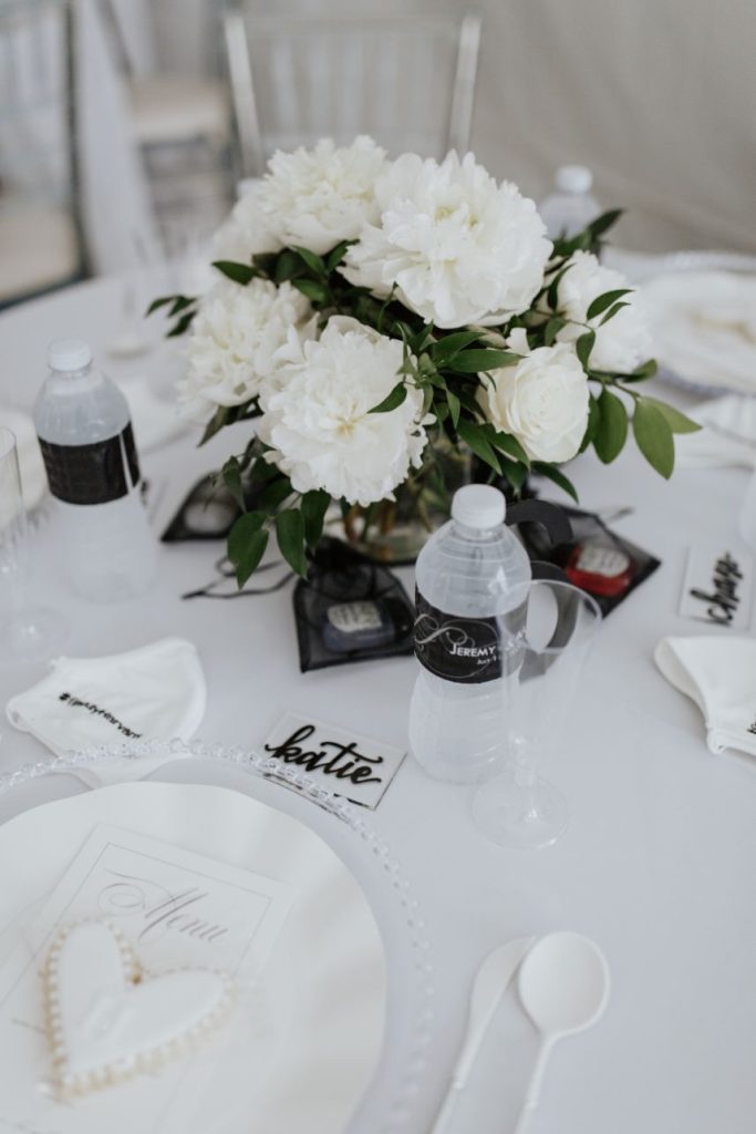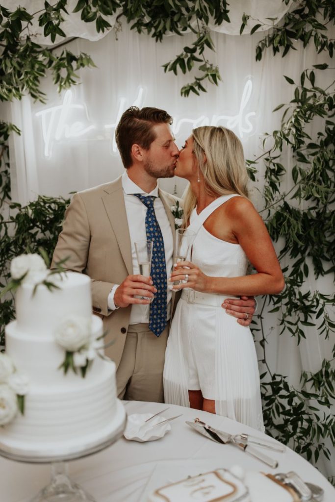 Ally and Jeremy celebrated their big day with an elegant yet modern themed wedding! With the pandemic making planning difficult, they decided to put a tent in Ally’s parents’ backyard, and it turned out to be such a beautiful and special setting for the two to say “I do”! Ally’s mermaid style dress from J.J. Kelly Bridal Salon was so classy and elegant and featured a fun bow detail on the back! We are obsessed with the black and white checkered floor, and a white floral wall served as a gorgeous backdrop for the couple as they tied the knot! KGC Photography captured the couple’s day in such a memorable and timeless way! The simple white three-tiered cake with soft white floral detailing from Amy Cakes was the perfect sweet finish to the night! Cheers to Ally and Jeremy!