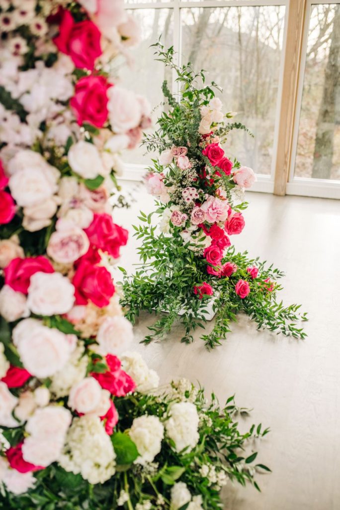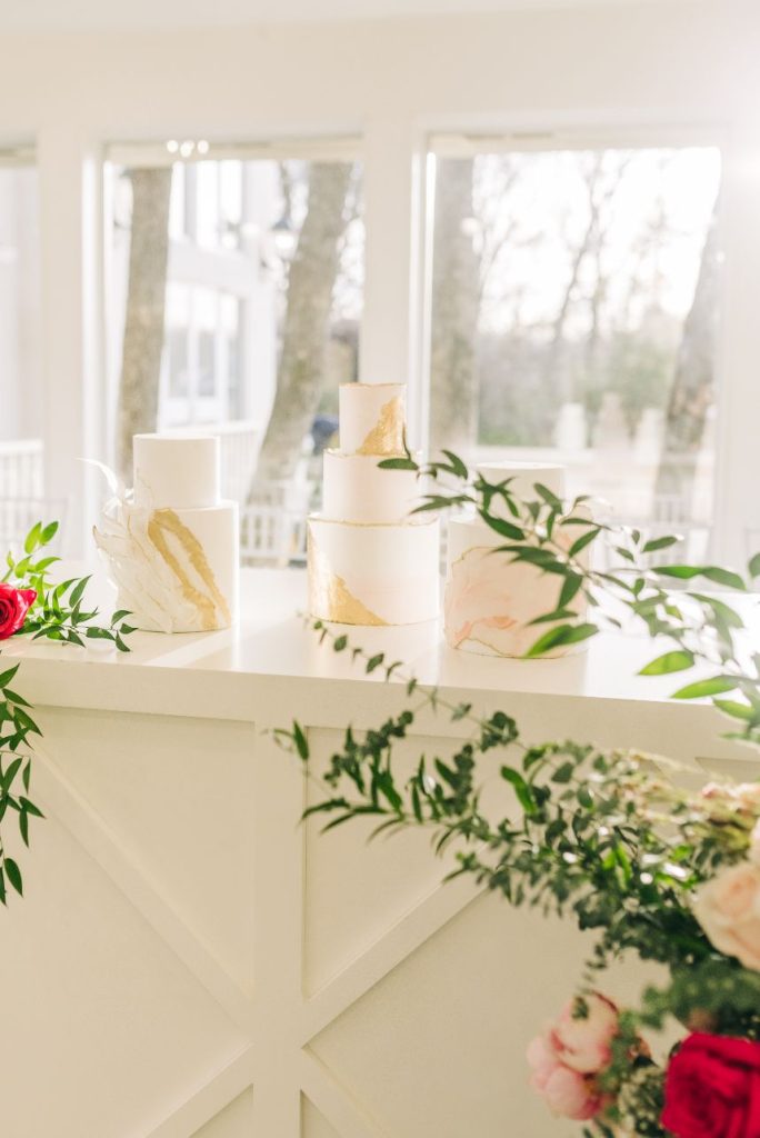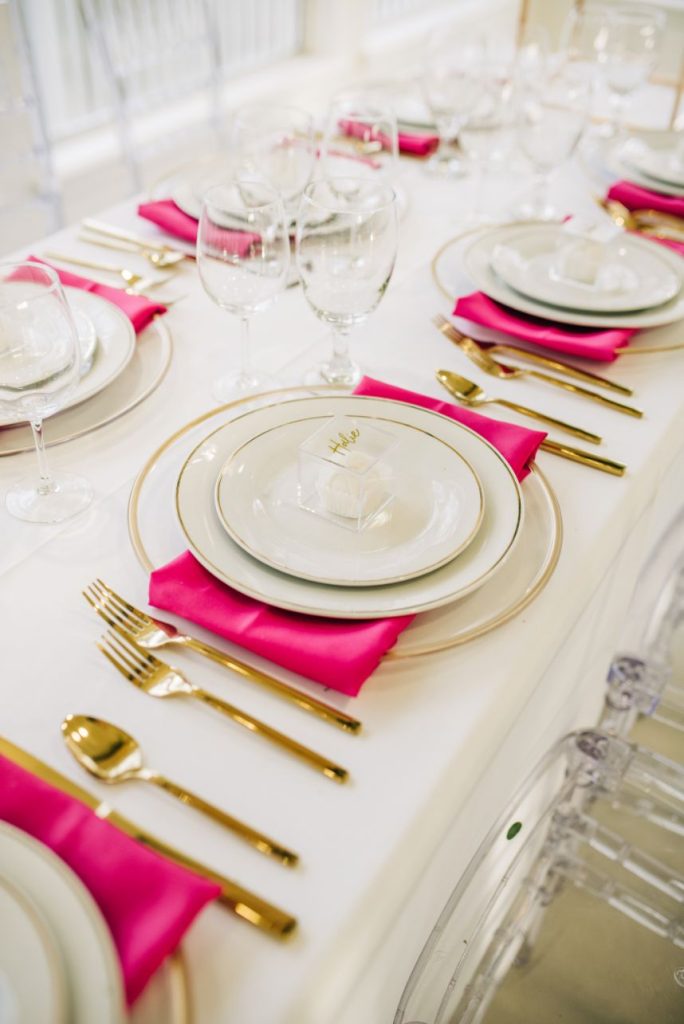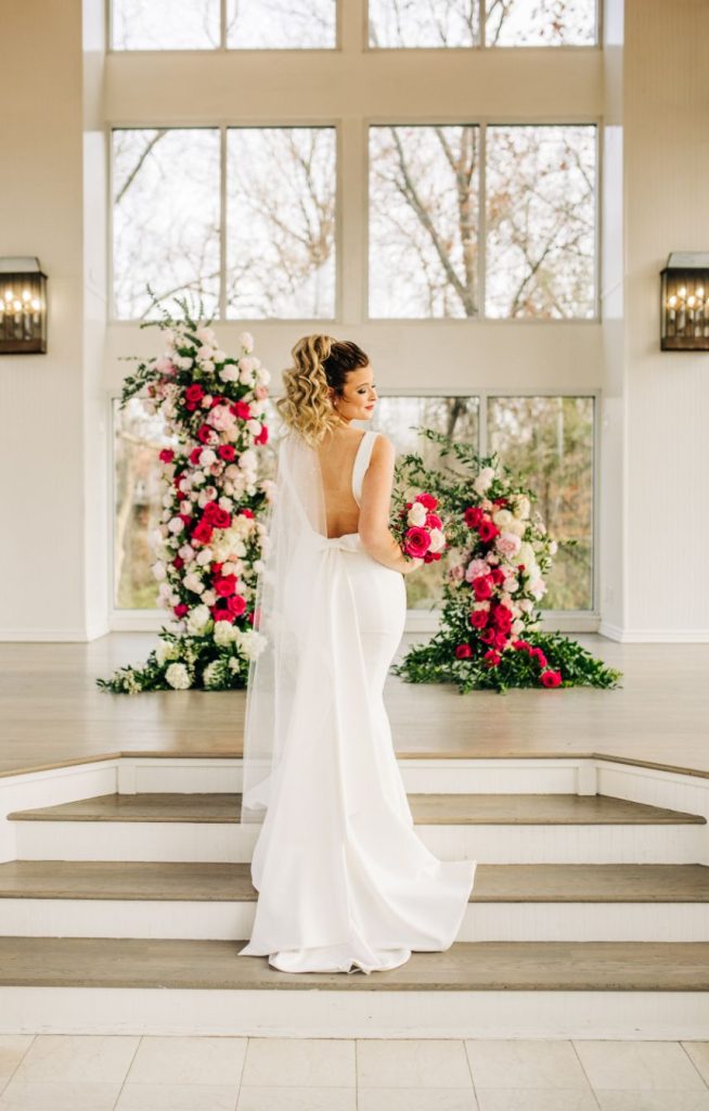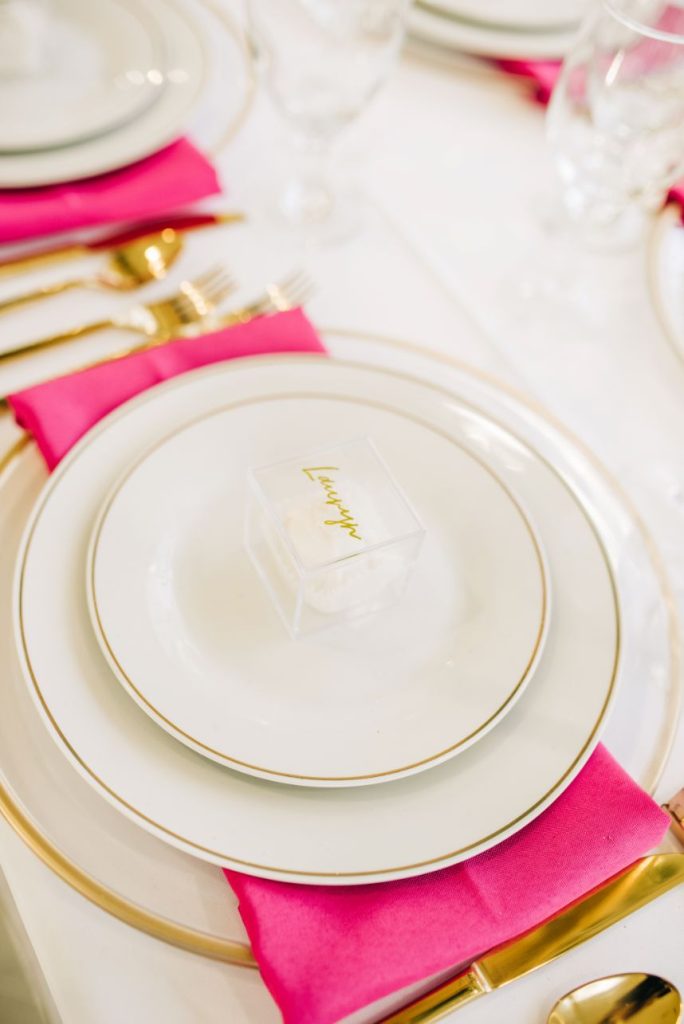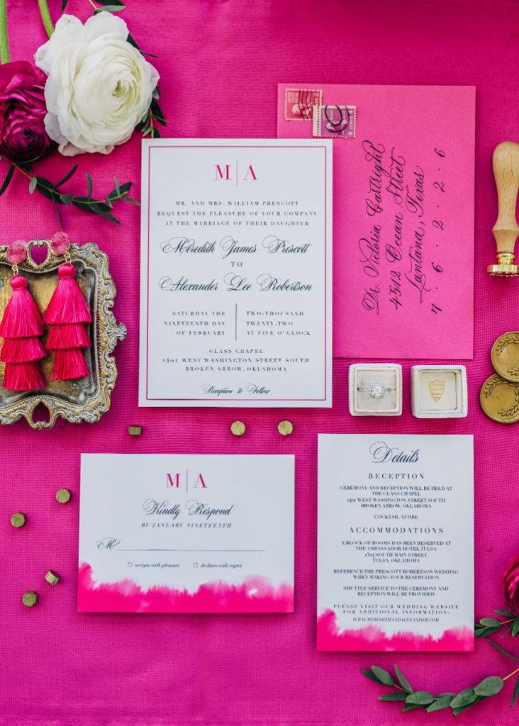 We had to pinch ourselves before digging into these styled shoot details! Fall head over heels for this elevated pink wedding inspiration around the light-filled Glass Chapel of Broken Arrow where a wedding designed and styled by the visionary Lauryn Lamb Events was created with scenes characterized by posh whimsy. We see this play out in tablescapes laden with plenty of pink and brass accents, and for a luxe touch, places were set with personalized acrylic cubes filled with a little dessert to preface your choice in a slice from the trio of cakes designed by Mishelle Handy Cakes in two and three tiers with marbled, gold-flecked exteriors. The invitation suite hints that it was created just for the bride with a passion for pink and fashion trends, and this model totally embodies that vibe from the start. Her brown, bouncy curls in a power pony paired just beautifully with the V-neck sheath gown from J.J. Kelly Bridal Salon, pearl-studded veil, retro cat-eye sunnies, and pink heels to match. Whether you’re looking for a pop of pink or want to wash your wedding in the cute color, this elevated pink wedding inspiration is simply swoon-worthy. See more in the full photo gallery down below. Cheers!