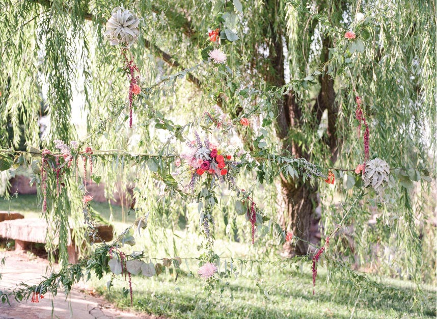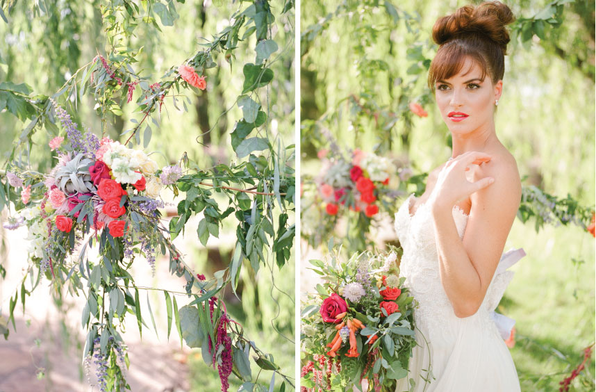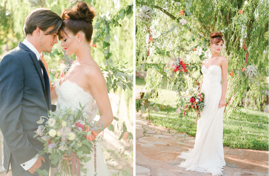 We were so incredibly inspired when Camden Chitwood with Emerson Events shared her blooming flower spiral backdrop idea with us! For use behind your ceremony or as a photo backdrop, this makes for a creative touch. Emerson Events is known for their ingenuity and creative spirit, and we couldn’t wait to work with Camden in bringing her vision to life! Emerson Events took to building this bold backdrop captured by Amanda Watson Photography at Coles Gardens. You can find this model couple’s gown and suit among many other beauties at Meg Guess Couture. Sooo Lilly created the bride’s darling beauty look, and Trichology Salon styled her locks. What a great team! Enjoy!