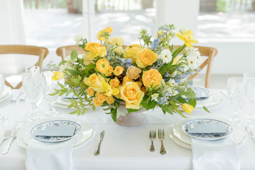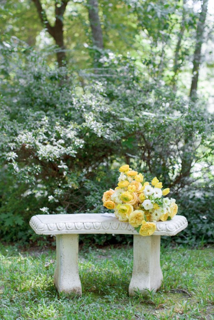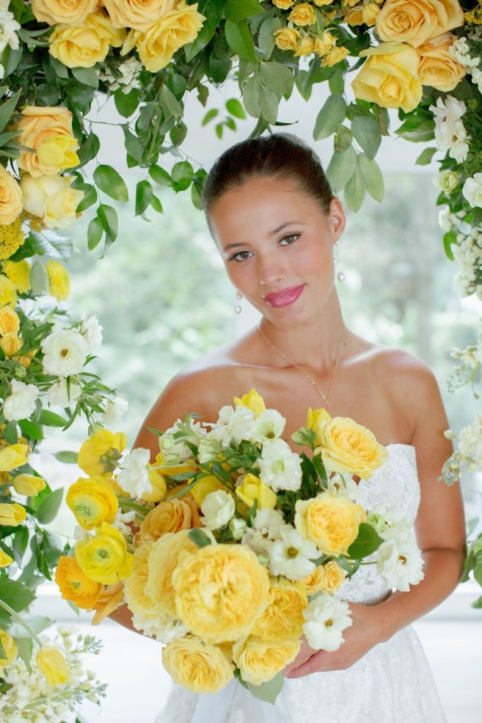 Seeing these romantic scenes has us filled with indefinite love for this English wedding editorial inspired by Notting Hill and pictured in captivating gallery by Jadyn Noelle Photography. You’ll be busting out your favorite Vans and felt beret after seeing this Notting Hill inspired setting. With punchy canary yellow and dainty floral cottagecore details, it’s as if she’s “just a girl” standing in front of a boy, asking him to love her… forever, in the most lovely British garden! Glass Chapel made the sweetest setting for this cheery affair where Party Perfect Event Rental + Design provided lovely white linens, natural wood rentals, fine china, and décor to set the scene. Lush, full floral arches by Poppy’s Garden brought a rich sense of romance that could only come from the English countryside and multiple wedding elements reflected that vibe, like delicious Disco Macarons decorated with edible flowers on their shells. Guests could enjoy the desserts along with delicate dusty blue place cards at each setting that matched invitations by The Letter Box. The stunning suite looks simply darling next to custom drawings by Amy Lee Illustration that tell the story of this late nineties romance. Our breathtaking bride modeling a strapless ballgown silhouette from Ellis Bridal had all eyes on her, and drew attention to her hair styled by Stag & Doe Salon in an elegant, sleek bun like Julia Roberts. The artists at M Salon created clean and simple bridal makeup with a pop of mulberry lip that makes this look summer wedding ready. Read on for notes from some of the creatives who worked together to bring this English wedding editorial to life. Cheers!