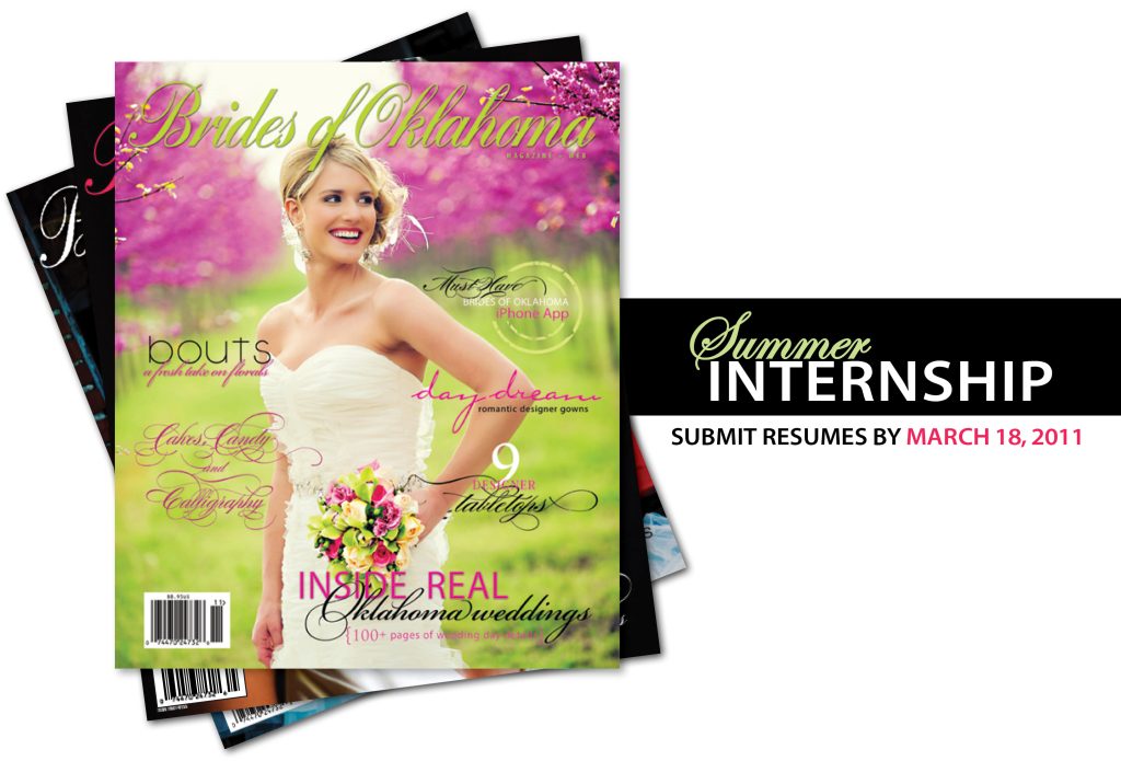 If you’re looking for a fun summer internship apply with us today! Brides of Oklahoma is looking for inspired individuals in a variety of positions to join our team. If you’re creative, dynamic and passionate, Brides of Oklahoma offers a fast-paced environment that is conducive to career growth. Interns are exposed to a wide variety of projects and responsibilities! This internship requires organized, self-motivated individuals full of creative ideas! Applicants must be a college student majoring in Graphic Design, Public Relations, Advertising, Communications, Marketing or a related field. Some knowledge of Adobe InDesign and Photoshop preferred. Please note that Brides of Oklahoma internships are unpaid and are designed for school credit. For consideration, please send your resume and availability to Alli Vaughan at [email protected] by this Friday, March 18, 2011!
