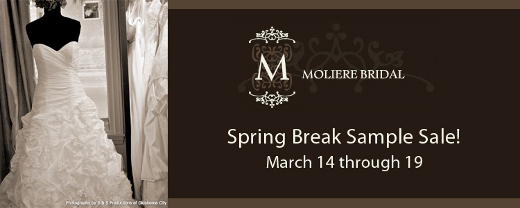 If you’re in the market for a gorgeous gown at a great price, stop into Moliere Bridal this week for their Spring Break Sample Sale! You’ll find tons of beautiful designs to choose from! The sale ends Saturday, March 19.