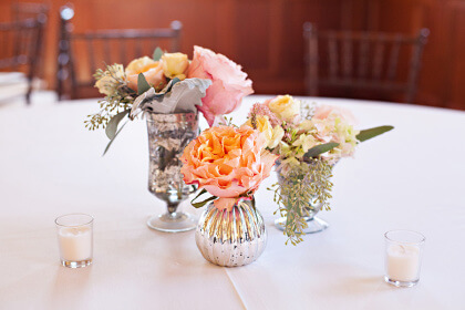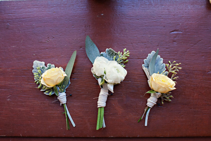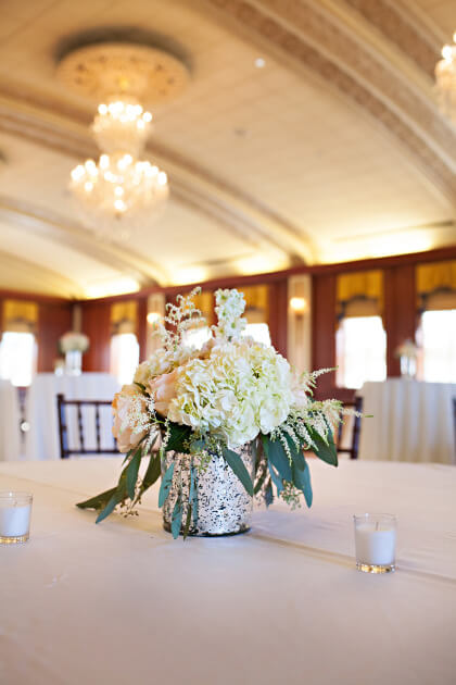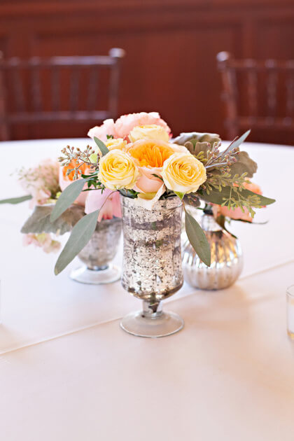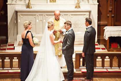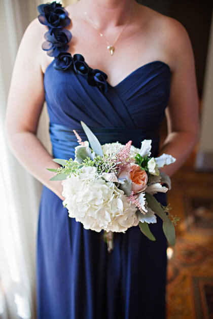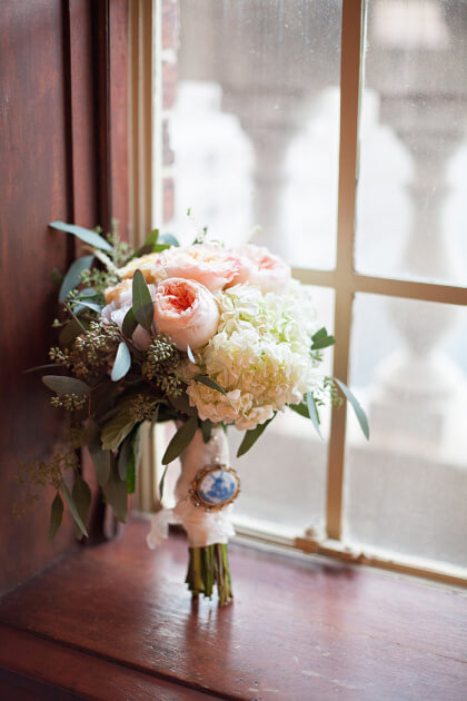 The two were married on October 4, 2014 at St. Paul’s Episcopal Cathedral. Sarah walked down the aisle in a beautiful gown with a lace appliqué bodice and a structured satin trumpet skirt accompanied by her father. She carried a romantic bouquet comprised of ivory floral with touches of greenery and hues of light peach. The stems were hand-tied and wrapped with a handkerchief from her grandmother and secured with a brooch from Sam’s grandmother.
