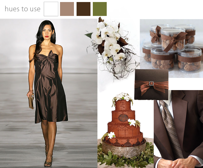 For all of the chocolate lovers out there, this board is for you! We absolutely love the sheen and swing of this Amsale bridesmaid dress from Miss Jackson’s in Tulsa, and what a perfect escort dressed a brown Sicilian-style suit from Tuxedo Junction in Oklahoma City. These bright white dainty orchids brighten up this palette and the tiny, birch branches gives the bouquet a modern yet rustic feel. Invite in style with a monochromatic theme like these custom invites from TA Designs. And, definitely savor dessert. Opt for an uncharacteristic but yummy chocolate wedding cake like this creation from Mishelle Handy Cakes and consider sharing your grandma’s favorite fudge recipe with your guests as favors! Enjoy!