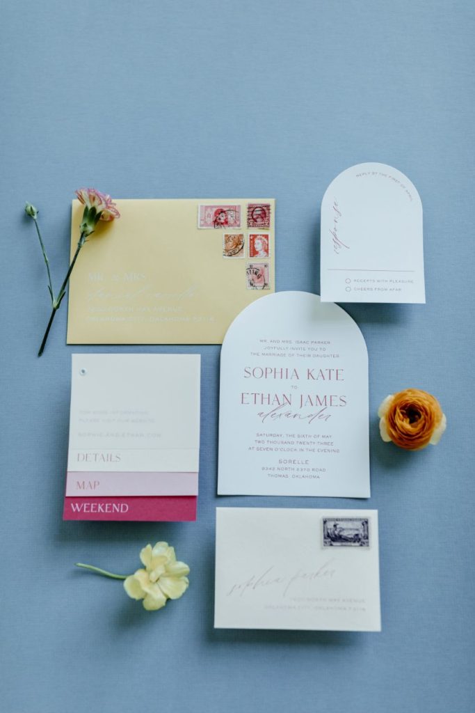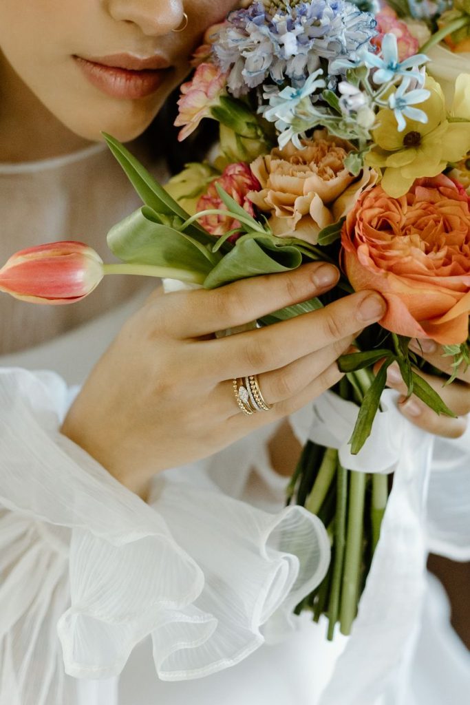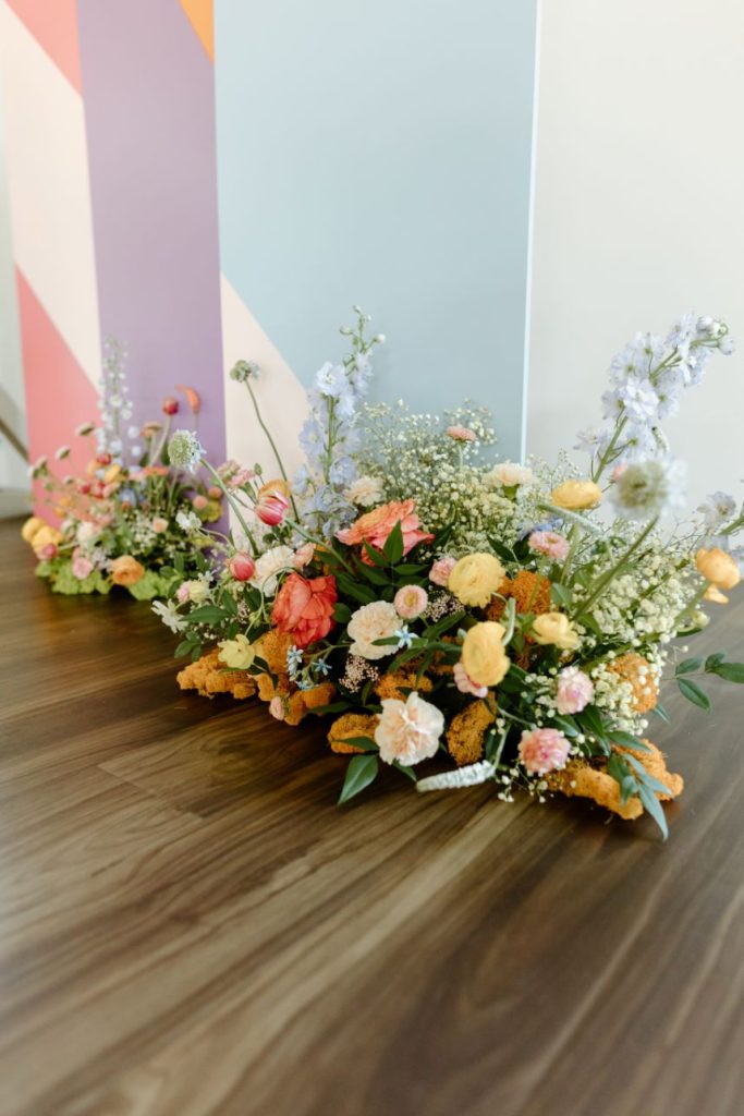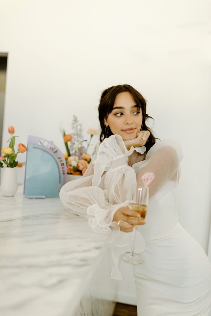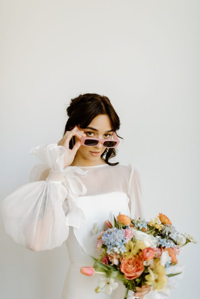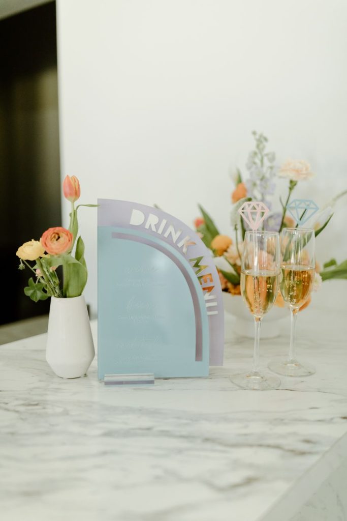 We simply can’t get enough of geometric gems and pretty pastel palettes this season, and these colorful elements happen to be plentiful in this whimsical wedding editorial captured by A.W. Photography Inc. The editorial shows off a fun side to Sorelle – The Meadow on Deer Creek where lovers of modern whimsy and artful brides alike can find so much wedding inspiration throughout this gallery. A sense of elevated elegance plays hand-in-hand with subtle pastel details from the geometric, colorblock invitations by Paper + More to florals from Kasse Duffy Designs arranged in a myriad of cheerful blooms. Champagne served from a wall by Wooden Hearts Boutique wouldn’t be the same without gem stir sticks to tie it all back in with arched, minimalist signage. Plus we can’t decide which is more mouth-watering – these geometric gem cookies from Royal Cookie Co. or the rock from Kelley Jewelers gracing our bride’s finger as she reaches for the treats! Her gown from Chantilly Bridal Studio was just as jaw-dropping and features a sheer crushed organza neckline that makes its way into delicate puffed shoulders and a ruffled bishop sleeve. Keeping your bridal glam simple is the new way to make a big statement and Carolyn F. Beauty understood the assignment with dewy, natural makeup while Hayley Hall Hair styled her half-up, half-down with some face-framing pieces and braided textures that popped with her dark hair. Add some funky geometric hoops in chic gold or fun rosewater pink sunnies like the ones our model wears down below and your look is complete! This whimsical wedding inspiration is totally in your element, and we love its geometric gem accents. Fall in love with more from the gallery down below. Cheers!