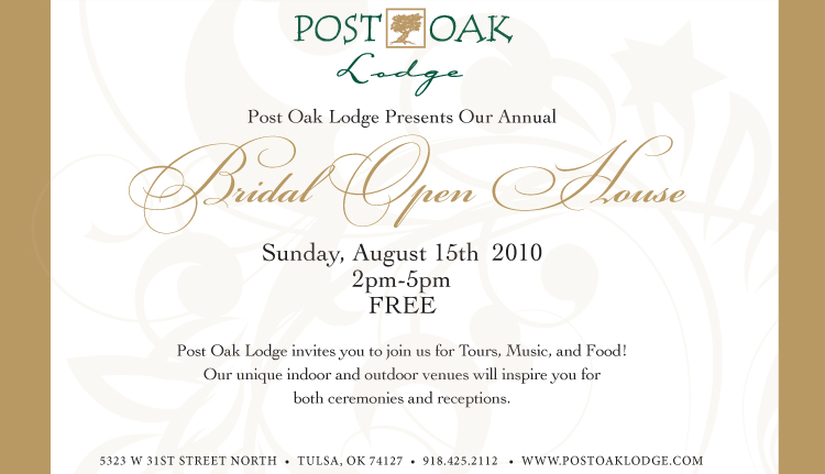 Don’t miss the free Bridal Open House happening at Post Oak Lodge on August 15 from 2-5 p.m.! It has breathtaking views of Tulsa’s Osage Hills and offers a selection of beautiful indoor and outdoor venues. Post Oak Lodge is the perfect spot for your ceremony and reception; this is your chance to check it out! Be sure to stop by to enjoy tours, music and food! For more information, visit their website. Enjoy!