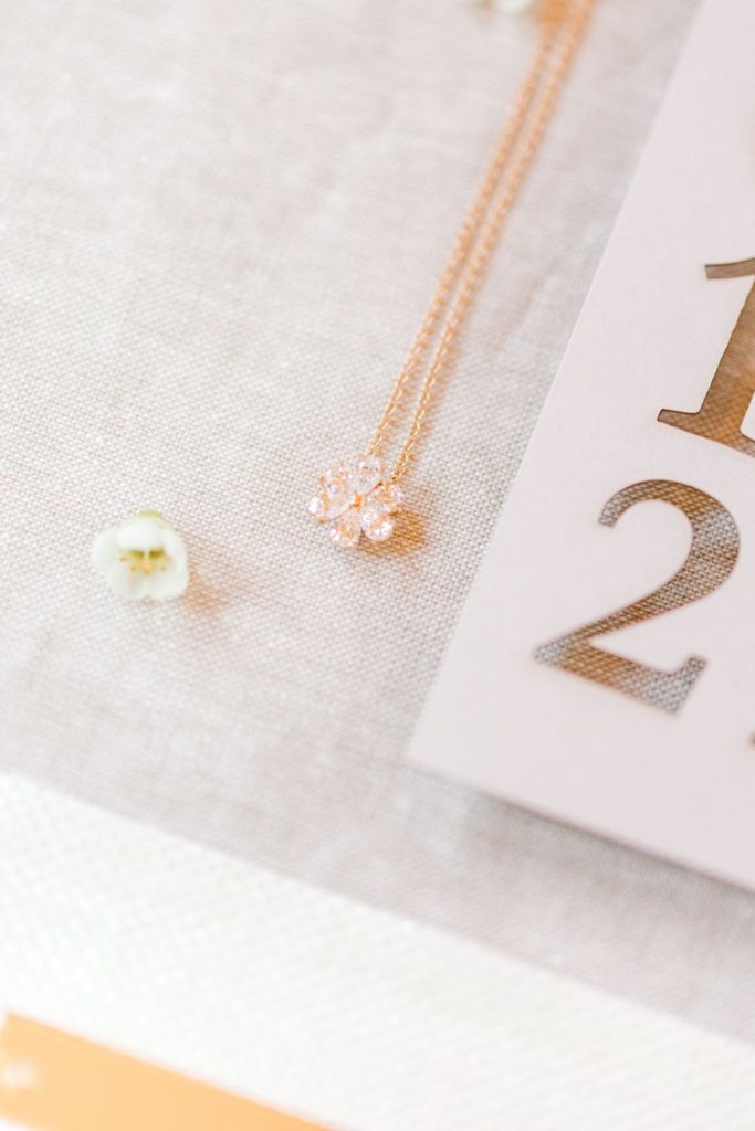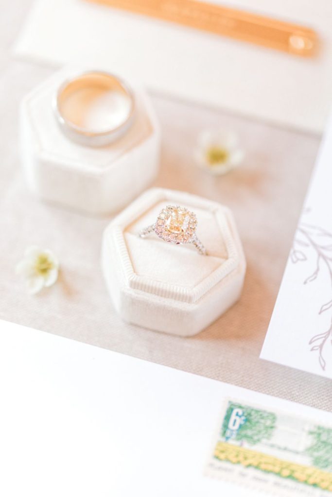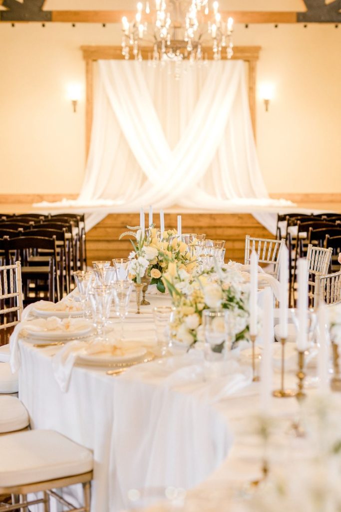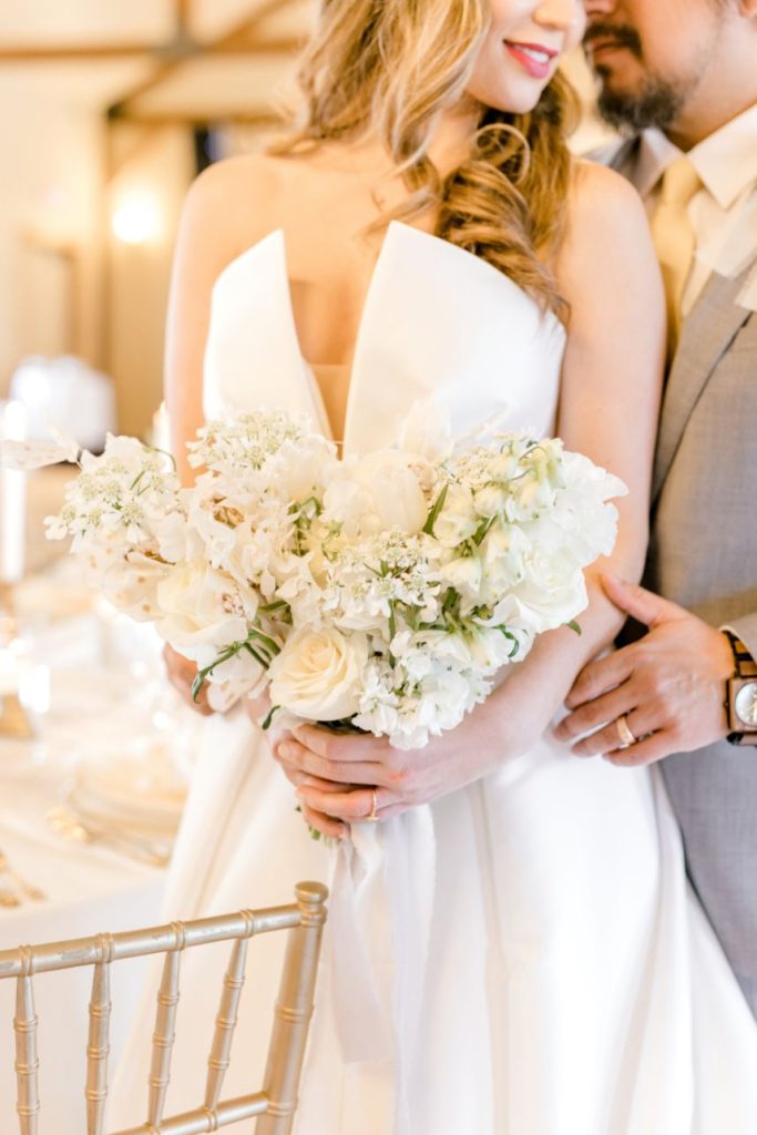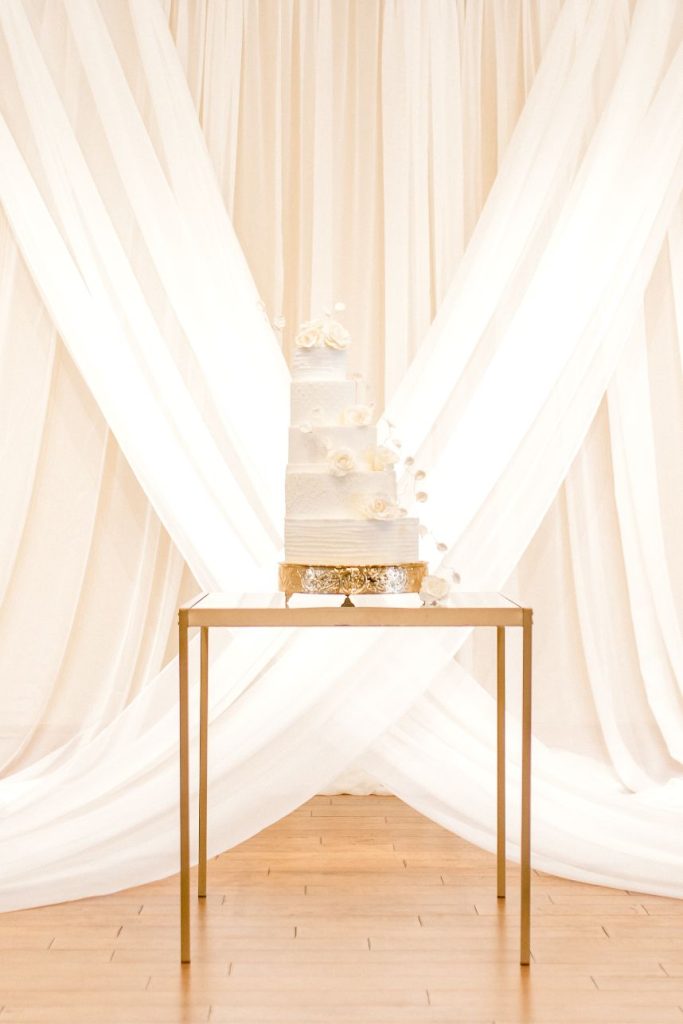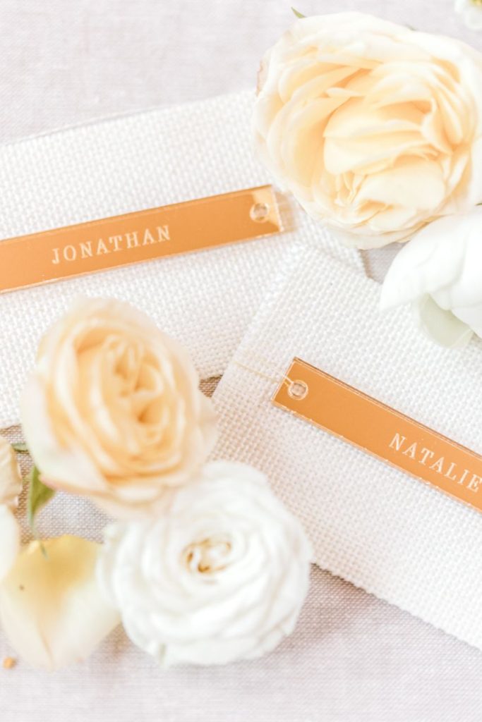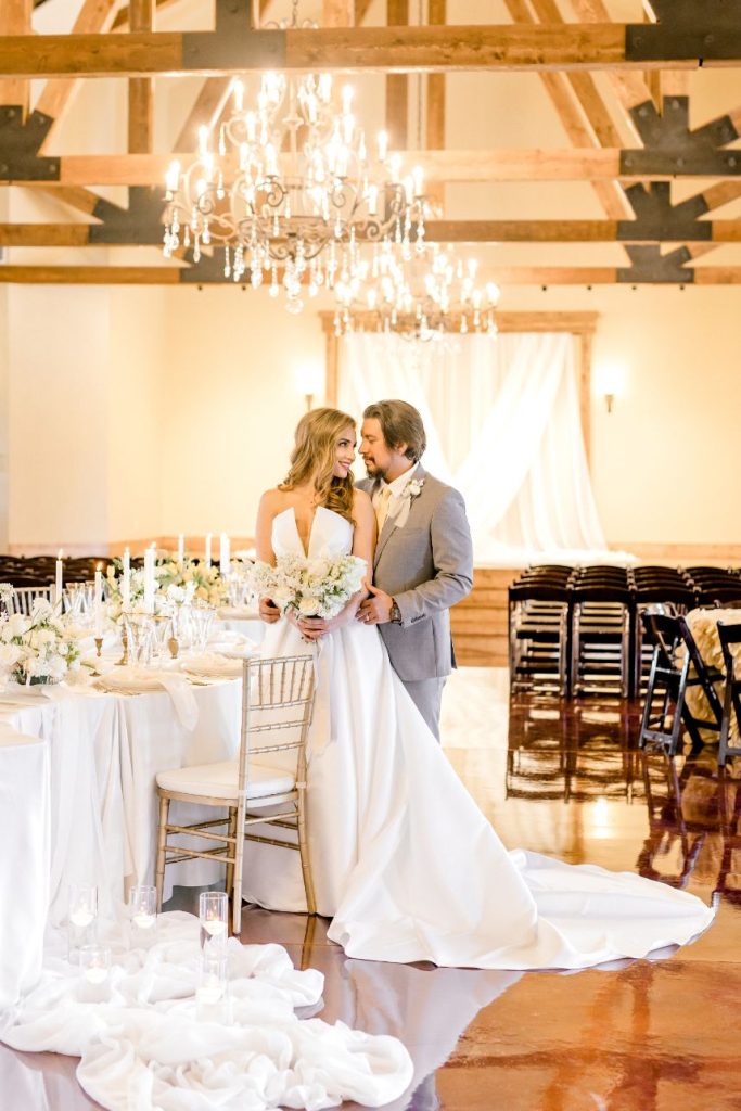 This gilded gold wedding inspiration captured by Meg Rose Photography is so full of breathtaking elegance that has our hearts swooning! White linens create an absolutely heavenly atmosphere inside the spacious barn of Eleven Oaks Ranch. In the lofty barn setting, twisting and turning tablescapes are adorned with gold chiavari chairs from Party Pro Rents, opulent crystal and gilded antique décor from Scavenged Vintage Rentals – all right on point with the elegant vibe. Peachy floral centerpieces perfectly complement the whimsical blush and peach invitation suite from The Letter Box on pastel paperie that also stylishly directs guests to their reception seating. Sips and sweets in this styled shoot are both so fun to look at! We can’t take our eyes off this asymmetrical wedding cake designed with five towering, left-aligned tiers. This bride and groom were both dressed to stun, with the bride in a strapless V-wire gown. Meanwhile, the groom dons a taupe suit and pale ochre tie from EVERYMAN. Both were fitted with gorgeous fine jewelry from BC Clark Jewelers including a radiant ring this bride rocks so well! Find all the gilded gold wedding inspiration you could ever want in the captivating gallery from Meg Rose Photography down below. Cheers!