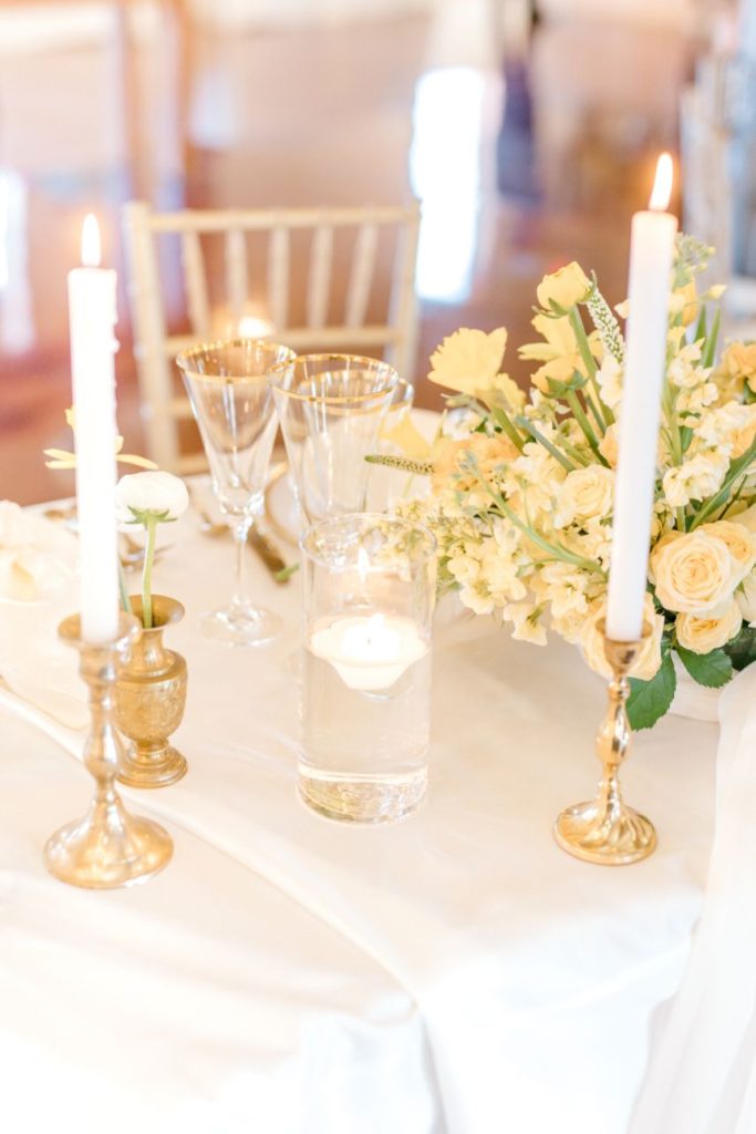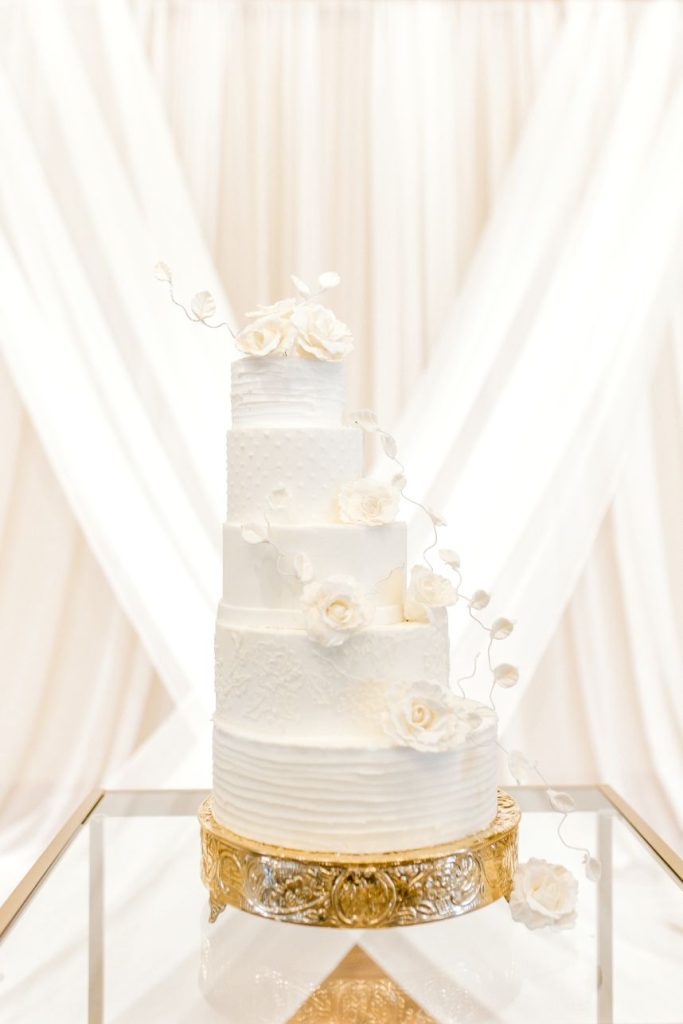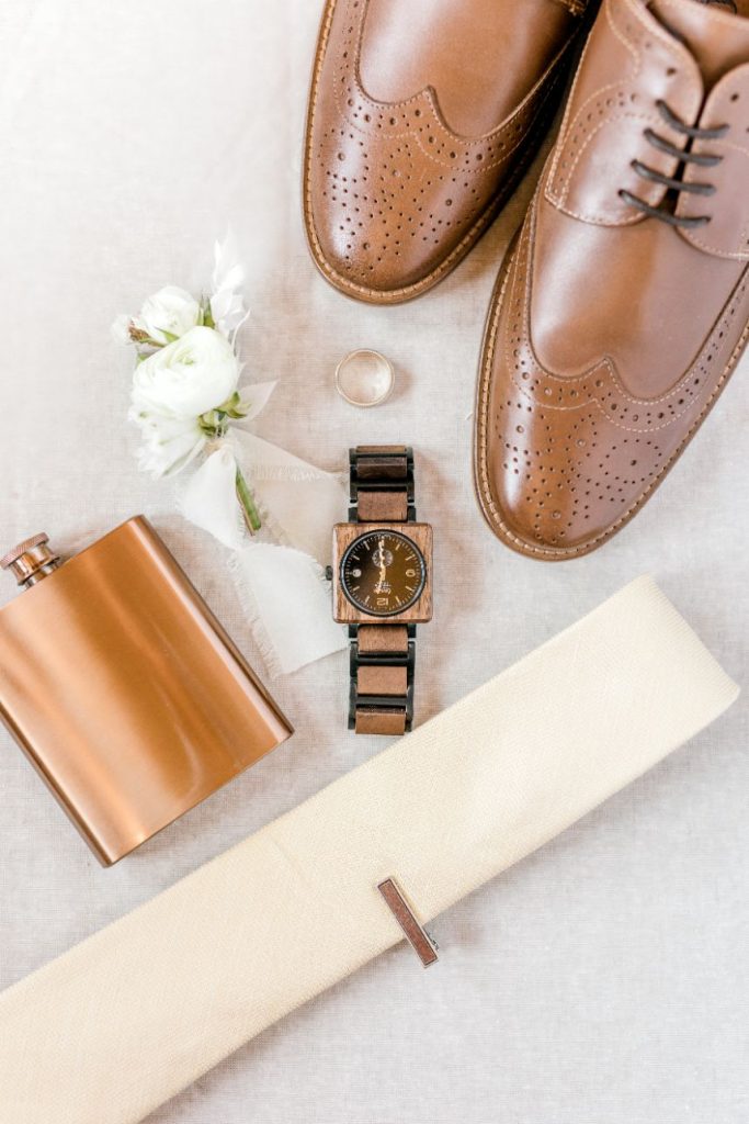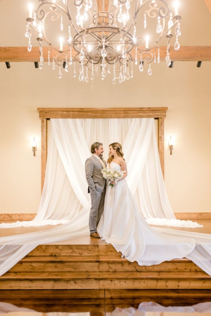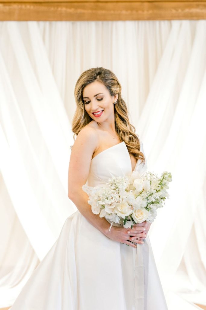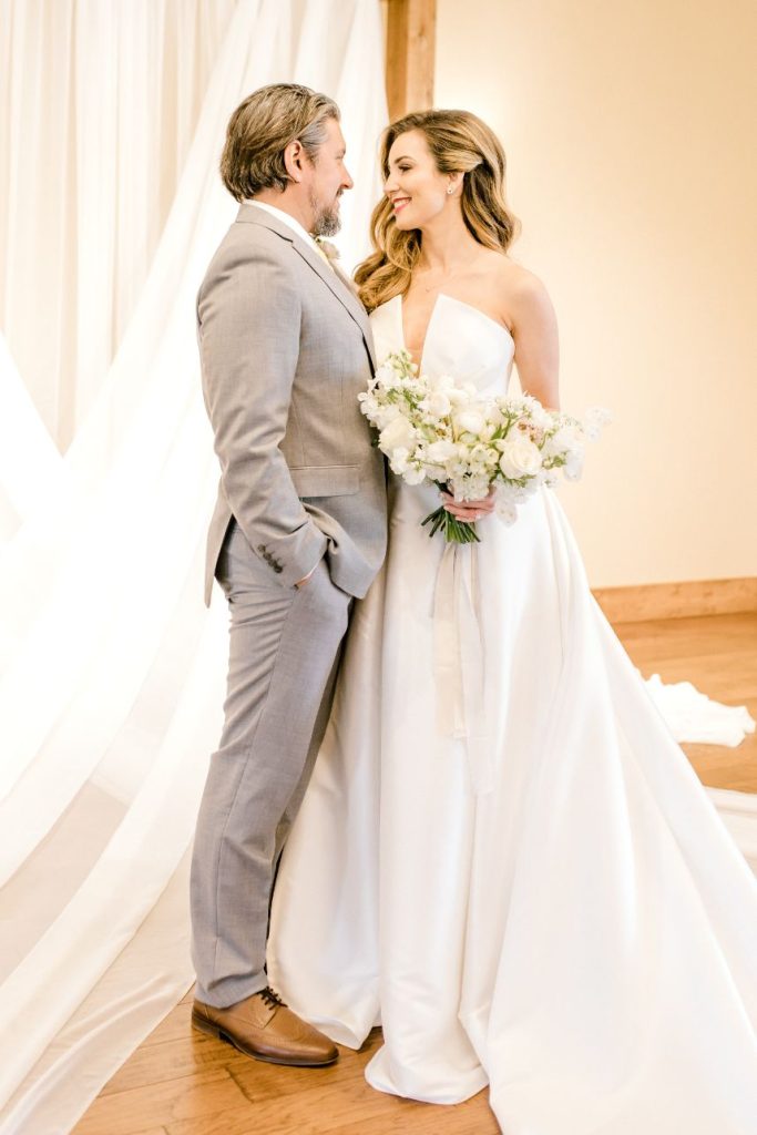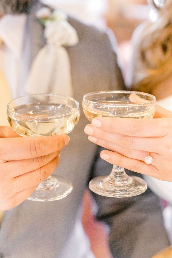 This gilded gold wedding inspiration captured by Meg Rose Photography is so full of breathtaking elegance that has our hearts swooning! White linens create an absolutely heavenly atmosphere inside the spacious barn of Eleven Oaks Ranch. In the lofty barn setting, twisting and turning tablescapes are adorned with gold chiavari chairs from Party Pro Rents, opulent crystal and gilded antique décor from Scavenged Vintage Rentals – all right on point with the elegant vibe. Peachy floral centerpieces perfectly complement the whimsical blush and peach invitation suite from The Letter Box on pastel paperie that also stylishly directs guests to their reception seating. Sips and sweets in this styled shoot are both so fun to look at! We can’t take our eyes off this asymmetrical wedding cake designed with five towering, left-aligned tiers. This bride and groom were both dressed to stun, with the bride in a strapless V-wire gown. Meanwhile, the groom dons a taupe suit and pale ochre tie from EVERYMAN. Both were fitted with gorgeous fine jewelry from BC Clark Jewelers including a radiant ring this bride rocks so well! Find all the gilded gold wedding inspiration you could ever want in the captivating gallery from Meg Rose Photography down below. Cheers!