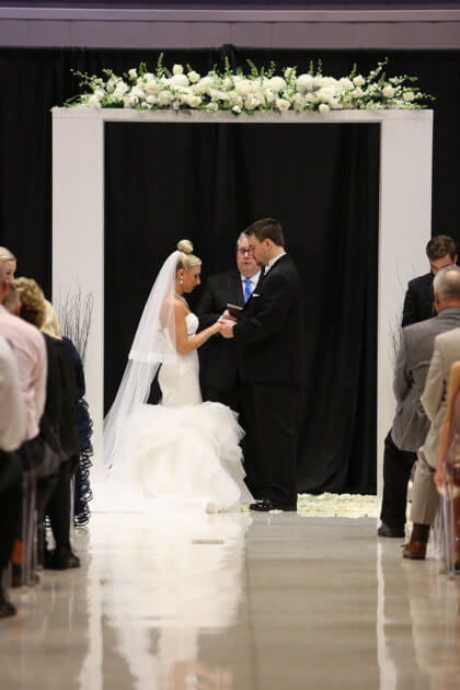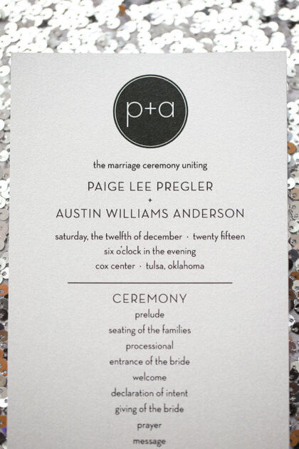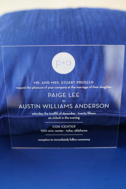 Paige Lee Pregler and Austin Williams Anderson were married on December 12, 2015, at the Cox Business Center in Tulsa. Paige’s father escorted her down the long, elegant aisle lined with lucite ghost chairs, exactly as she had envisioned. She was breathtaking in her Hayley Paige dress and beautiful jeweled statement necklace from Tesori Bridal. The bride carried a beautiful arrangement of peonies handcrafted exactly as she wanted by Art in Bloom. Paige and Austin were blessed to share their special day with 250 of their family and closest friends.