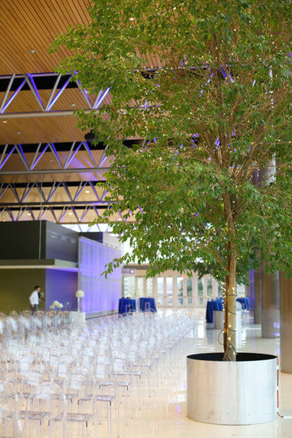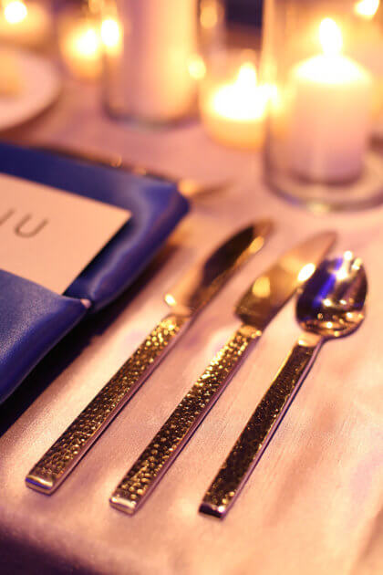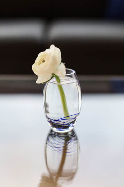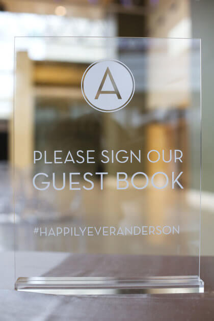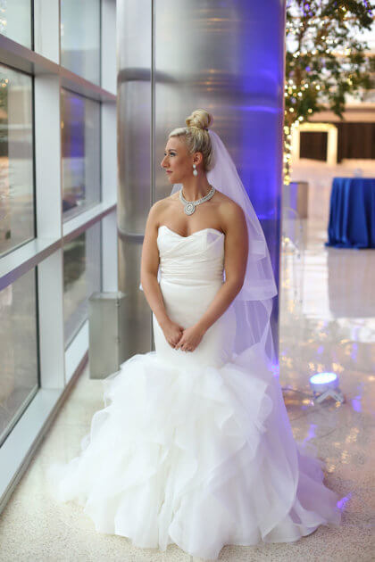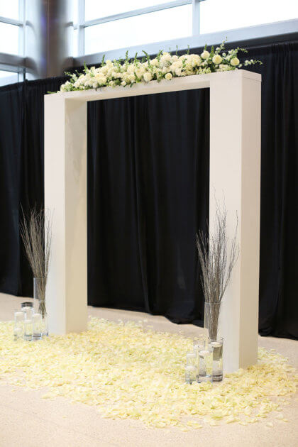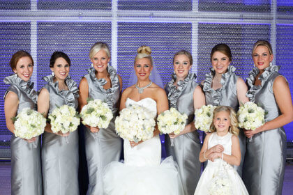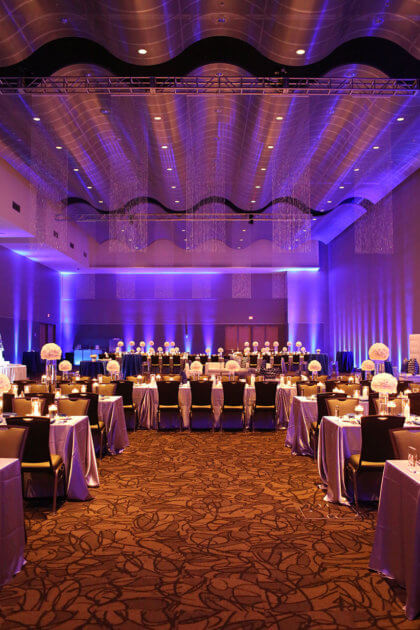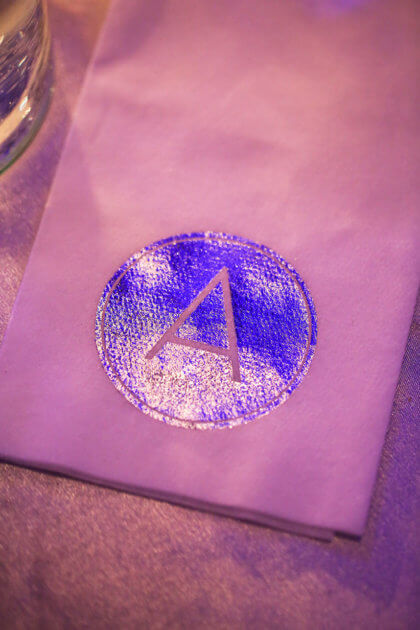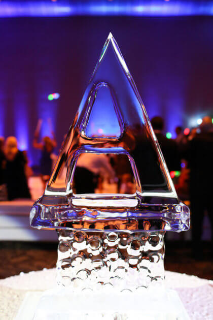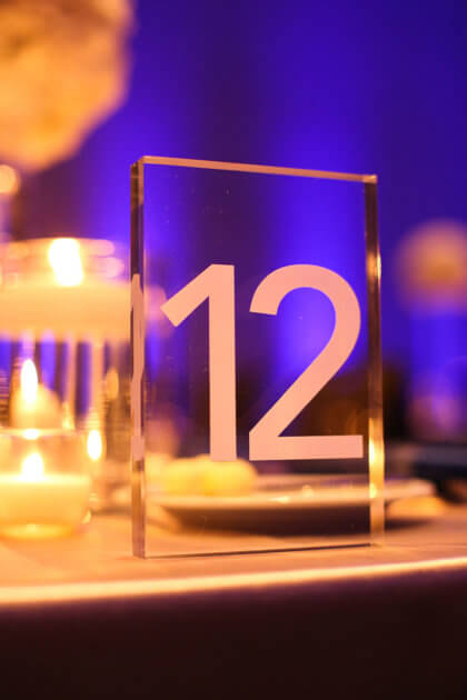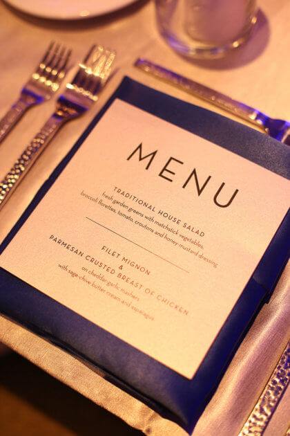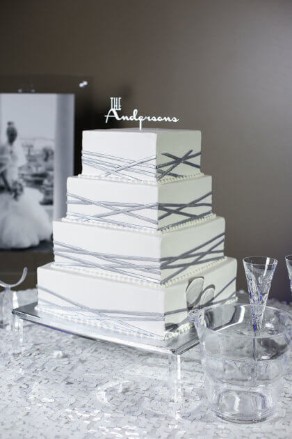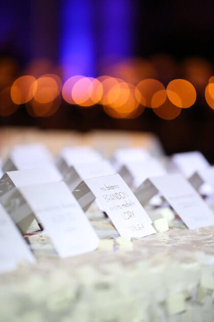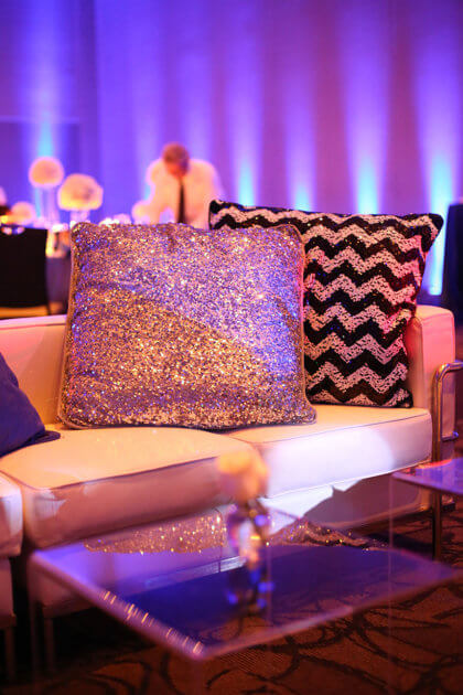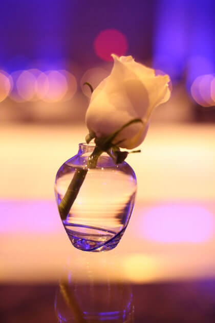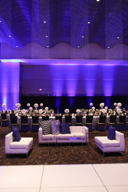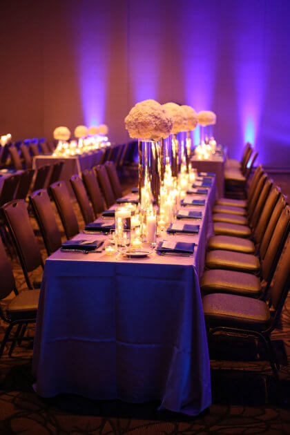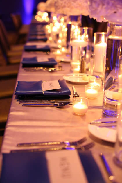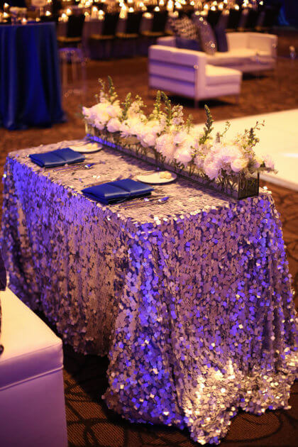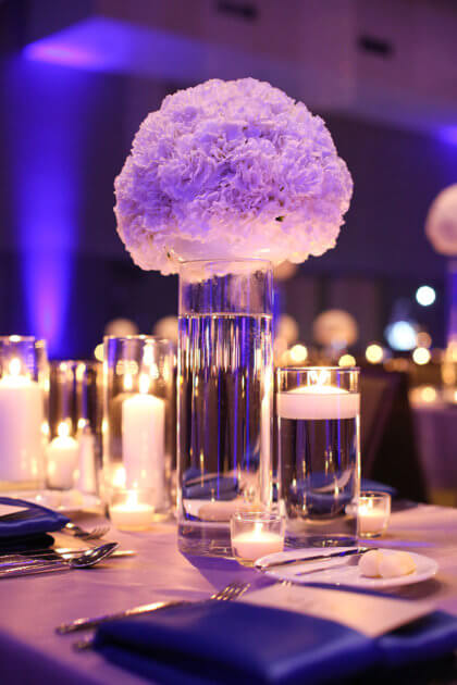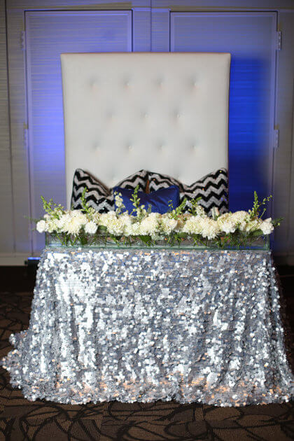 Following the ceremony, the couple joined their guests in the stunning ballroom. Hues of royal blue, white, silver and black were beautifully portrayed throughout the room with the ultimate modern touch. From the elegant “A” ice sculpture, to the romantic yet eclectic table settings of floating candles and flower balls, to the romantic sweetheart table and the sleek, white dance floor it was a dream come true.