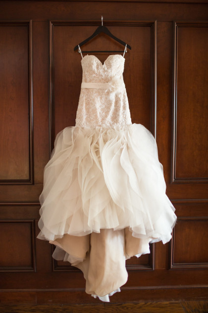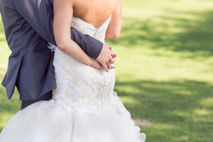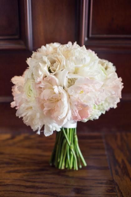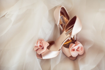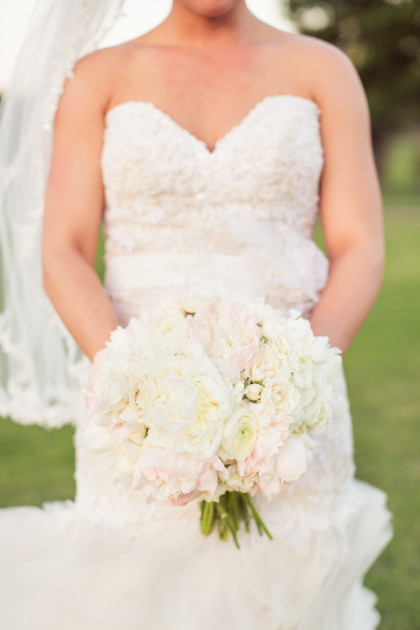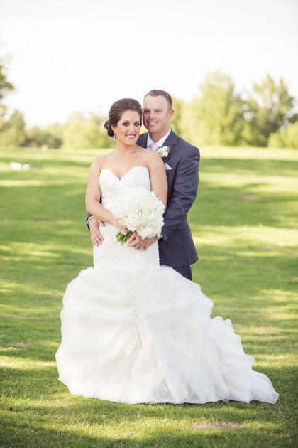 On May 10, 2014, Jacqueline Michelle Smauder married James Jarrett Morrison at the Tulsa Country Club in Tulsa. The ceremony was officiated by Gator Thompson and coordinated by Sharon Holm. Mark Bruner and Shelby Eicher played the guitar and fiddle throughout the ceremony. Phil Smauder, the bride’s father, escorted Jacque down the aisle in a gown she designed herself. It was a beautiful ivory and champagne strapless fit-and-flare gown with a full lace bodice embellished with crystals and pearls, and a sweetheart neckline with a full silk organza ruffled skirt. The lace from her bodice matched the lace trim on her veil. The belt was made of satin, lace, silk, floral pieces and feathers. Jacque wore a pair of silver crystal drop earrings, her mother’s pearl bracelet and diamond ring. The bridal bouquet was a simple mix of blush and white peonies. It perfectly matched her blush pink Badgley Mischka peep toe d’orsay heels with ruffles at the toe. Layers of soft laser-cut silk petals created a modern ruffle accent, perfect for Jacque’s big day.