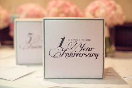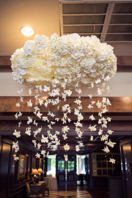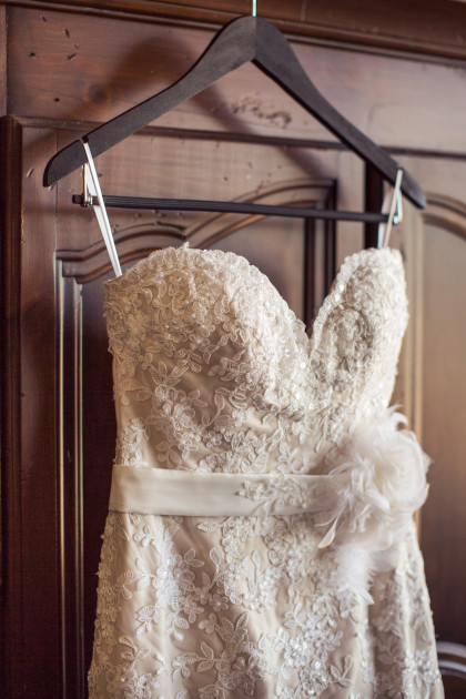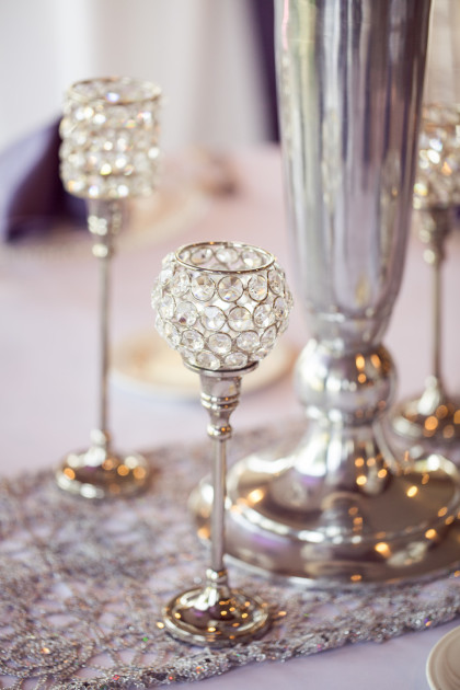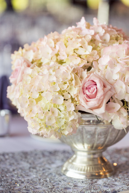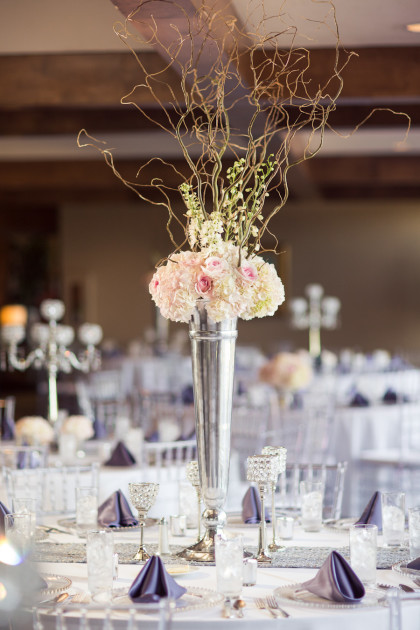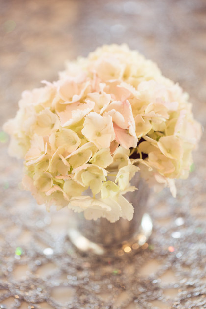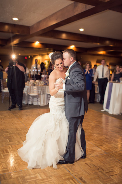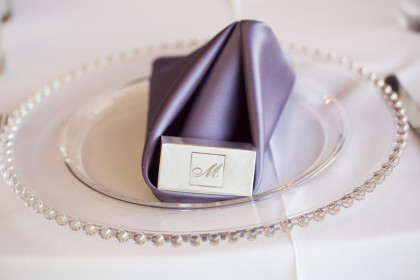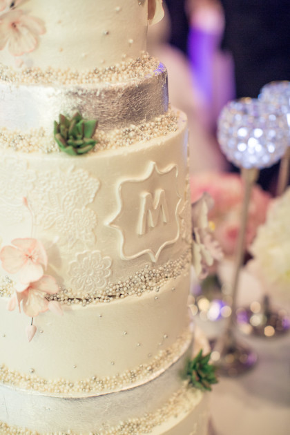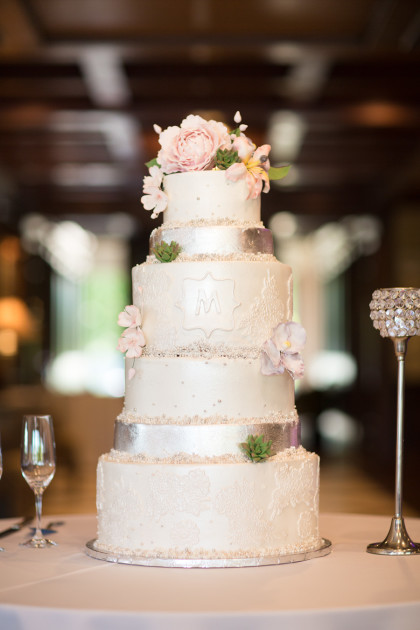 The indoor venue was perfect for the stylish wedding with dark-wooded exposed beams and beige walls. A sea of circular tables draped in white filled the room. At each table, a tall silver centerpiece, either an elegant flute of white and blush pink flowers or silver candlesticks, rested in the middle on top of a shimmering silver table runner. They also had short floral centerpieces in addition to the candelabras and tall floral centerpieces. Tables with the candelabras also had three small floral arrangements at the base to ensure every table had flowers. At each place setting sat silver boxes of chocolates adorned with an “M” for guests to enjoy. Jacque chose a white and silver, six-tier cake with floral and lace accents. In lieu of a cake topper, a large blush pink flower was used and a simple white “M” emblem was placed on the fourth tier. Around the cake table, strands of white orchids were hung from the ceiling, adding a delicate and romantic feeling to the room. A personal touch was added to the evening with pink and lavender napkins with “Jacque & Jarrett” fun facts printed on them. Even though the couple took a first look before the ceremony, they stuck to tradition at the reception. Toward the end of the night, the couple cut the cake and Jacque’s father gave a father-of-the-bride toast. Jarrett even retrieved Jacque’s garter under all that organza!