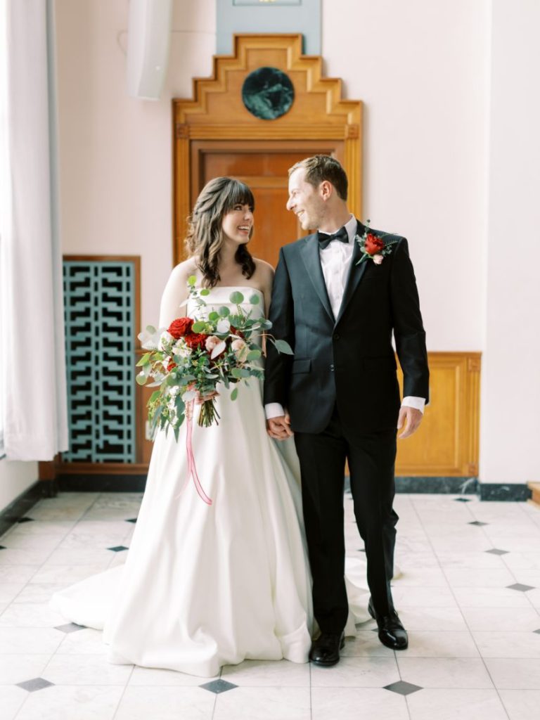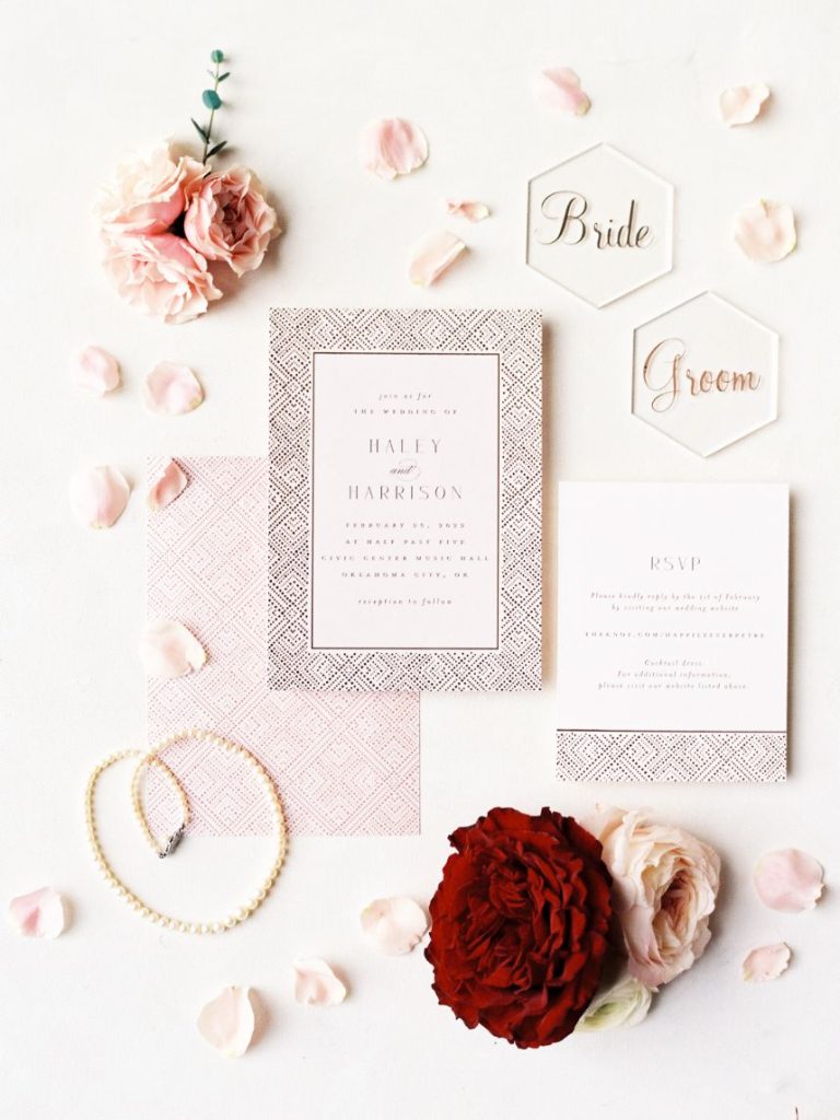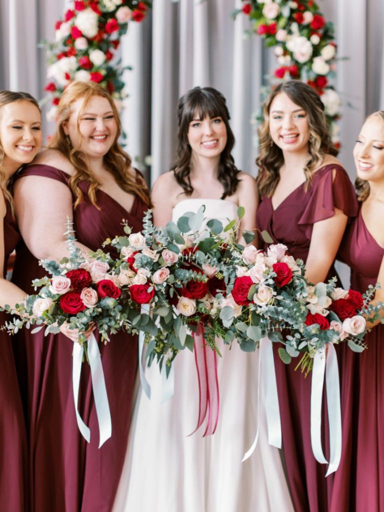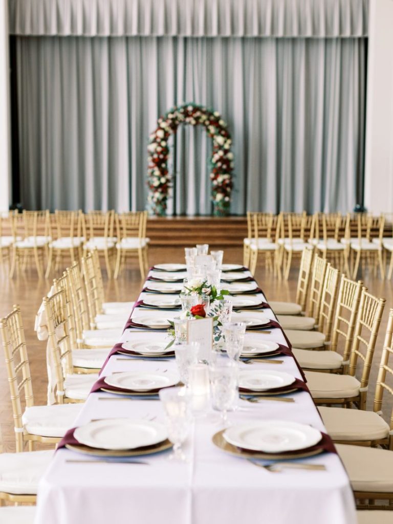 Timeless and oh so romantic, Haley and Harrison’s blissful burgundy wedding at the Civic Center Music Hall is breathtakingly beautiful! Haley and Harrison met while attending Oklahoma Christian University. However, it wasn’t until 2021 till their paths crossed again, reconnecting the two. Harrison mainly worked in North Dakota at the time but lived in Tulsa, while Haley lived in Edmond. One week while Harrison was back in Oklahoma, he asked Haley on a date. Harrison drove three hours round trip just to take Haley to dinner. Talk about modern chivalry! On the way to dinner in November of 2021, Harrison suggested the two walk around Scissortail Park before their dinner reservation. As the sun set, Harrison got down on one knee and surprised Haley with her dream ring from BC Clark Jewelers. Of course, Haley said, “yes,” and the couple began planning their fairytale wedding with Harper Mae Events.