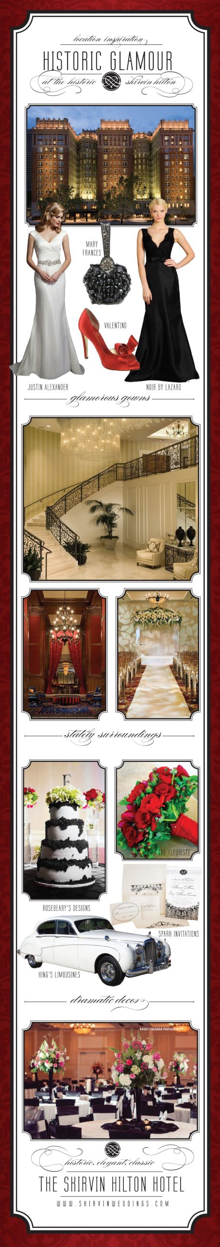 As soon as you step foot into the beautiful Skirvin Hilton hotel in downtown Oklahoma City, you are greeted by a glamorous setting rich with history! You’ll find stunning historical elements with all the modern amenities! There are several spaces within the hotel to hold your soiree so finding a spot to meet your needs should be a breeze. And such a glamourous setting calls for a glamorous look! This stunning gown from Justin Alexander found locally at Moliere Bridal, BeLoved Bridal and J.J. Kelly Bridal, will achieve just that! Your maids will look chic in Noir by Lazaro found at J.J. Kelly Bridal and for the perfect accessories try this Mary Frances clutch and red Valentino pumps for a pop of color. Invite in style with these gorgeous black and white invites from Spark Invitations available at Chirps and Cheers and Paper Girl. We love the dramatic detailing on this gorgeous cake from Rosebeary’s Designs and you can’t go wrong with a gorgeous red bouquet like this lovely arrangement from The Fleuriste. Fill the grand ballroom with tall centerpieces like these from Designs by Tammy and black and white chair covers like these from Marianne’s Rentals for Special Events for a dramatic effect like this picture captured by Randy Coleman Photography. After an evening of glam, you’ll want to make a grand exit and this vintage limo from King’s Limousine is the perfect getaway car! Cheers!