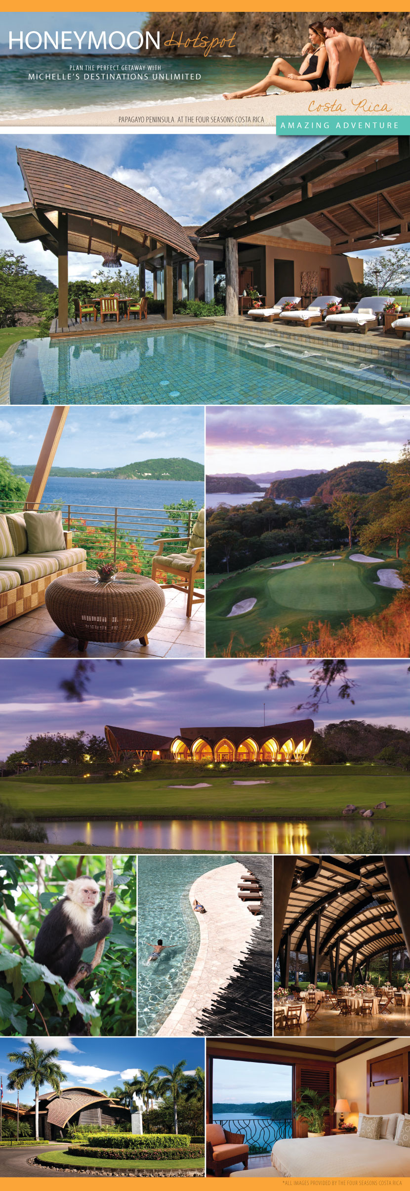 After a whirlwind of wedding excitement, you and your hubby will be winging your way to the destination of your dreams for a getaway you’ll never forget! If you’re still deciding where to go and what do, we’ve asked travel expert Michelle Carbone of Michelle’s Destinations Unlimited to dish on some of her favorite honeymoon hotspots! Today we’re featuring an destination perfect for a couple seeking an adrenal rush! Costa Rica offers zip lines, volcanoes, hot springs and white water rafting just to name a few adventurous activities found in this tropical setting. After a day of excitement, enjoy luxury accommodations on the Papagayo Peninsula at the Four Seasons Costa Rica! This scenic oasis is the picture-perfect getaway! Find out more about this fabulous location and other unique options by contacting Michelle’s Destinations Unlimited! Happy travels!