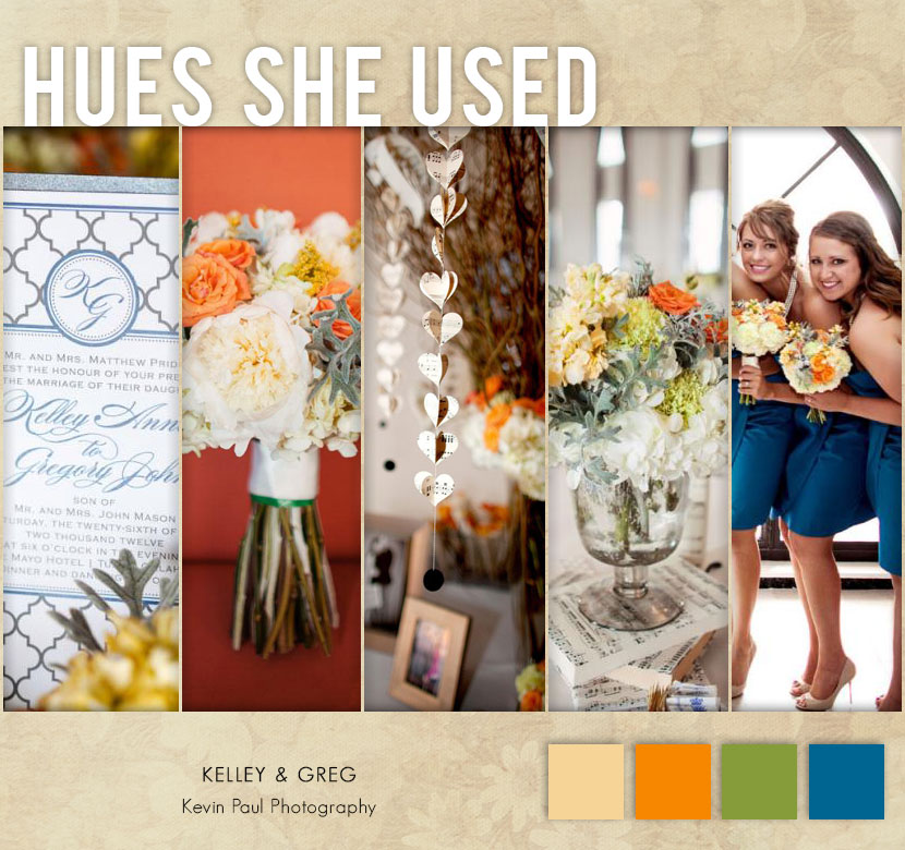 Fresh bold colors are on trend for weddings this season, and we love Kelley and Greg’s bright pops of orange used throughout their wedding décor and floral! This strong hue is complemented beautifully with the olive green and muted blue. Combined with the art deco pattern and sweet sheet music details, this makes for one fabulous wedding! See more from Kelley and Greg’s wedding and others on our Real Weddings page of our website! Happy Planning!