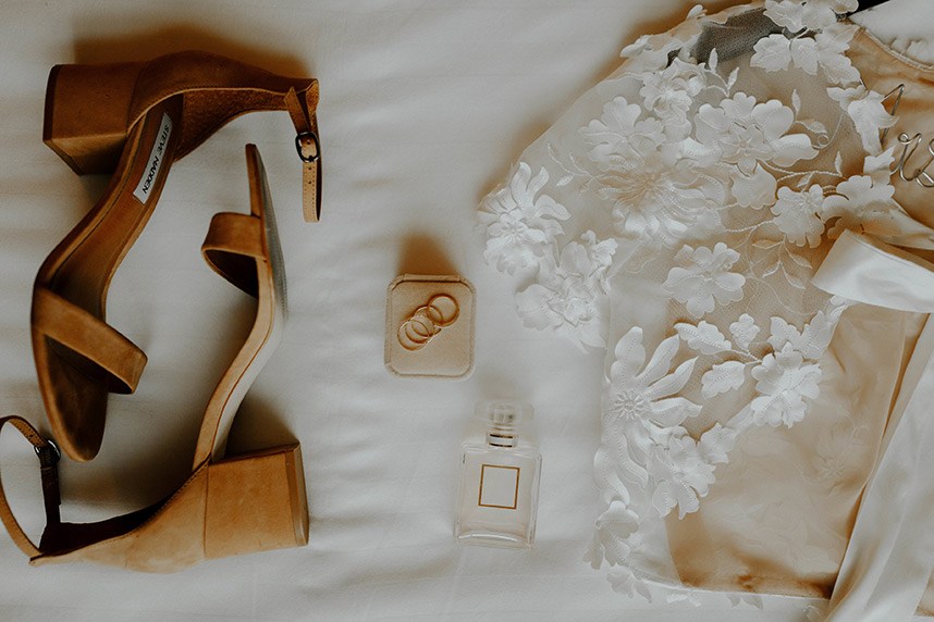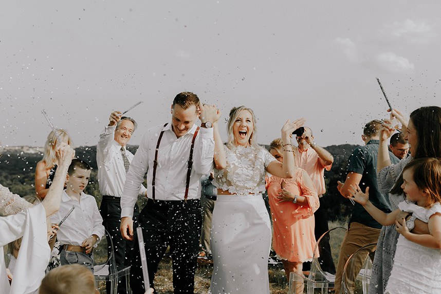 On September 2nd, 2017, the rain cooled everything off and made for the best weather. We girls had brunch, champagne and got ready together – lots of laughs, hugs and a few happy tears. The boys had BBQ and beer and practiced their aim by shooting guns. When we all came together, I walked down the aisle to an acoustic version of “Can’t Help Falling in Love” By Elvis Presley. My dad gave me away asking for ’40 bushels of corn, two show ponies and a field dressed deer.’ A friend officiated the wedding; it was sweet and intimate, and we had everything we wanted.”