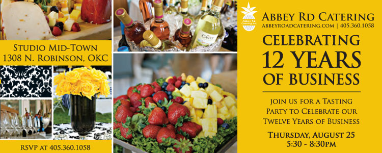 It’s that time of the year again! Abbey Road Catering would like to invite you to come and help celebrate their 12th birthday Thursday August 25th from 5:30 – 8:00 p.m. at their Midtown Studio location 1138 N. Robinson in OKC (look for the big blue door). Come and be greeted with a glass of champagne and taste some new and seasonal items! RSVP by calling (405) 360-1058.