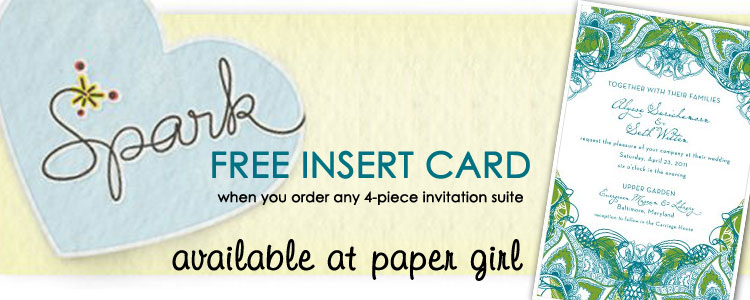 Looking for the perfect invites? Check out this awesome deal from Paper Girl! Get a free insert card when you order any four piece invitation suite from Spark! Offer ends October 31, 2011.