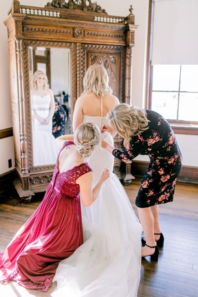 From the bride about her favorite memory: “My mom and sister helped me get into my wedding dress, which was really neat because a couple of years before I helped my sister get into her wedding dress, so it was fun to be on the other side!”
