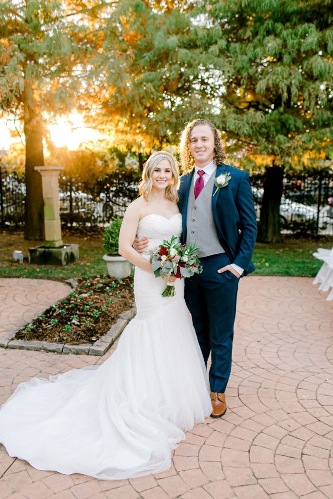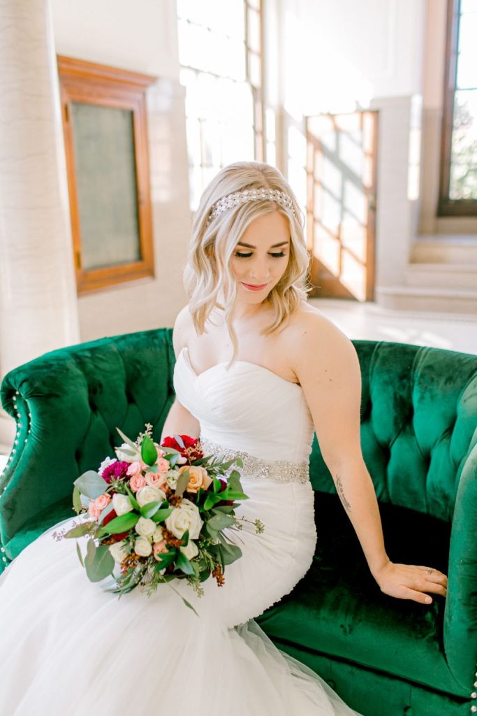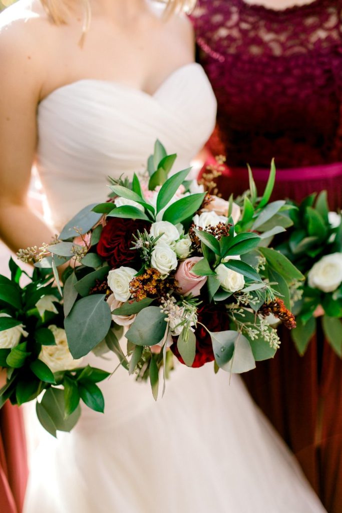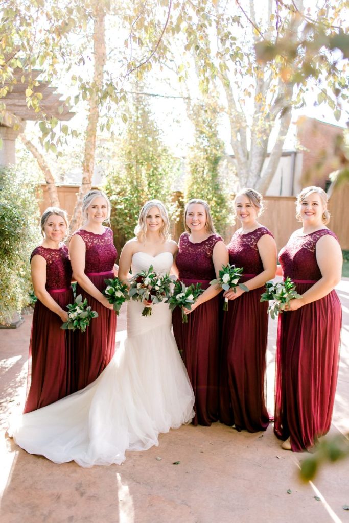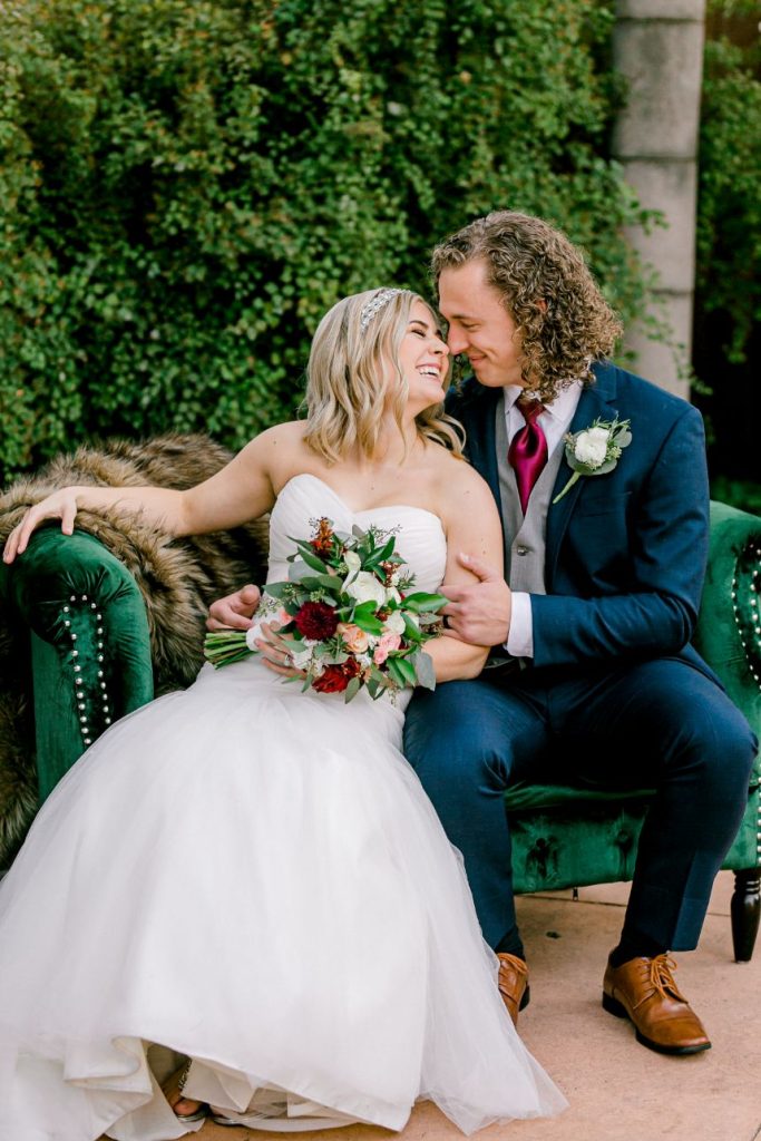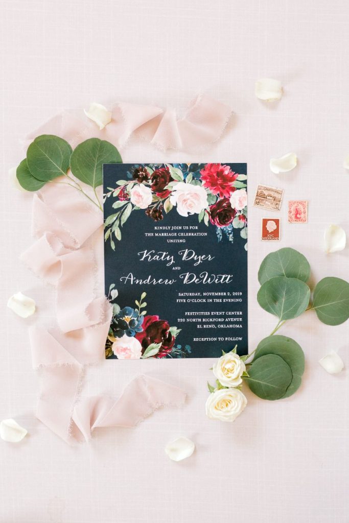 This simple yet elegant jewel toned wedding is a must-see for the bride who wants her own bright and bold colored wedding day! Jewel tones are the latest trendy color palette for any wedding style, and this celebration at Festivities Event Center is full of them. Simple, yet elegant in the most beautiful way perfectly captures the essence of Katy and Andrew’s sweet day. Deep maroon, blush and ivory florals bursting with greenery from Tony Foss Flowers brought in light colors to contrast navy blue, wine and jade green dark jewel tones. Thanks to the amazing work of Emily Nicole Photo, we get to get to scroll through this stunning wedding gallery over and over again. If we’re having a jewel toned celebration, you can bet we’re taking ALL the inspiration from this wedding! Cheers to the DeWitts!