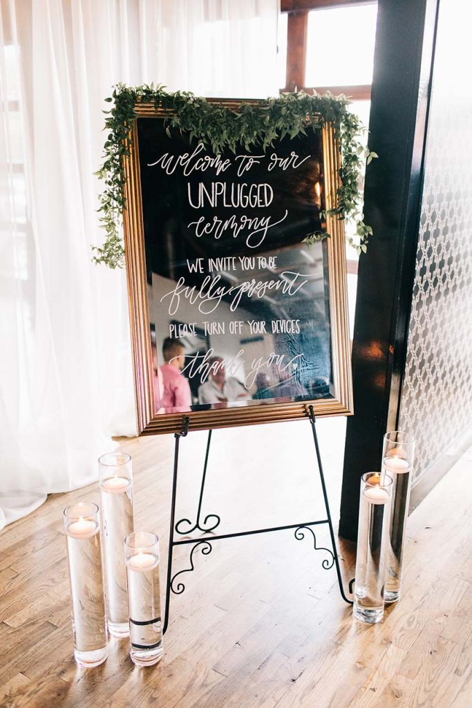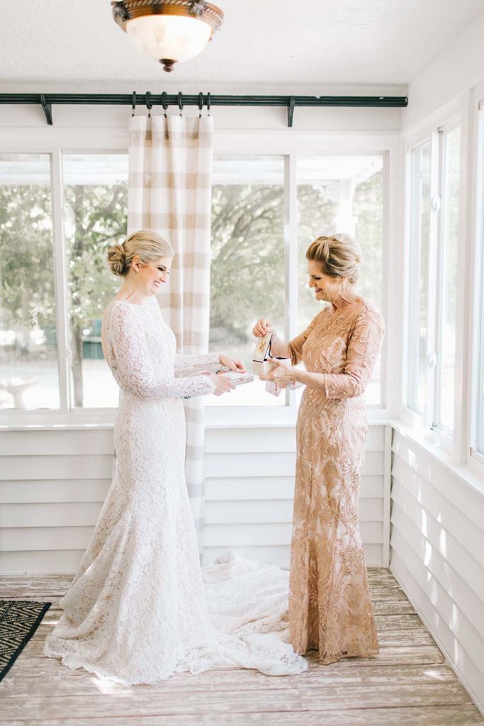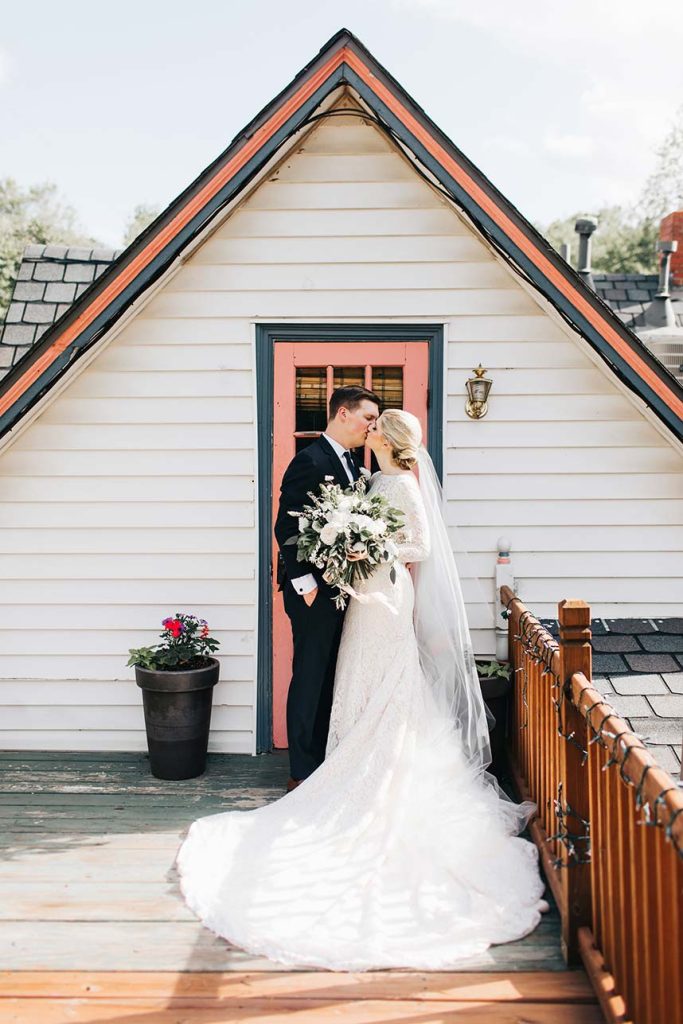 Escorted down the aisle by her mother, the bride wore a breathtaking long-sleeve lace gown with an open back and sweeping tulle veil by Jenny Voo and Hayley Paige. “I absolutely loved the back of my dress and the train. Before I went shopping, I kept saying I didn’t want anything too ‘stunner.’ But when I tried my dress on and saw how the back was so incredible, I immediately started crying,” Julie says. The ceremony reflected the personalities of the bride and groom. They had done marriage counseling with their officiant before the wedding, so he knew them well and articulated little personal stories throughout the ceremony. After exchanging rings and traditional vows, Jared kissed his beautiful bride, and they led the wedding party back up the aisle to an evening full of lively celebration.